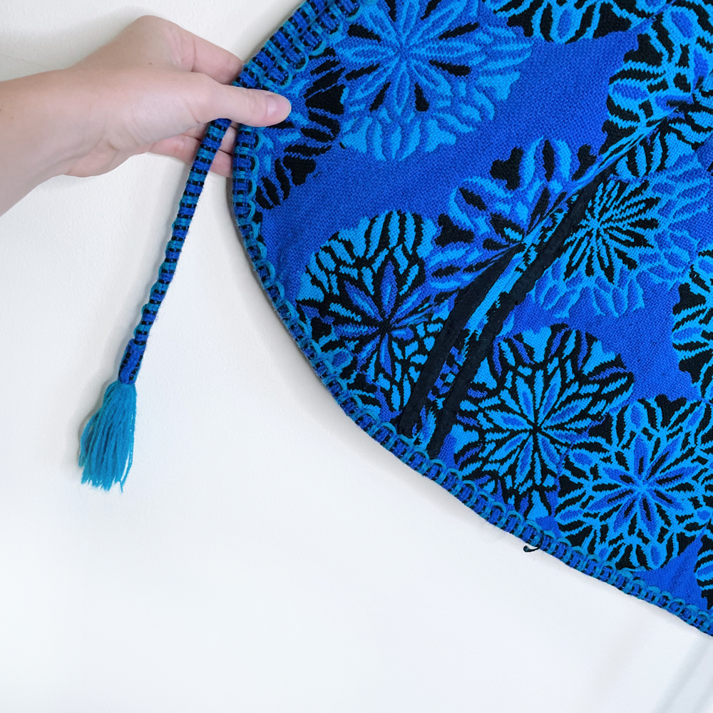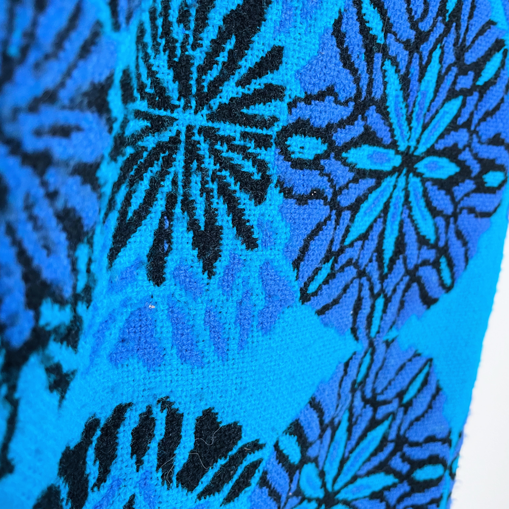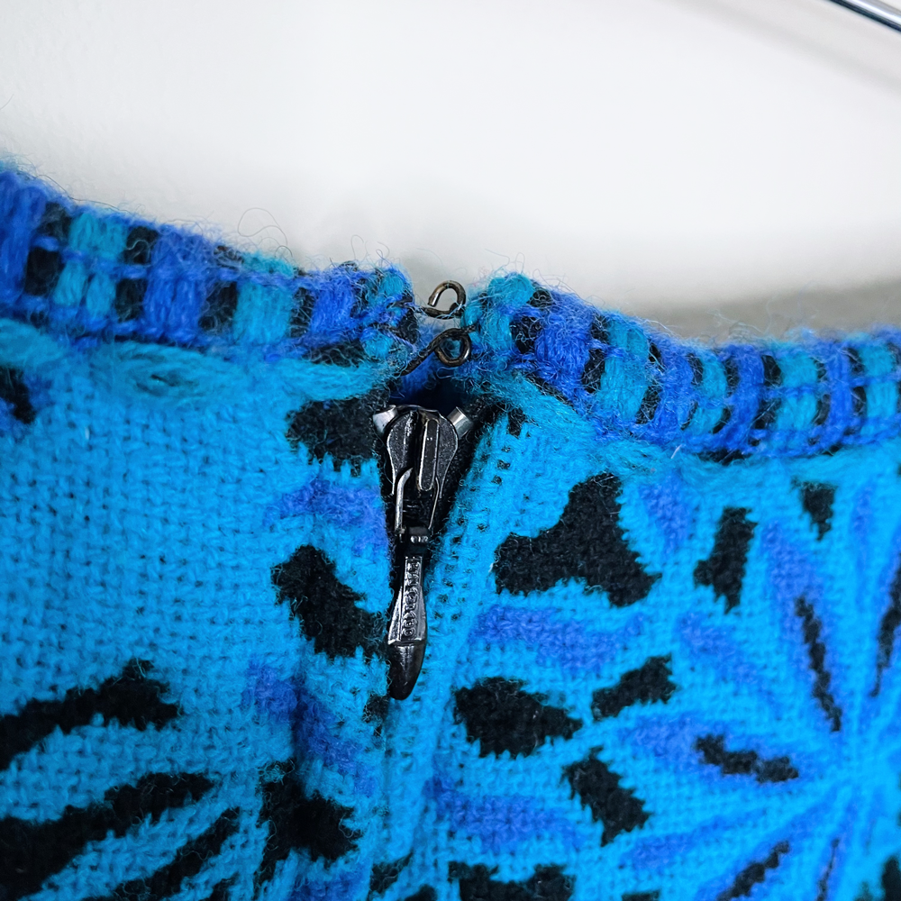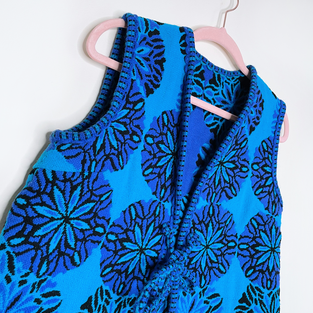 Item Description: This fabulously coordinated vest and midi skirt set is straight outta the 60's/70s, with a flower woven pattern in an eclectic blue. The top has a blanket stitch edging and tassel tie closure, and the skirt has a zipper closure and is lined with a mid-length. No content tag.