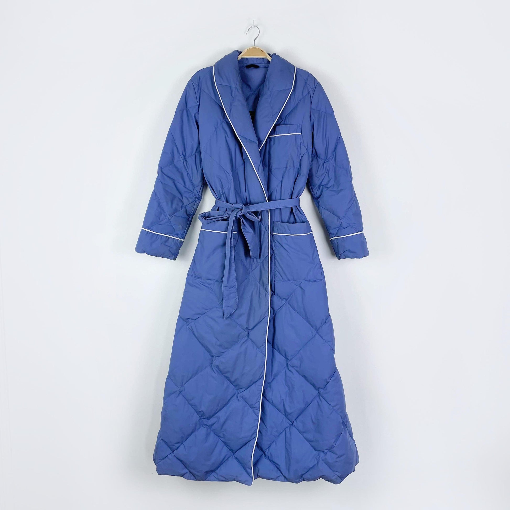 Item description: This retro housecoat style coat from Eddie Bauer features a quilted diamond shell, with an open front and tie belt closure. Contrast piping to the lavender blue tops it all off with perfection. For indoor or outdoor use, there are no rules! Shell: 65% polyester 35% cotton Fill: goose down