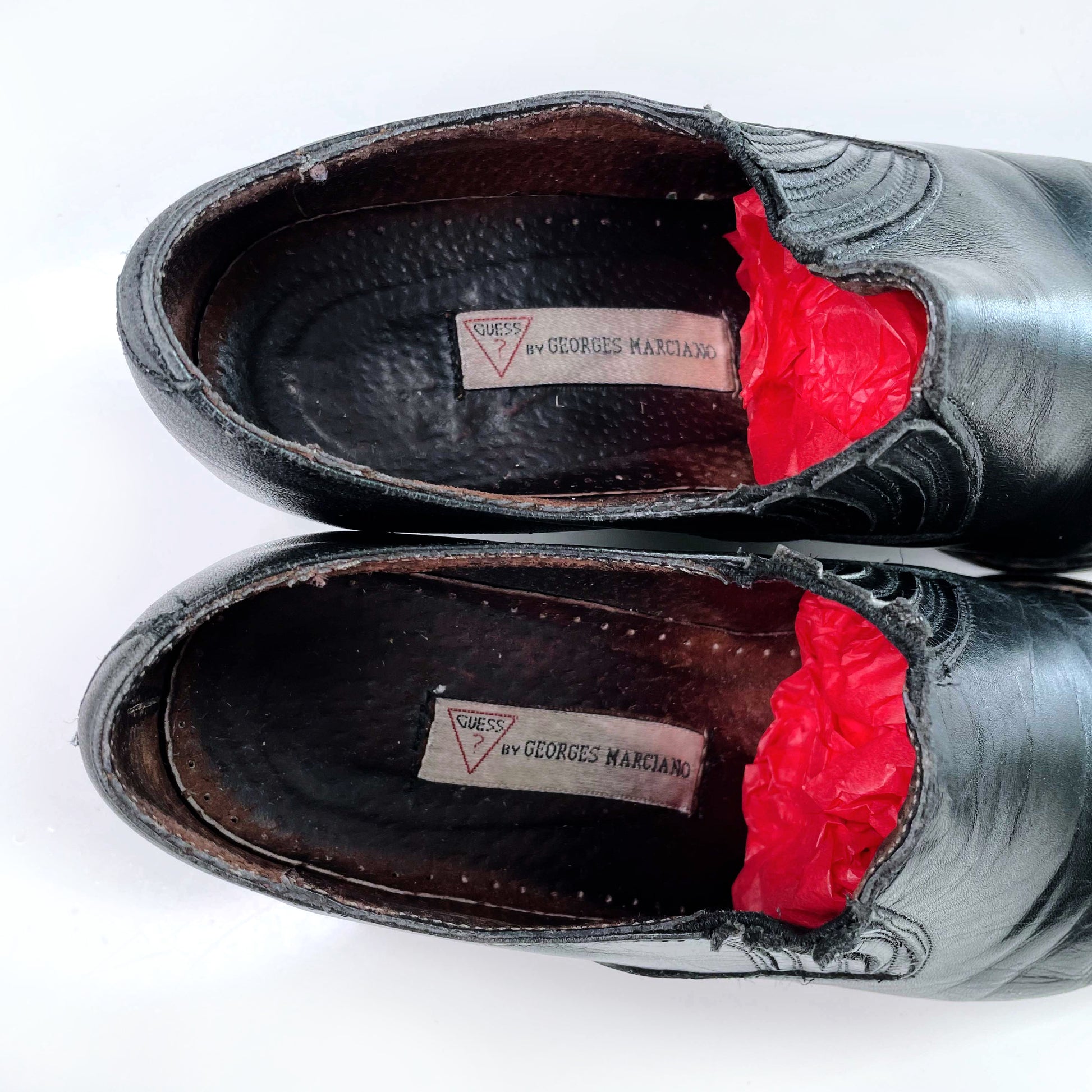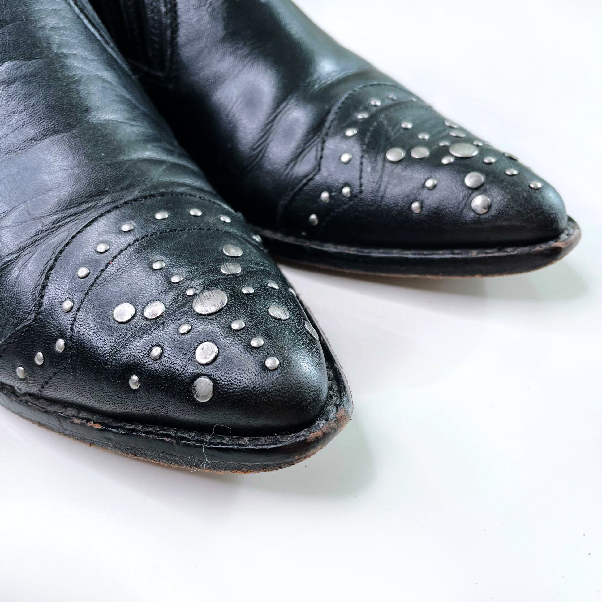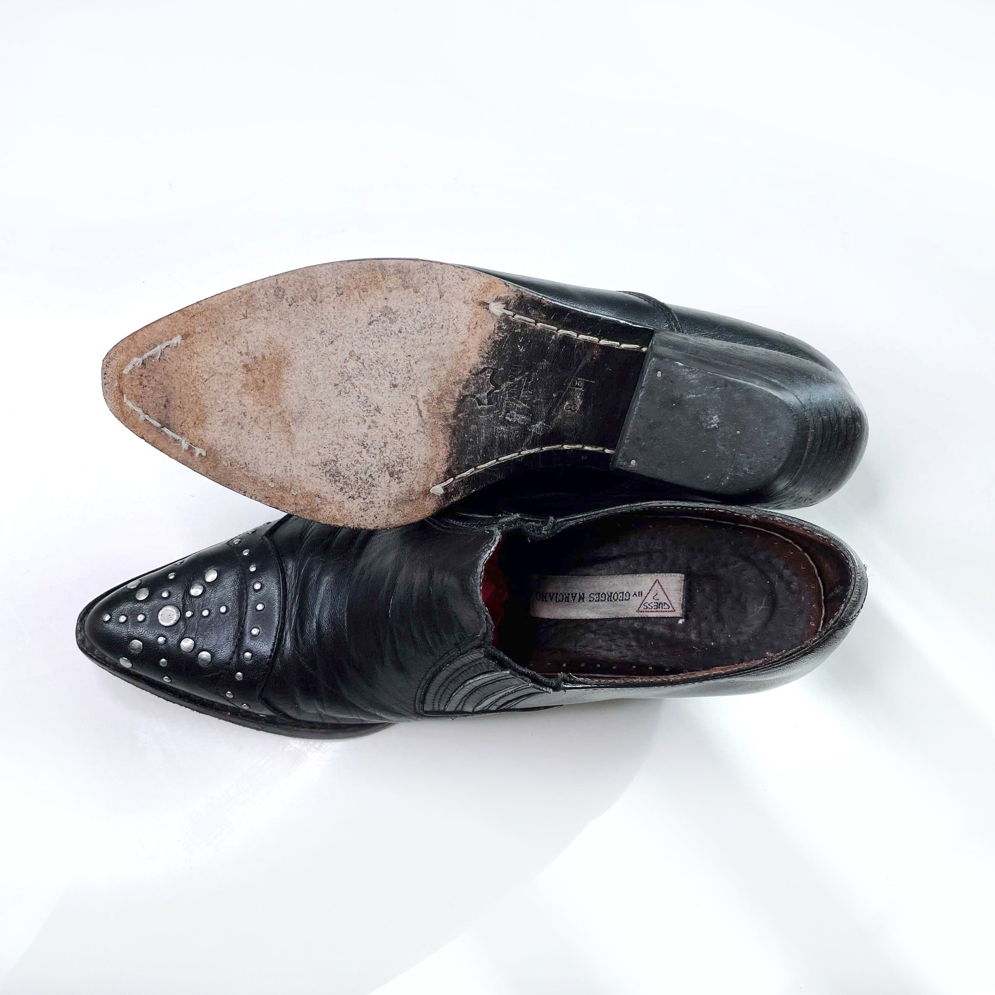 Item Description: These original 90's Guess USA ankle boots have all the western vibes you're looking for. Soft, worn-in leather shell is complete with silver studded toes.