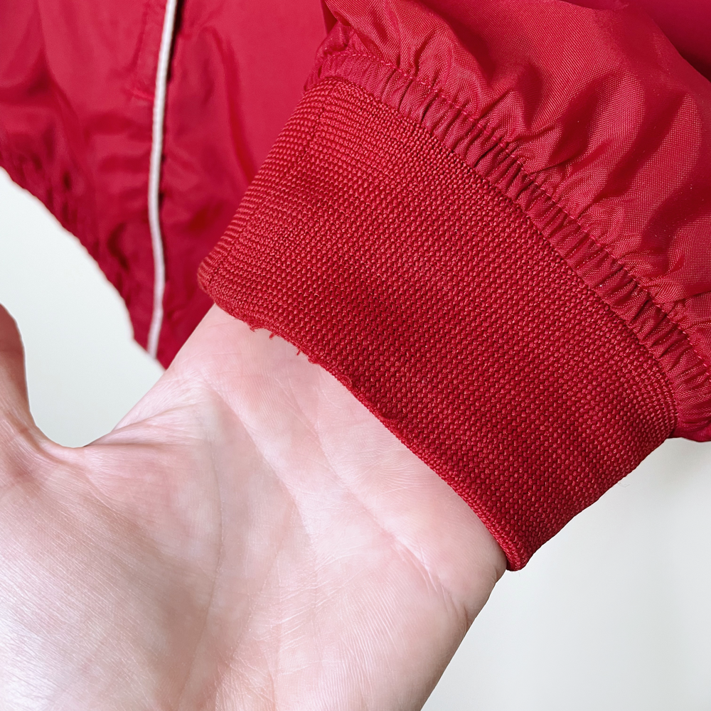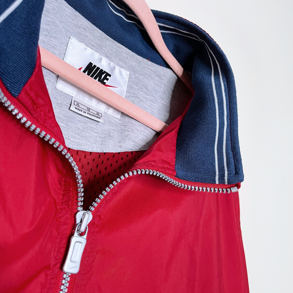 Item Description: A great y2k find, this red pullover windbreaker from Nike features the full NIKE logo in all caps beside the small swoosh, with a colour block blue band across the chest, knit cuff and varsity stripe collar with a mesh lining.