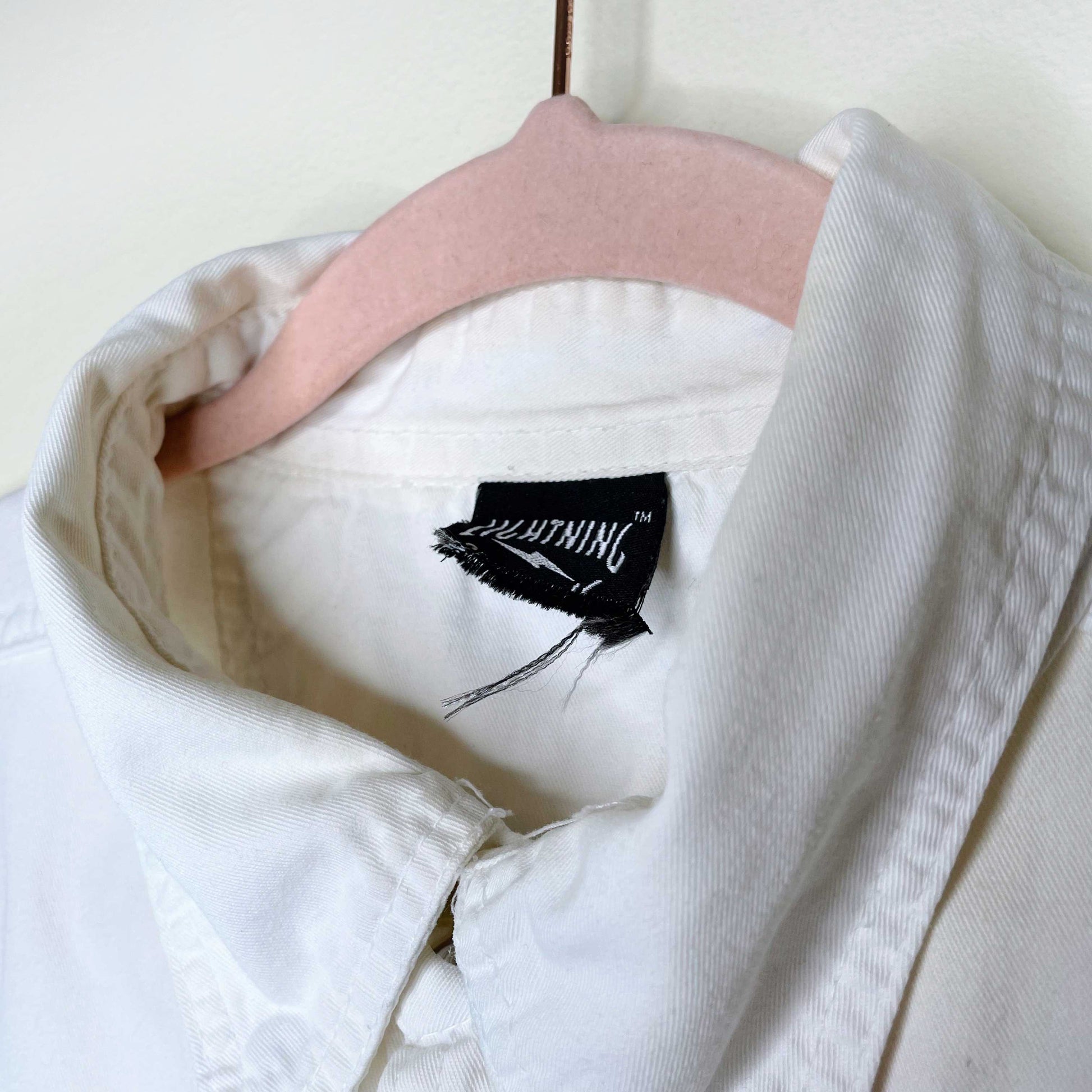 Item Description: This vintage sleeveless, raw hem, cut-off shirt hits home on the Harley-inspired moto look. Features two front pockets and graphic prints on the front and back with a high button up collar. No content tag, but likely 100% cotton.