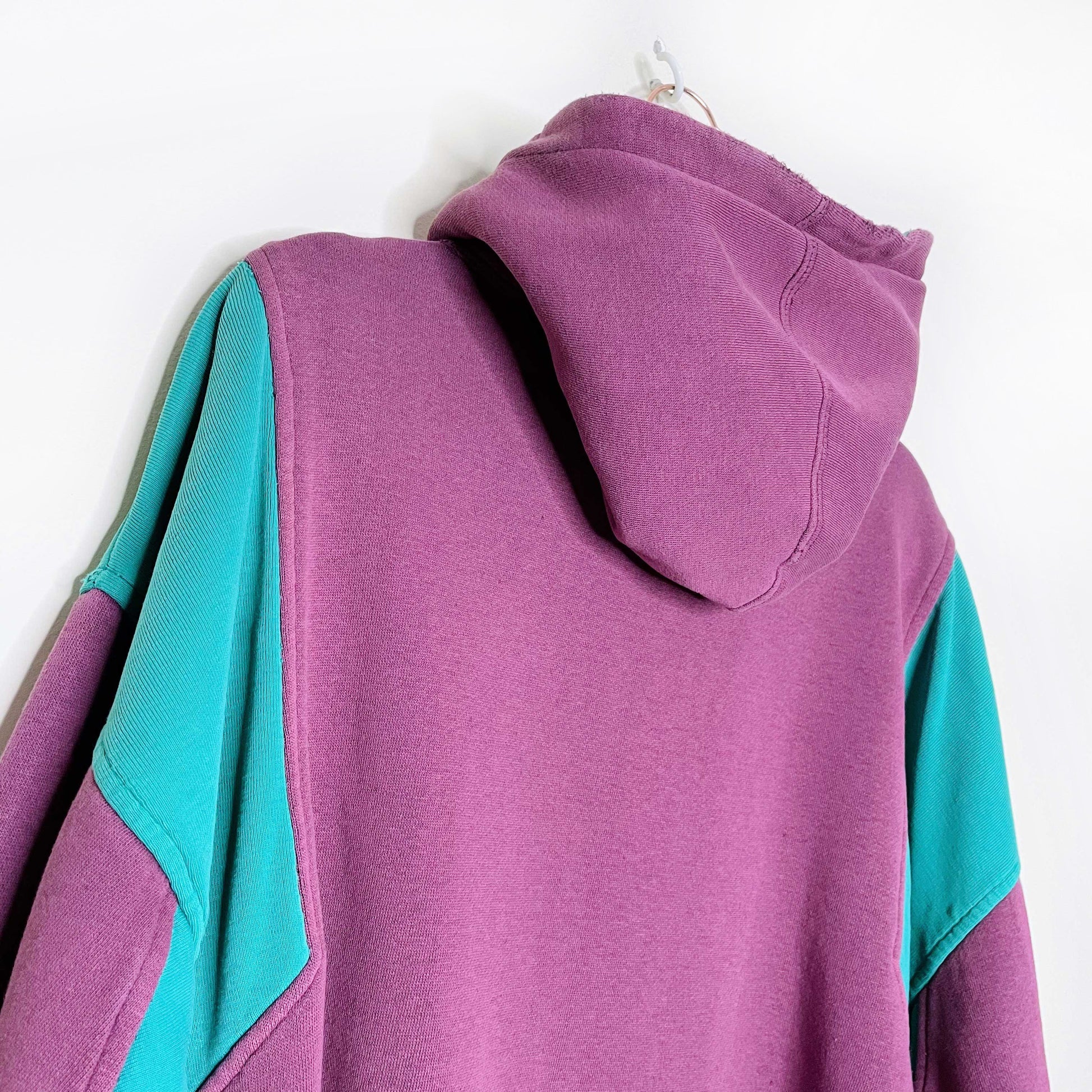 Item Description: This retro Mighty Ducks colour block hoodie features an embroidered logo and teal shoulder accents. Overall distressing and a full front joey pocket makes this collector's item truly unique. Can't read content tag.