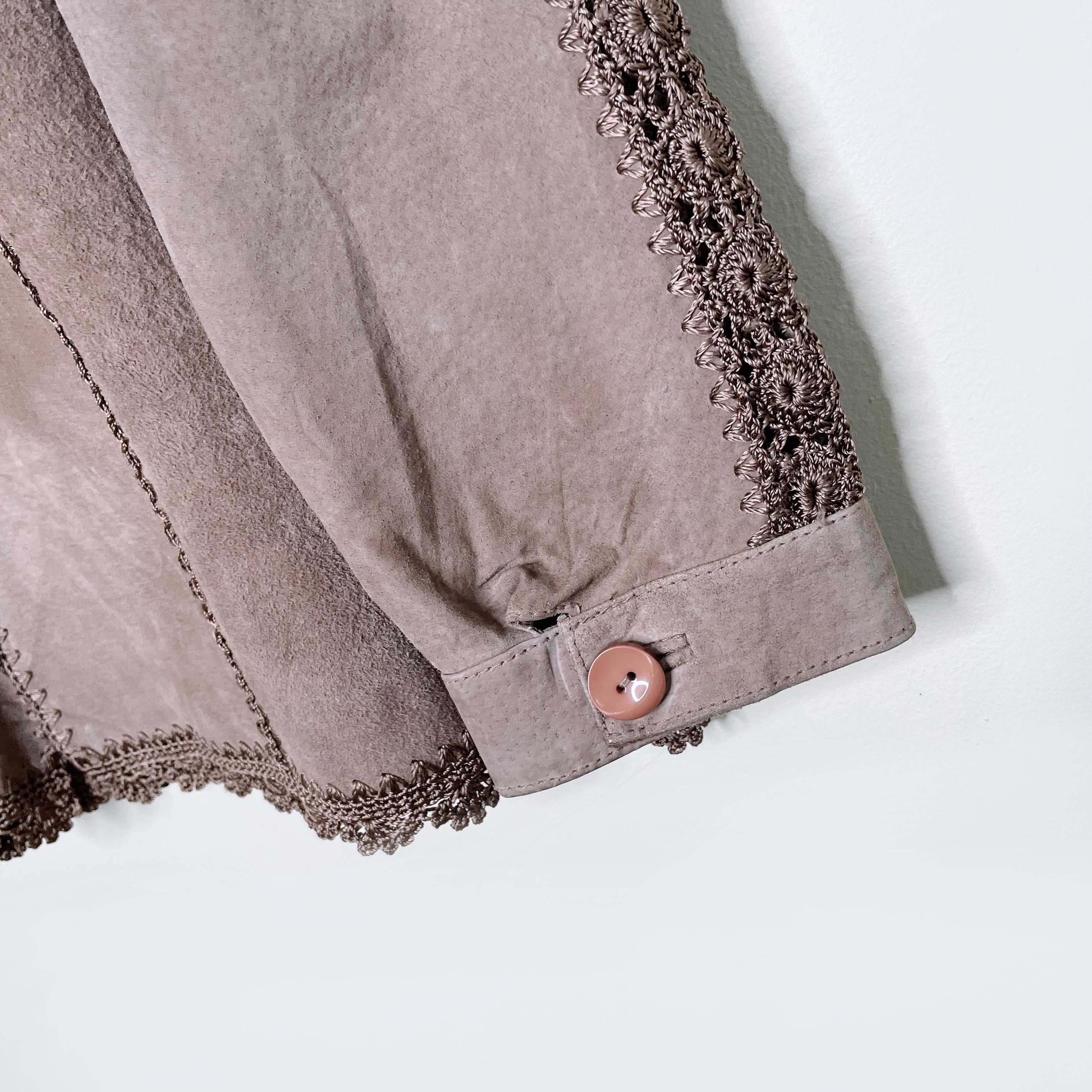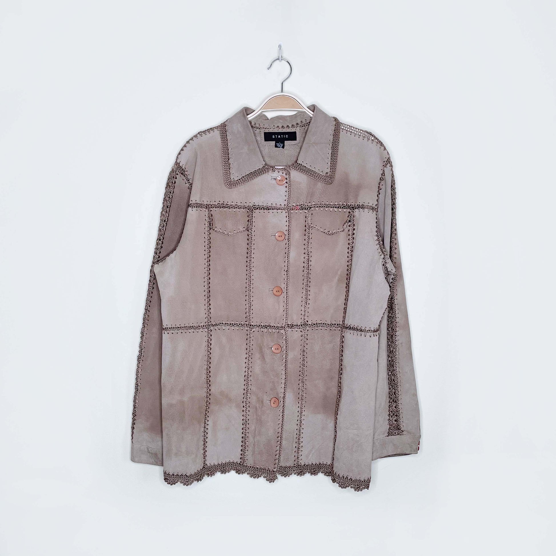 Item description: This 70s style bohemian leather jacket features a patchwork design with crochet seams and trim, shirt style 'shacket' cut in a neutral suede.