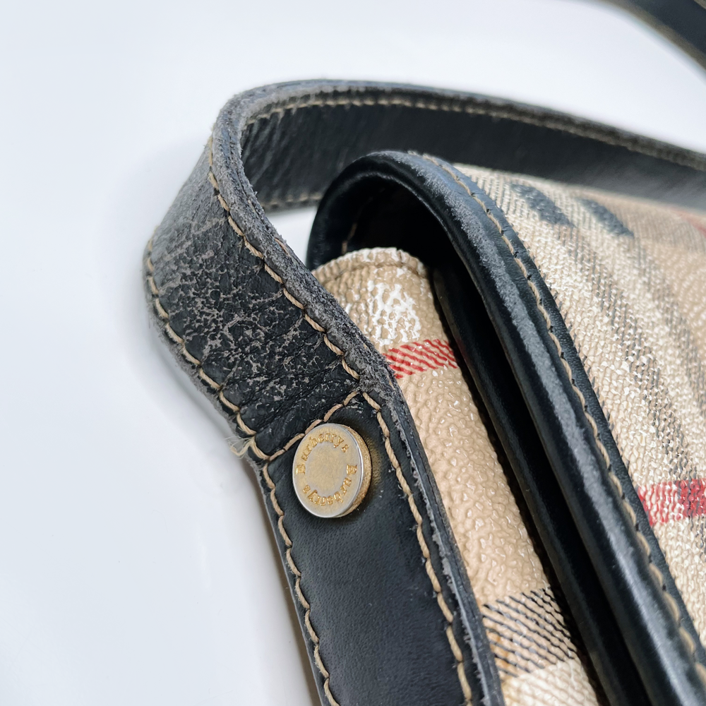 Item Description: This classic crossbody bag from Burberrys London features the iconic nova check pattern with flying equestrian horse, leather and horsebit closure with adjustable strap. 100% leather 100% authentic