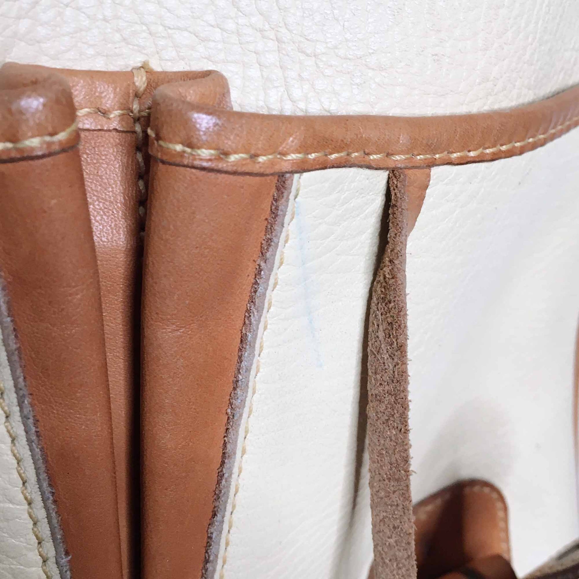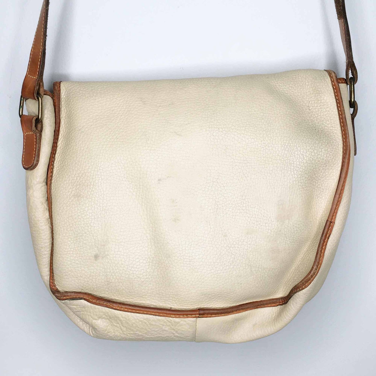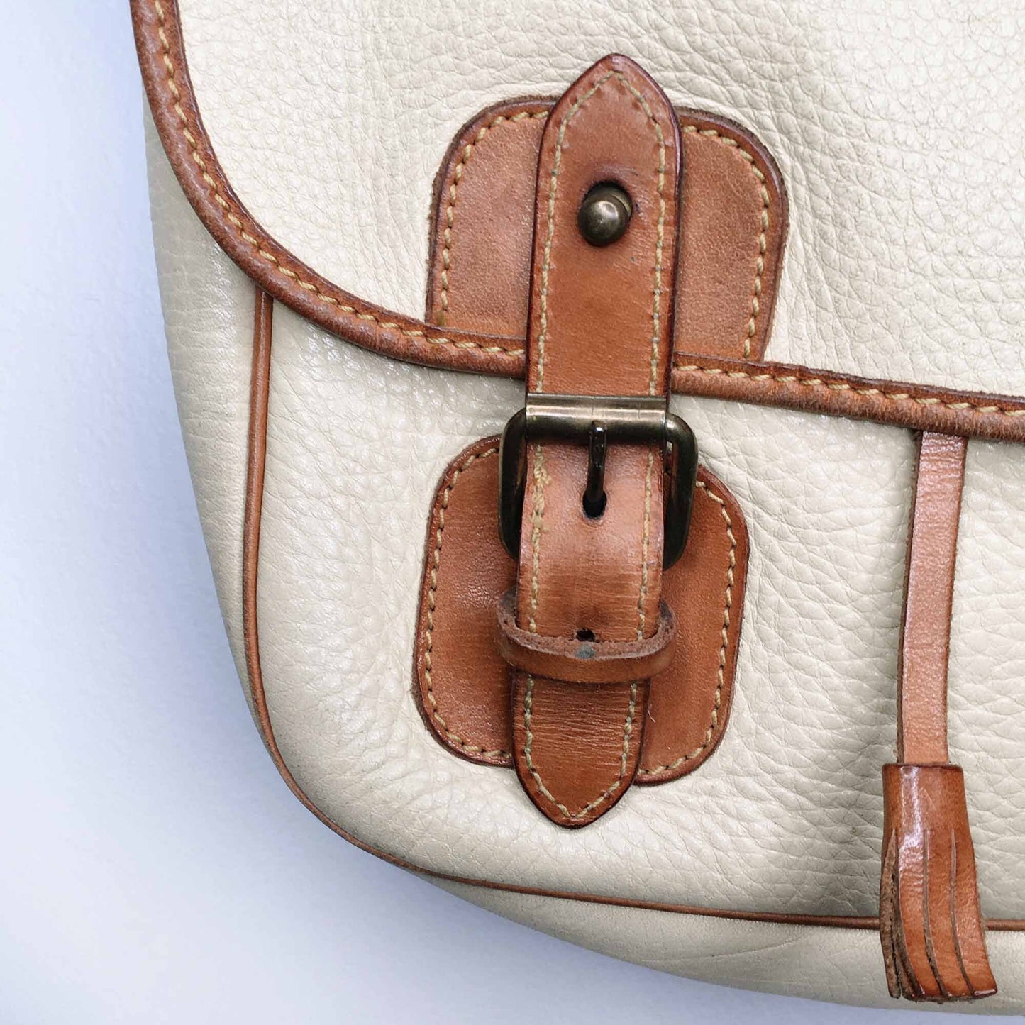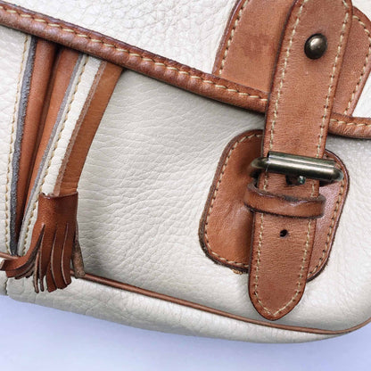 Item Description: This creamy unlined leather cross body with contrast tan trim features front flap with 2 buckle closure, 2 front pockets and leather tassel details. 100% leather