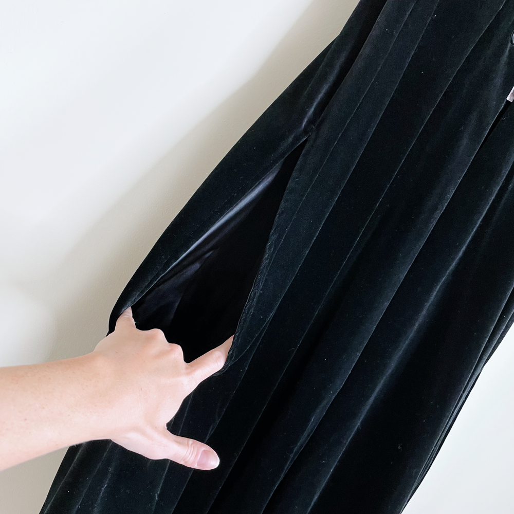 Item Description: This stunning vintage maxi cape is made with yards of draping velvet and features a swing hem with arm cutouts, oversized hood and embroidered Qipao button closure. 100% cotton
