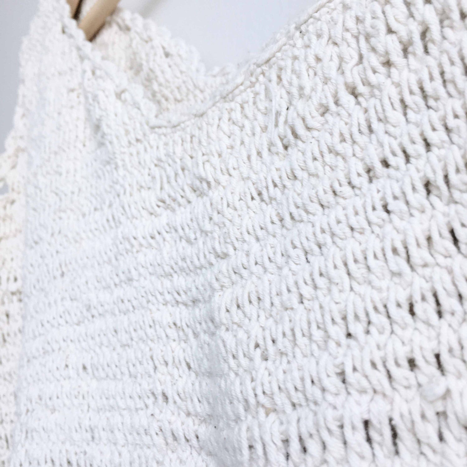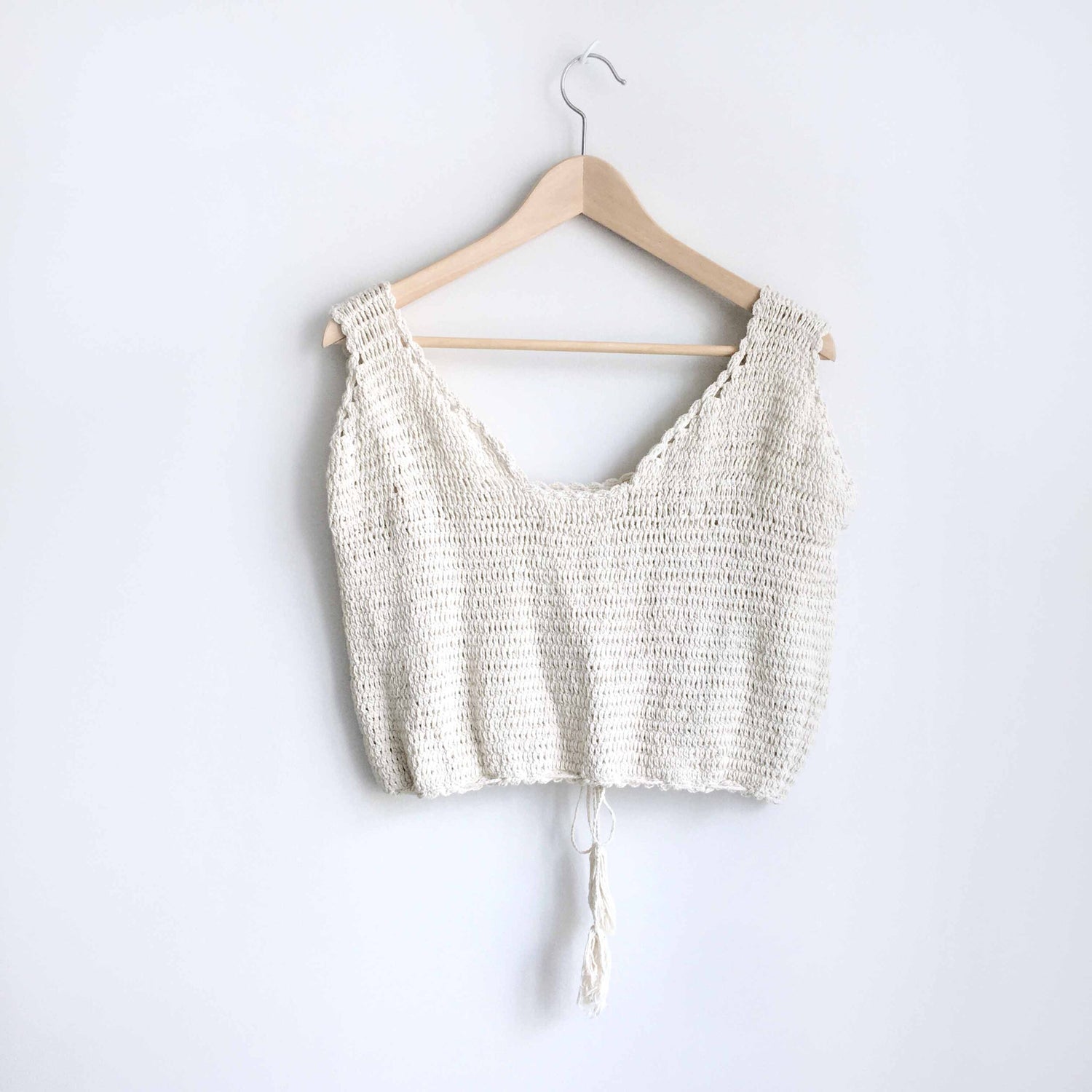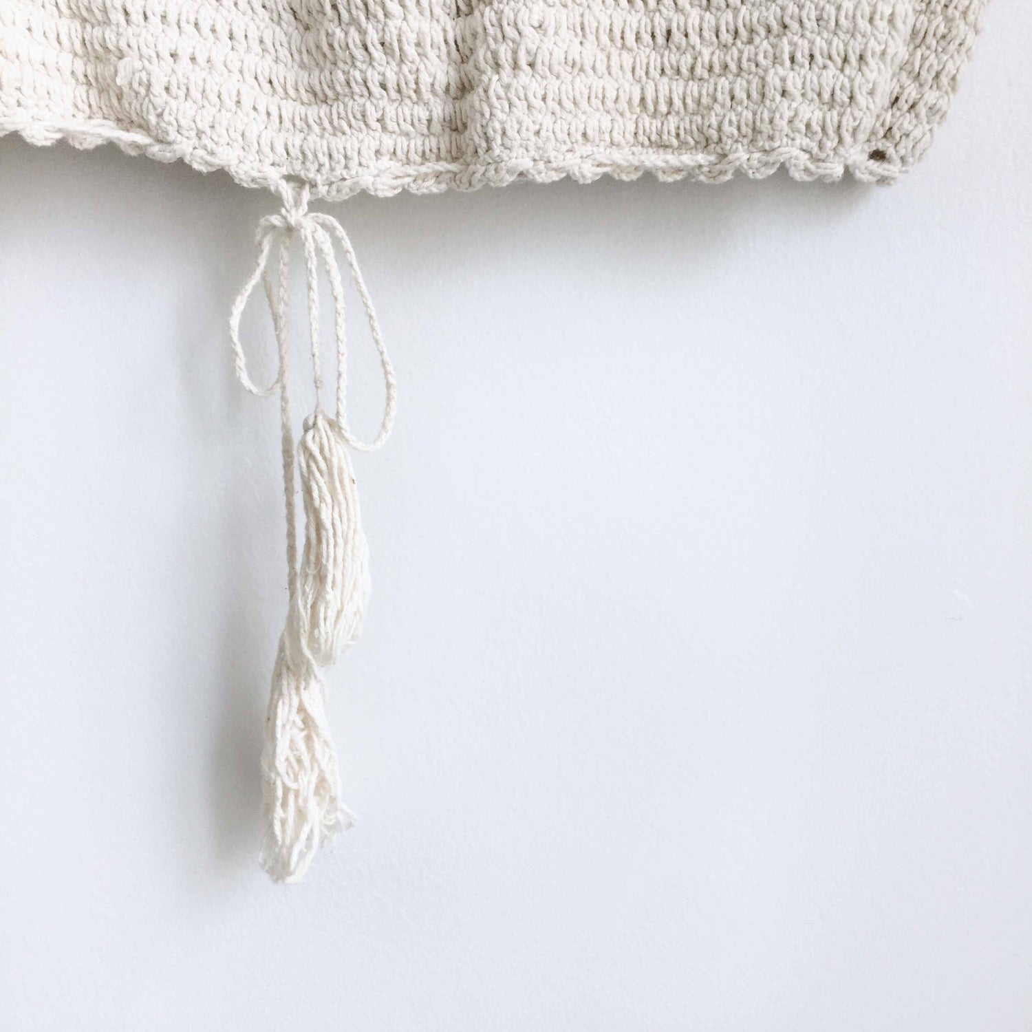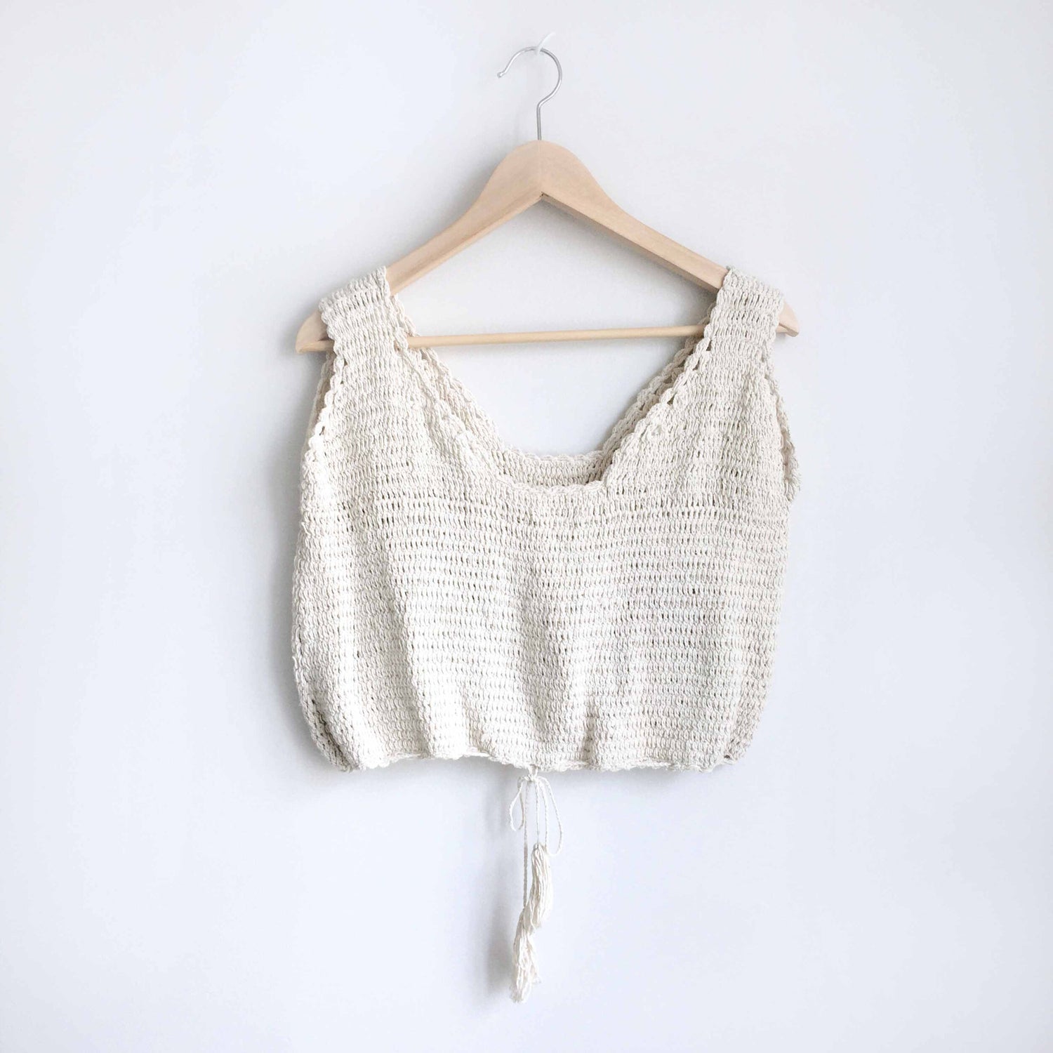 Item Description: This adorable crop crochet knit top features a squared off v-neckline and tie up tassel hem - feels like 100% cotton and handmade by someone’s grammie. All the love!
