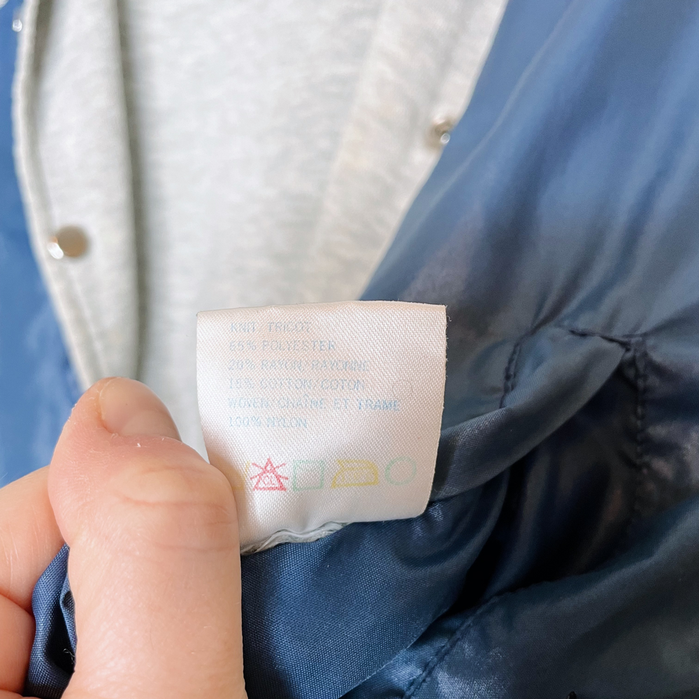 Condition: FAIR - overall micro pilling on sweatshirt material, nylon has two burn marks near right pocket, and faint staining around cuffs/sleeves and front tricot near buttons - has been washed but an old smokers smell remains so could use a soak or dry clean to freshen up