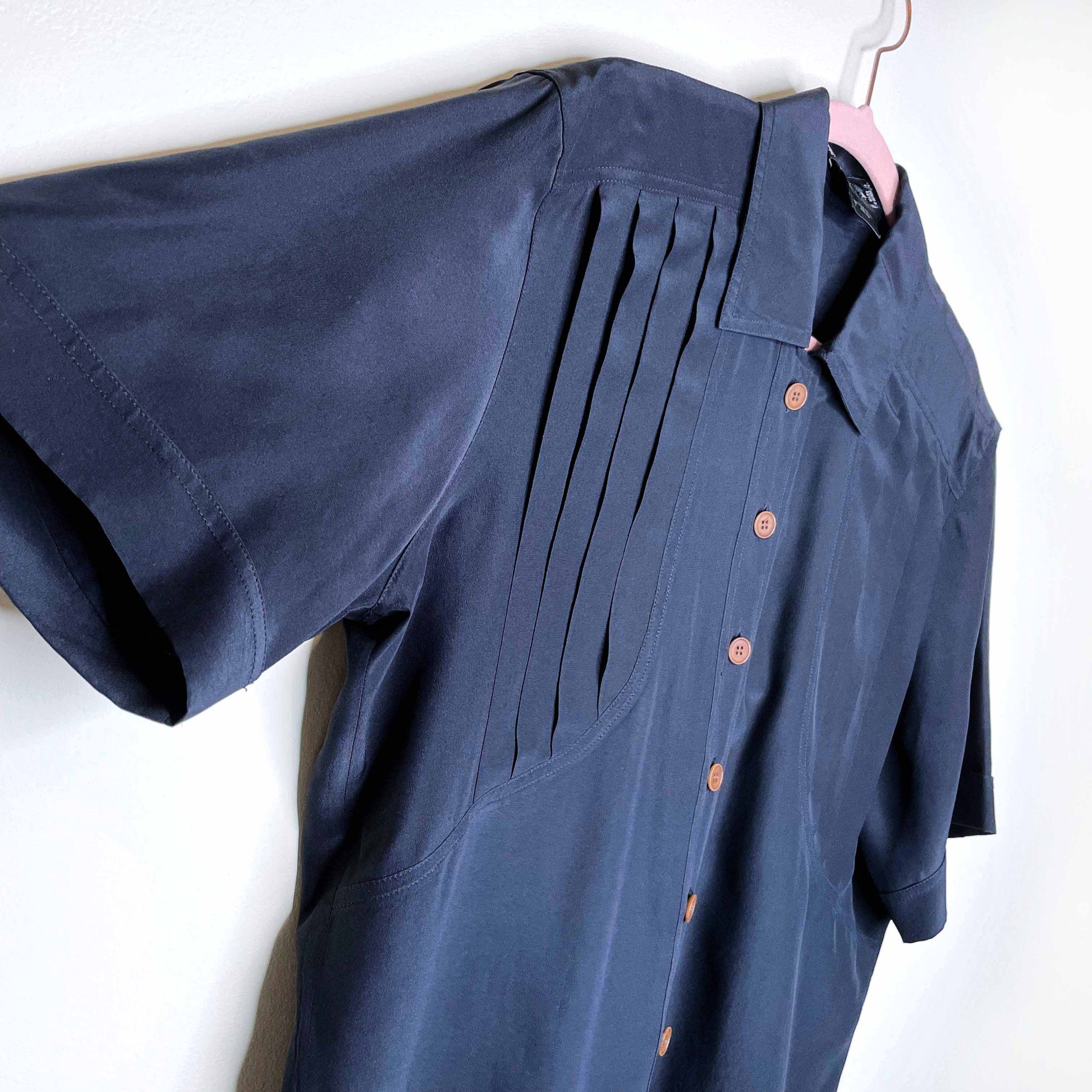 Item Description: This flowy button down shirt from Escada features a pleat fold front, oversized chest and cuffed sleeves. 100% silk
