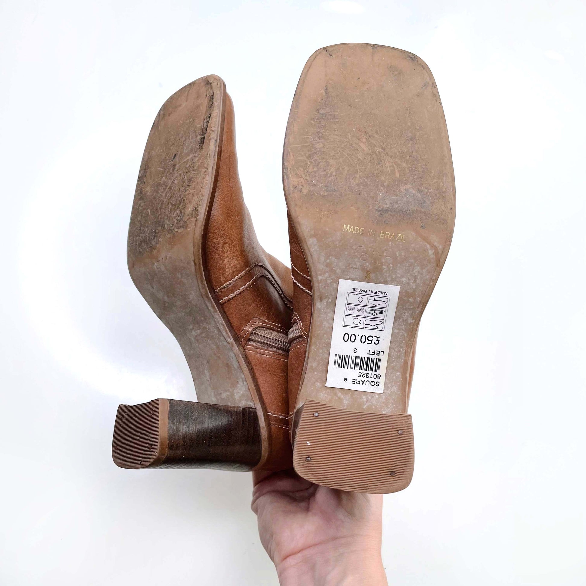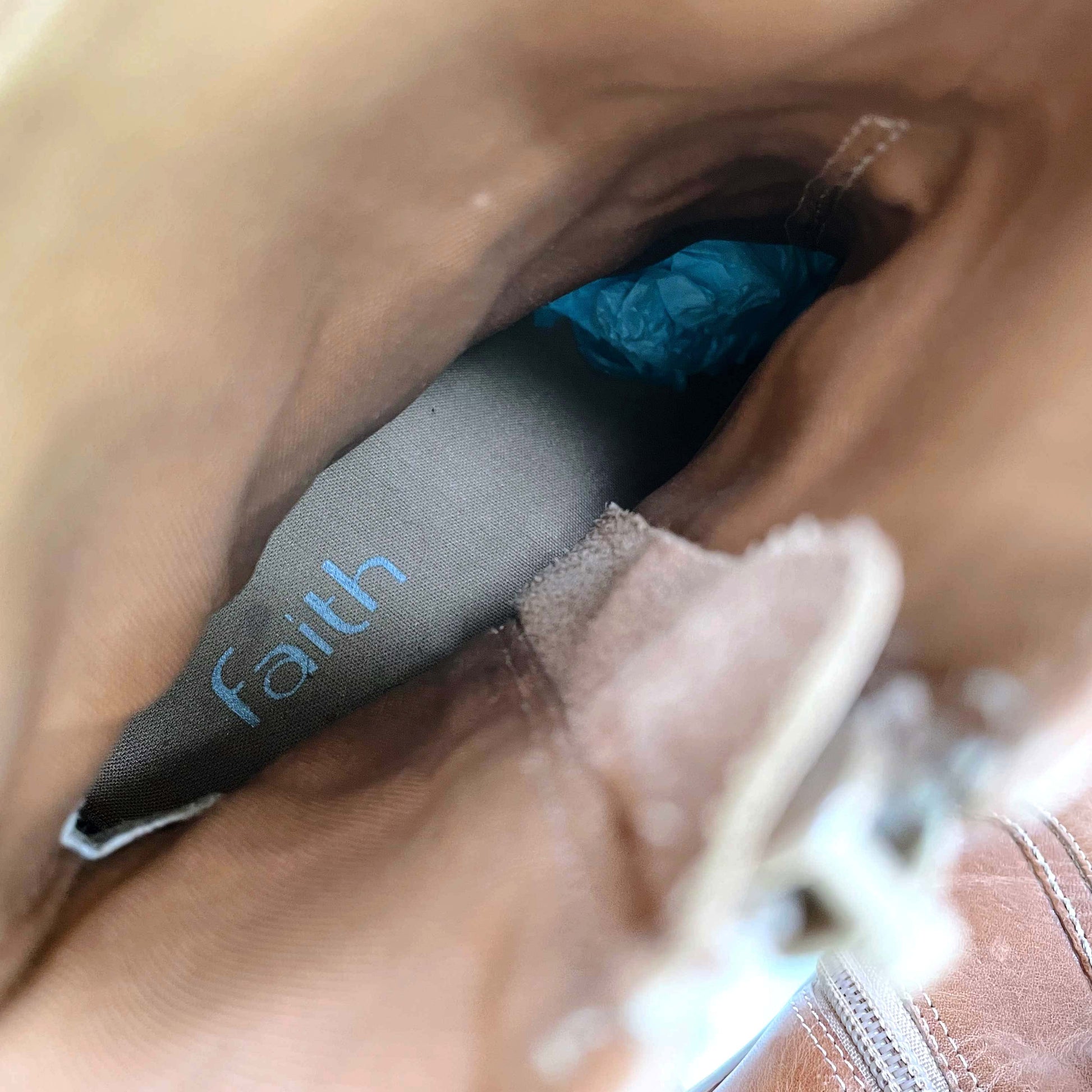 Item Description: These retro boots from 'Faith' feature a trendy square toe, tan brown leather and a stacked heel with side zip closure. 100% leather upper