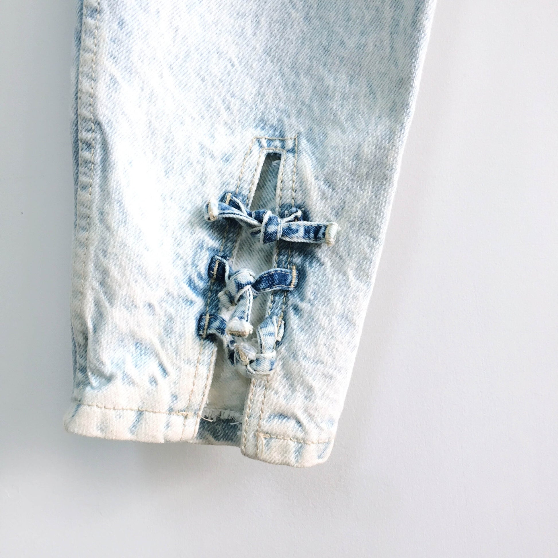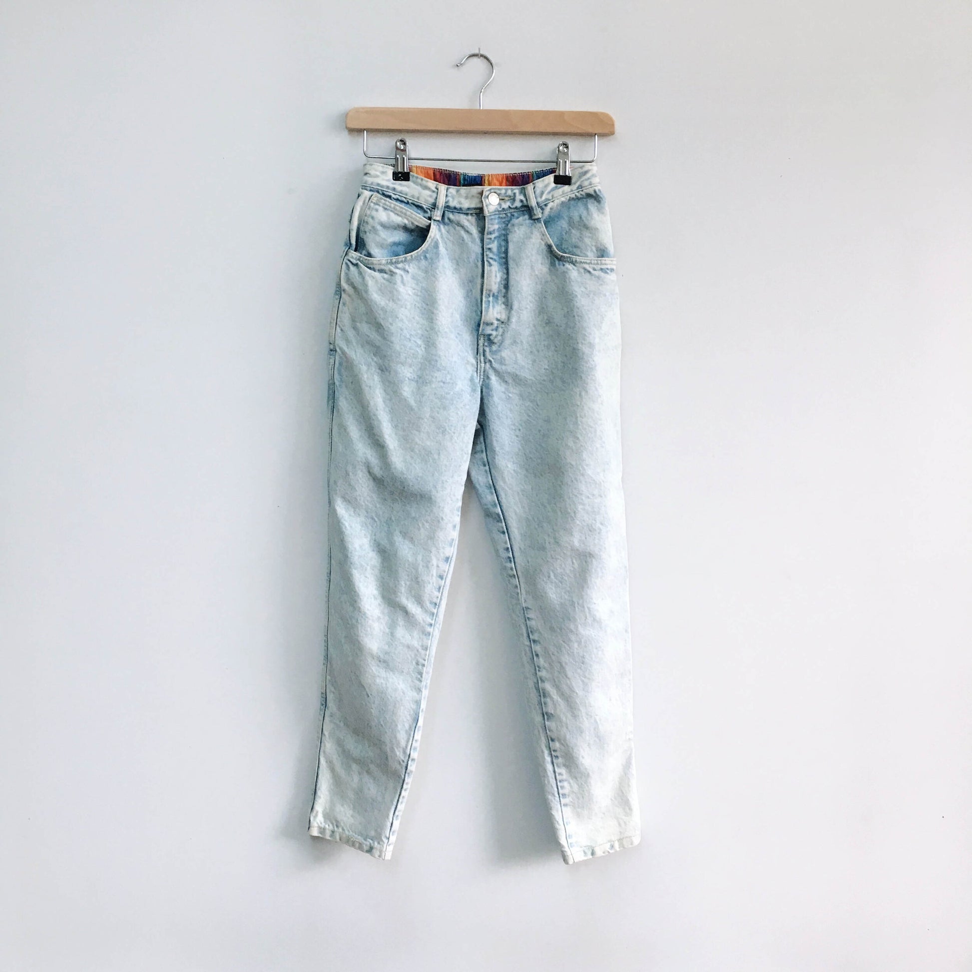 Item Description: These vintage Gitano Express jeans are only for the stylishly brave. A light acid wash, high rise tapered jean with multi-colour inside waistband trim and back tie up hem. 100% cotton