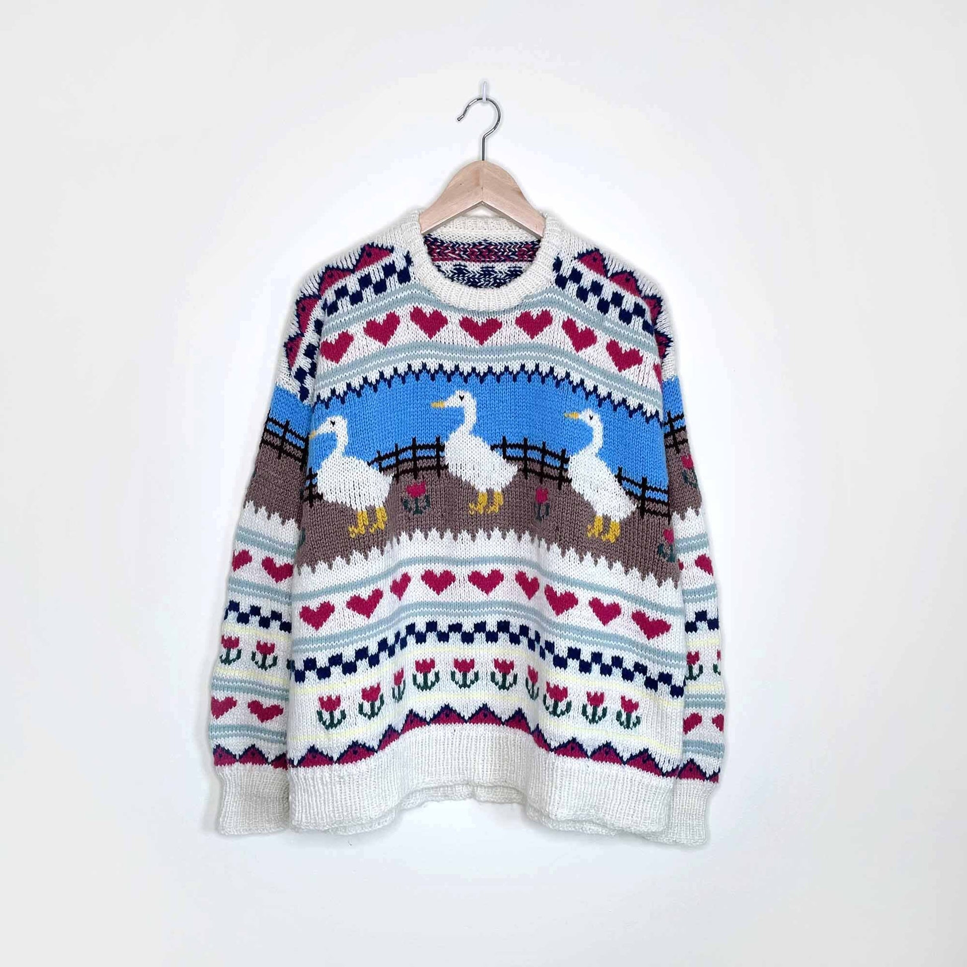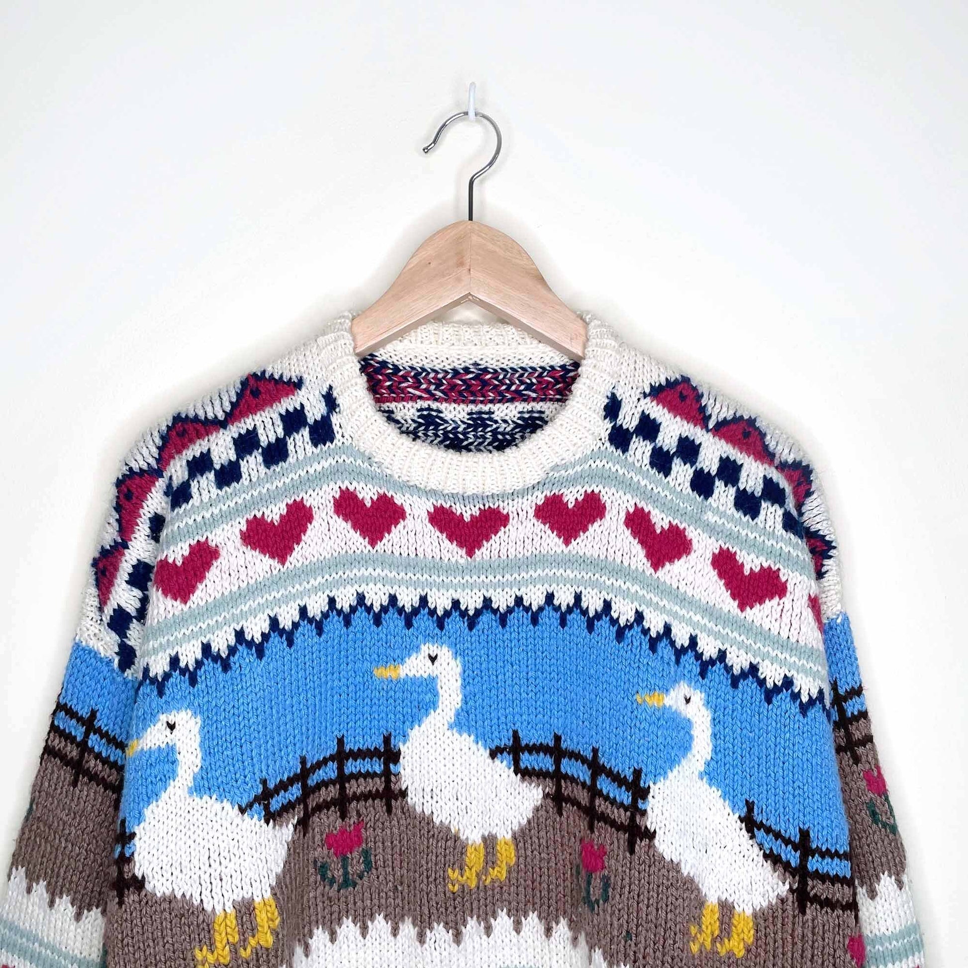 Vintage hand-knit ducks and hearts sweater - size M/L