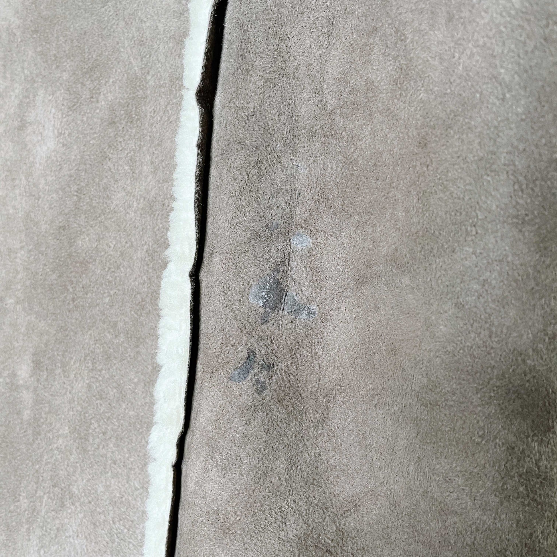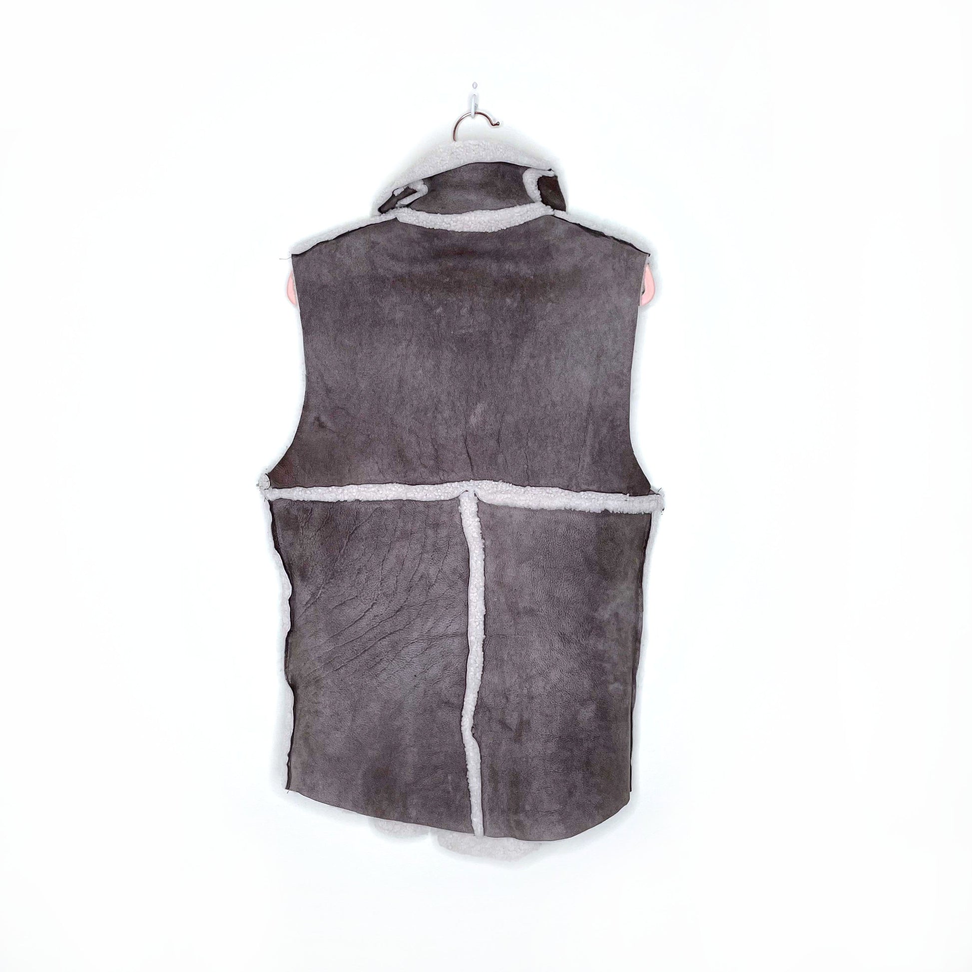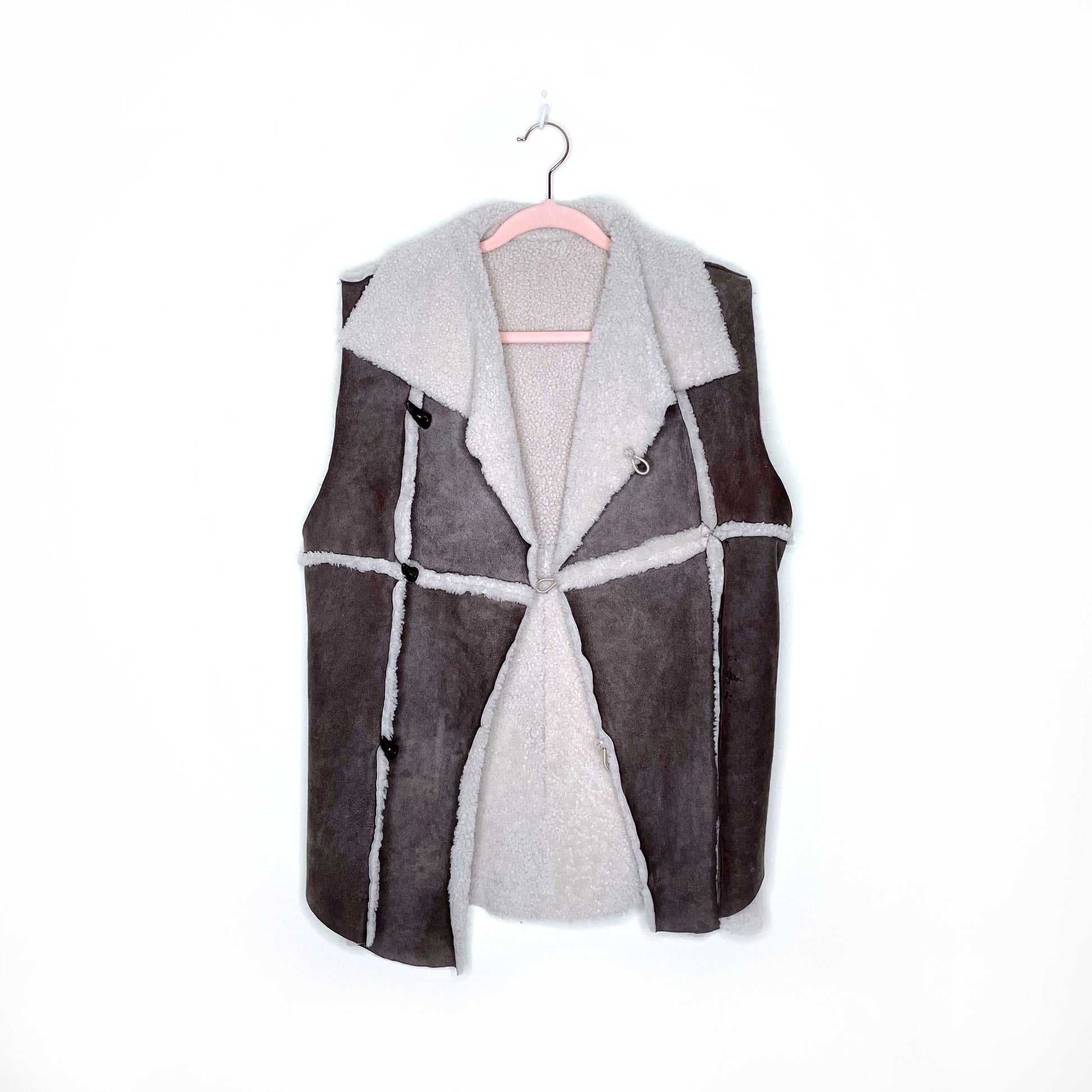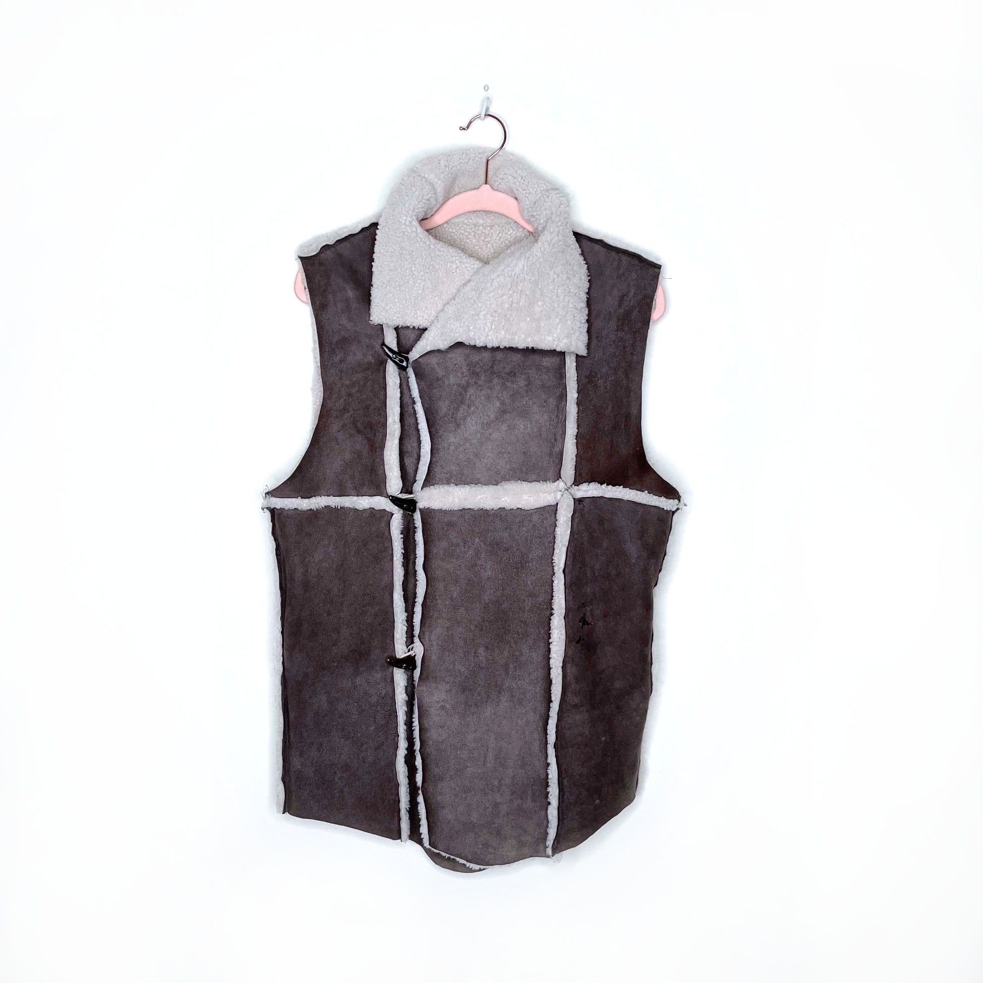 Item Description: This raw hem, handmade shearling vest features a doubled up asymmetrical closure with tooth buttons, in a patchwork, rancher style pattern with oversized collar. 100% sheepskin