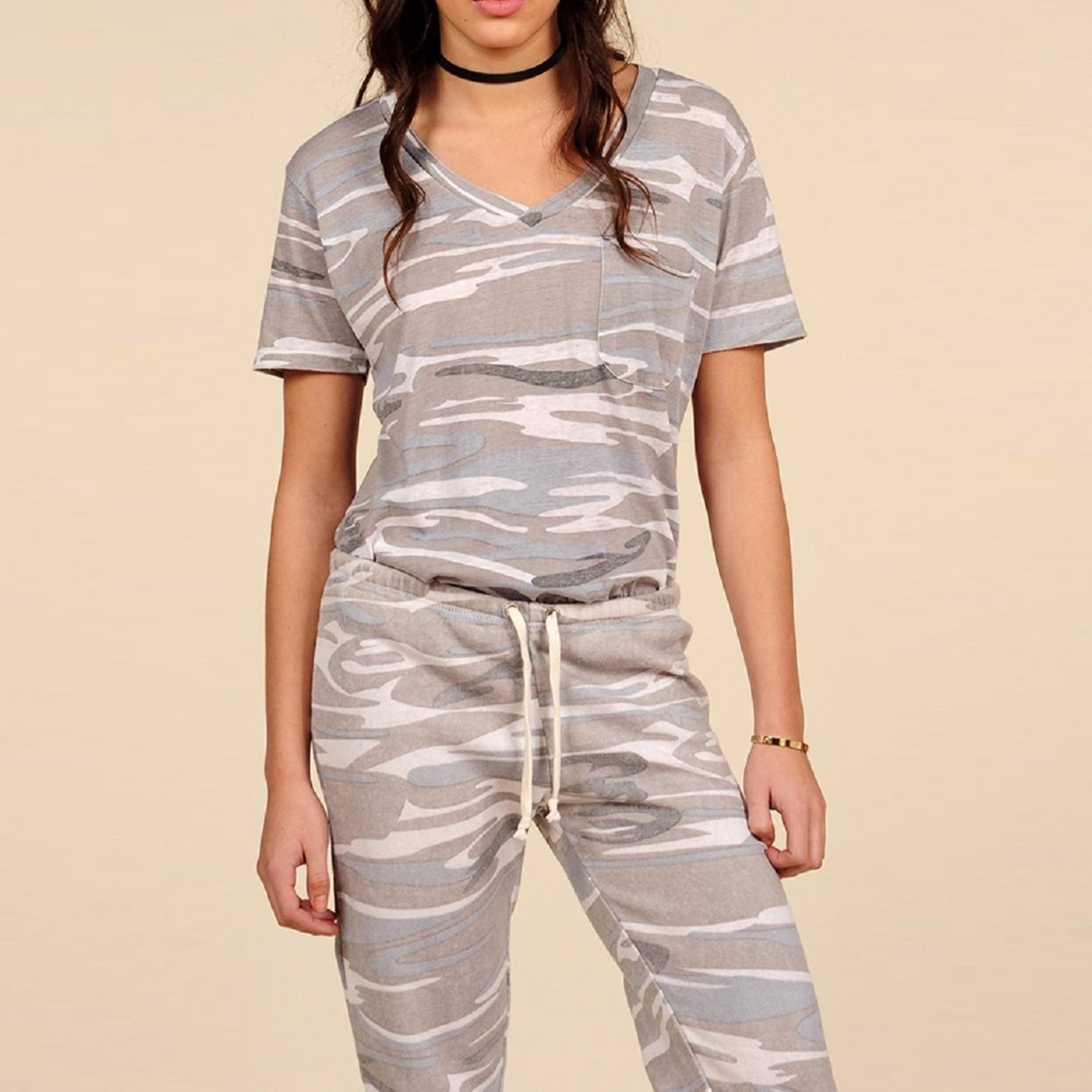 Item Description: V-neck tee from Vintage Havana with rolled cuffs in a vintage wash army print. 55% cotton 45% polyester