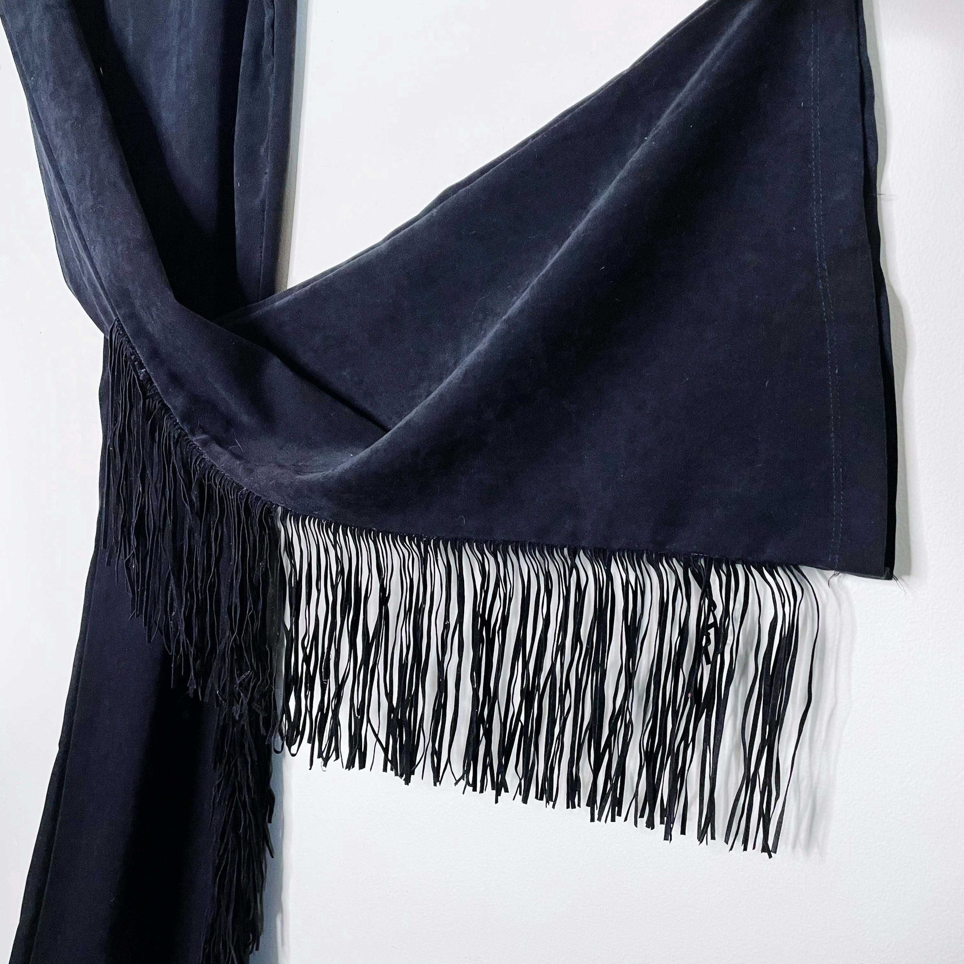 vintage low rise black faux suede flare pants with fringe - size 27