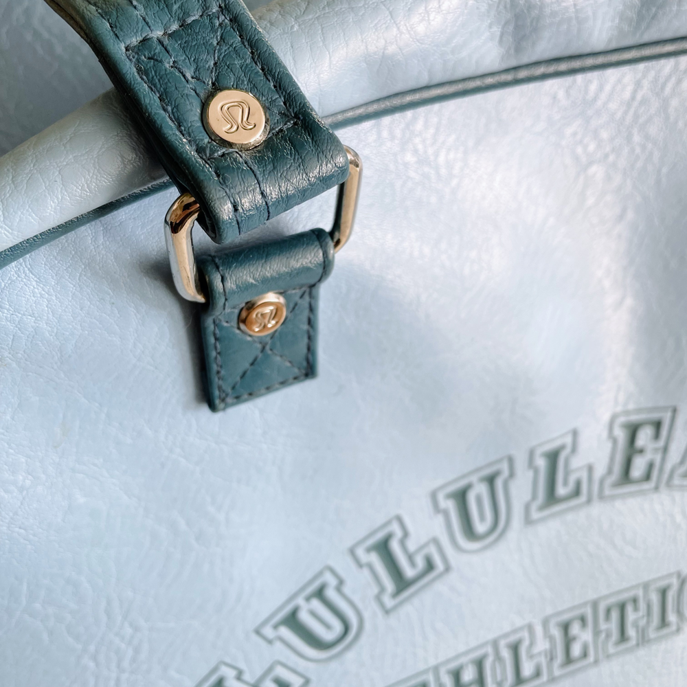 Item Description: This old school lulu duffle bag features a collegiate font logo with corner stripes in a faux pebbled leather. Comes with top handle carrying straps and a detachable cross body (original is missing, but another lulu strap has been added), patterned liner and interior organizing compartments.