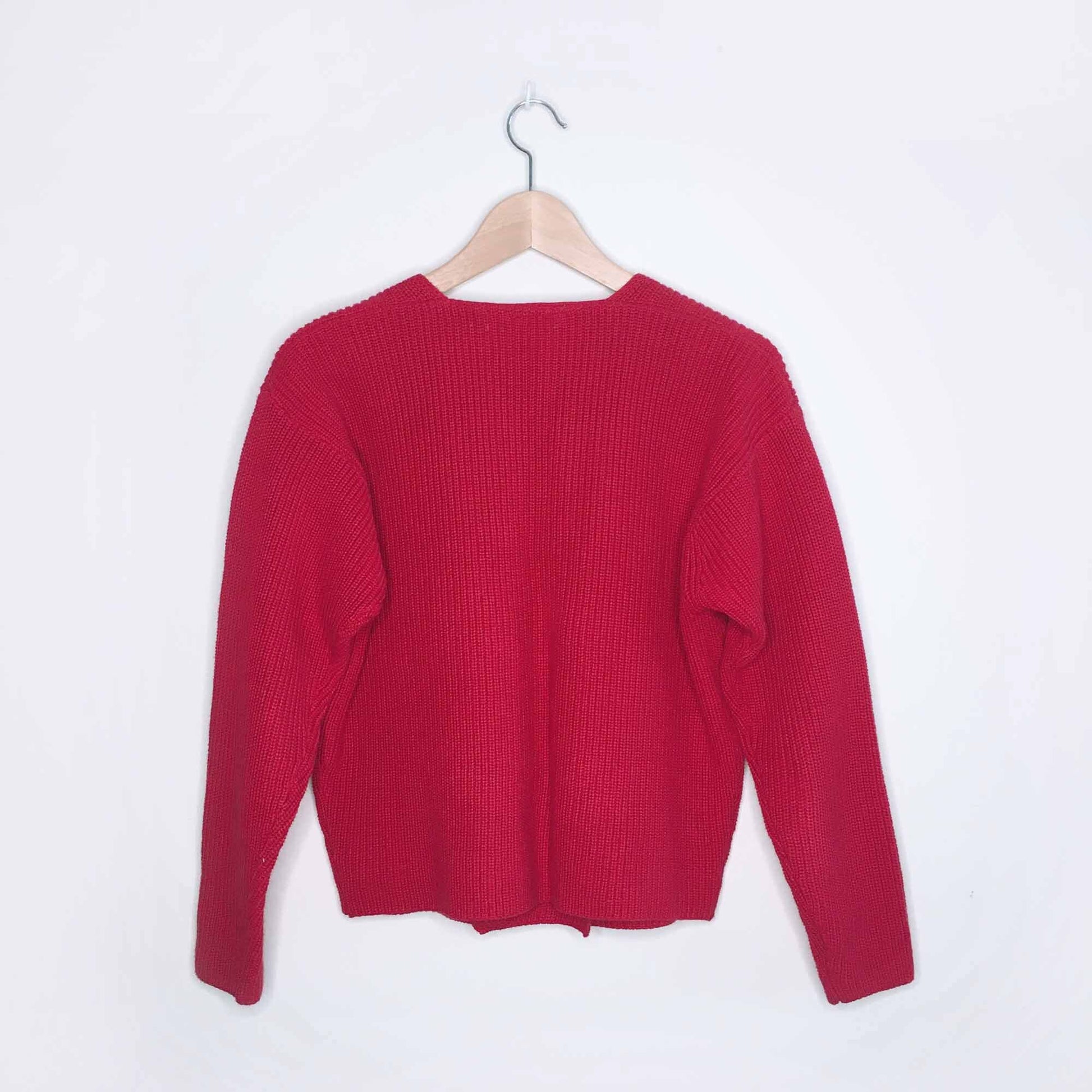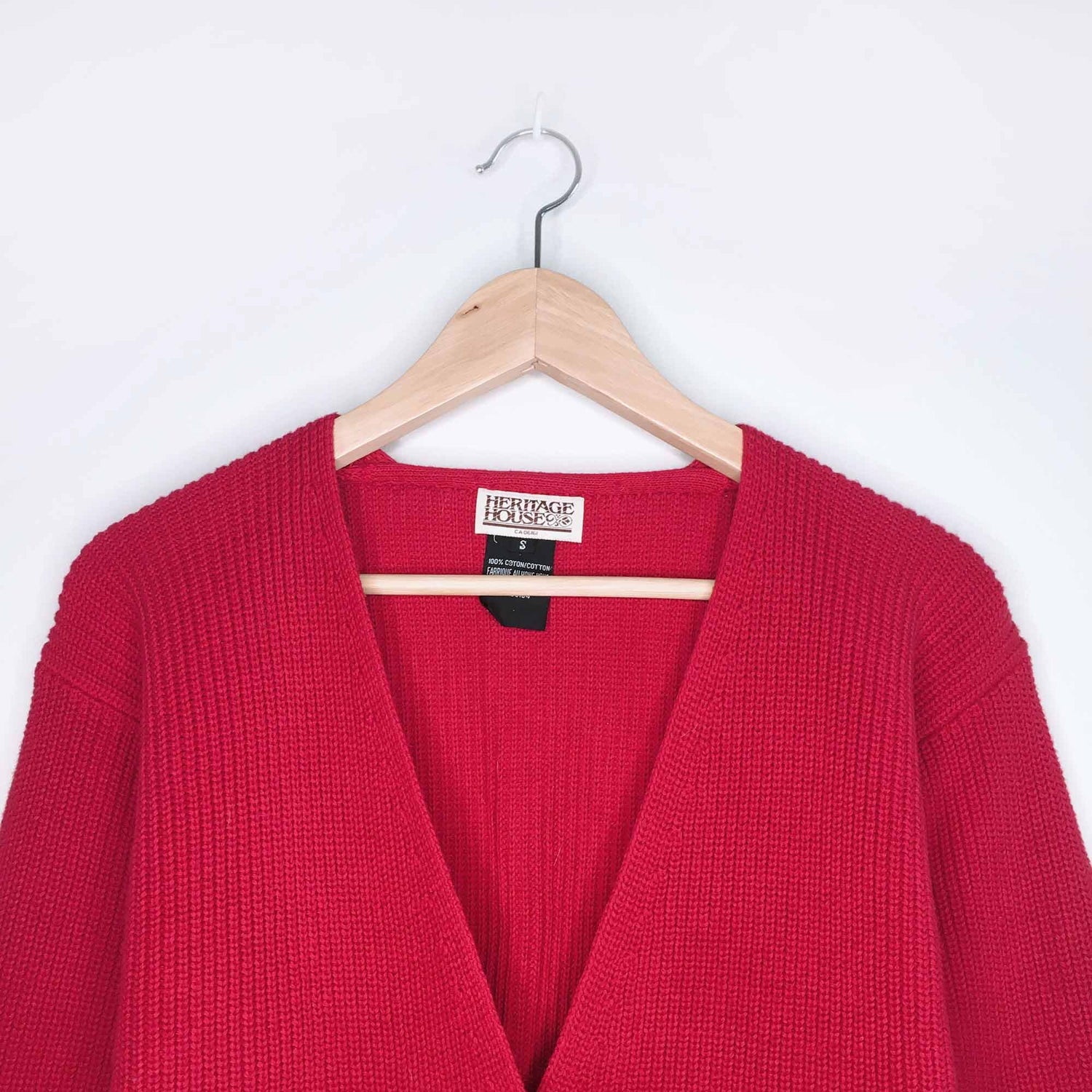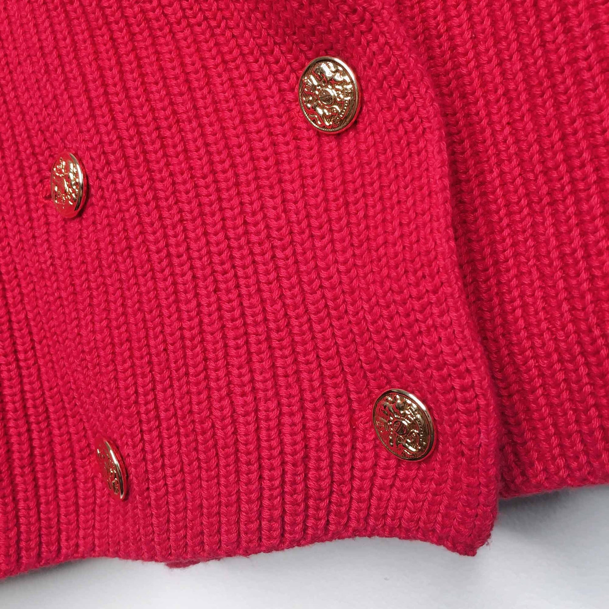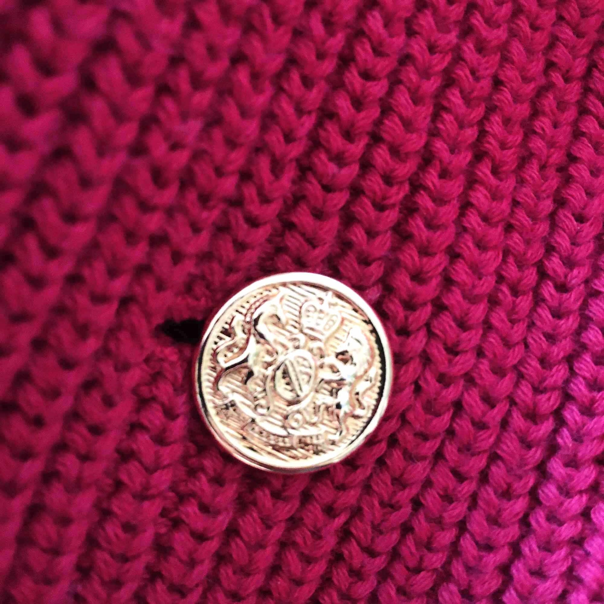 Item Description: This vintage cotton cropped cardigan features a double breasted front with gold nautical buttons in a ribbed knit. 100% cotton