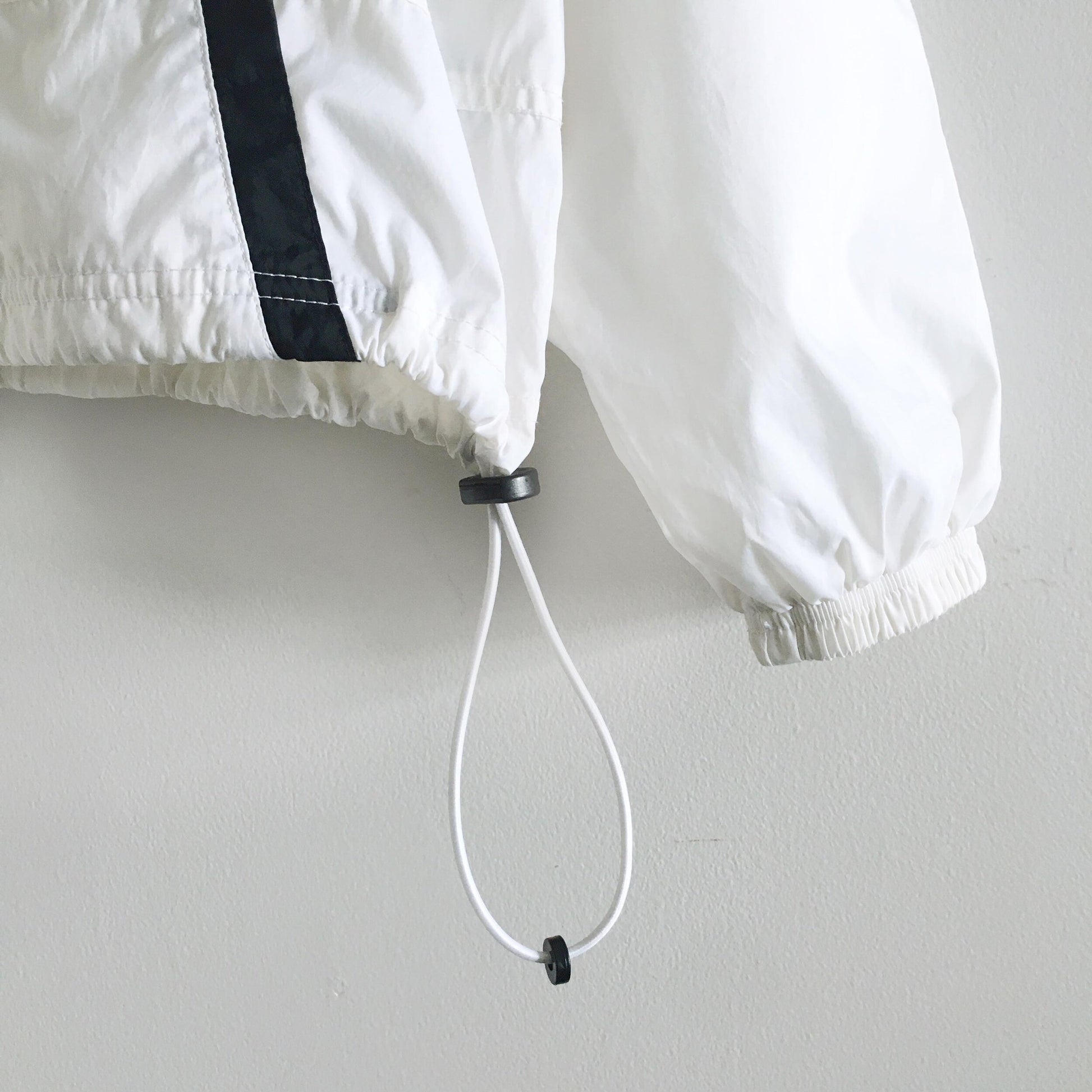 Item Description: A classic white spring jacket hooded popover with black contrast details and swoosh. Drawstring hood and waist. Front zipper pocket with snap button flap. 100% polyester white 100% nylon black parts