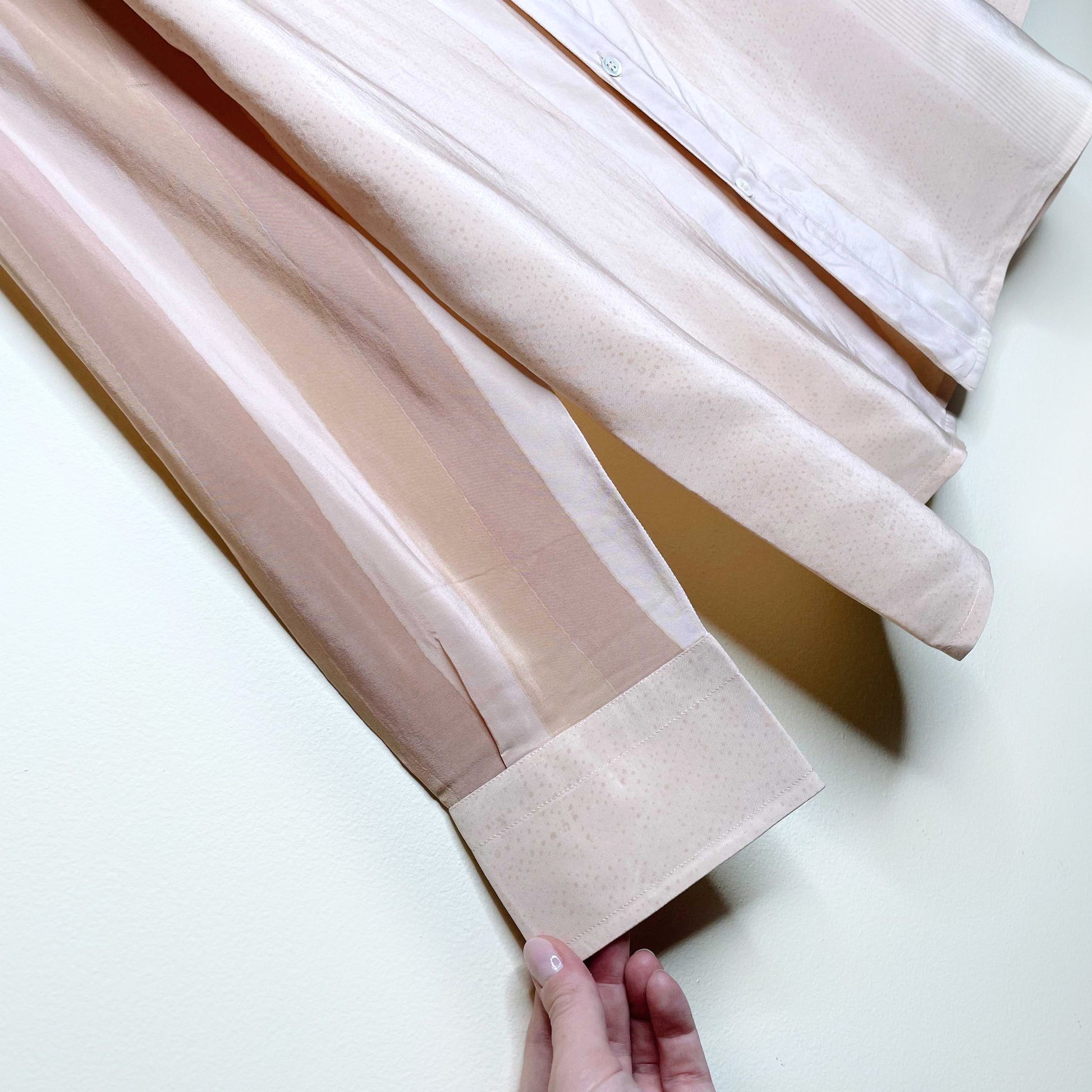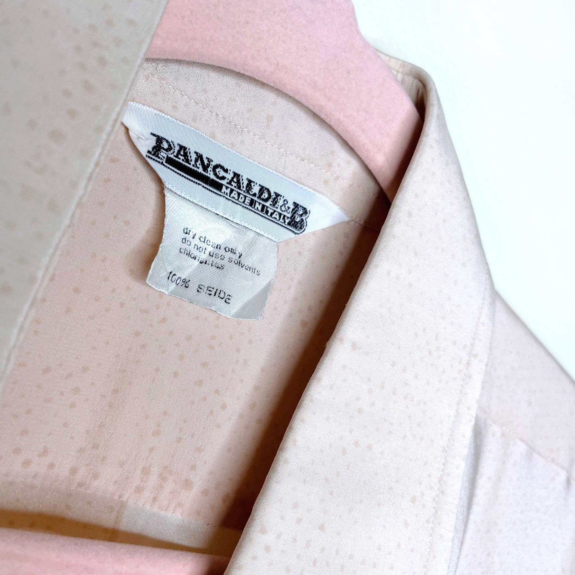 Item Description: This silk button down from Pancaldi & B is in pristine condition - features a neutral palette of unique patterns from stripes to organic dots. Truly one of a kind. 100% silk