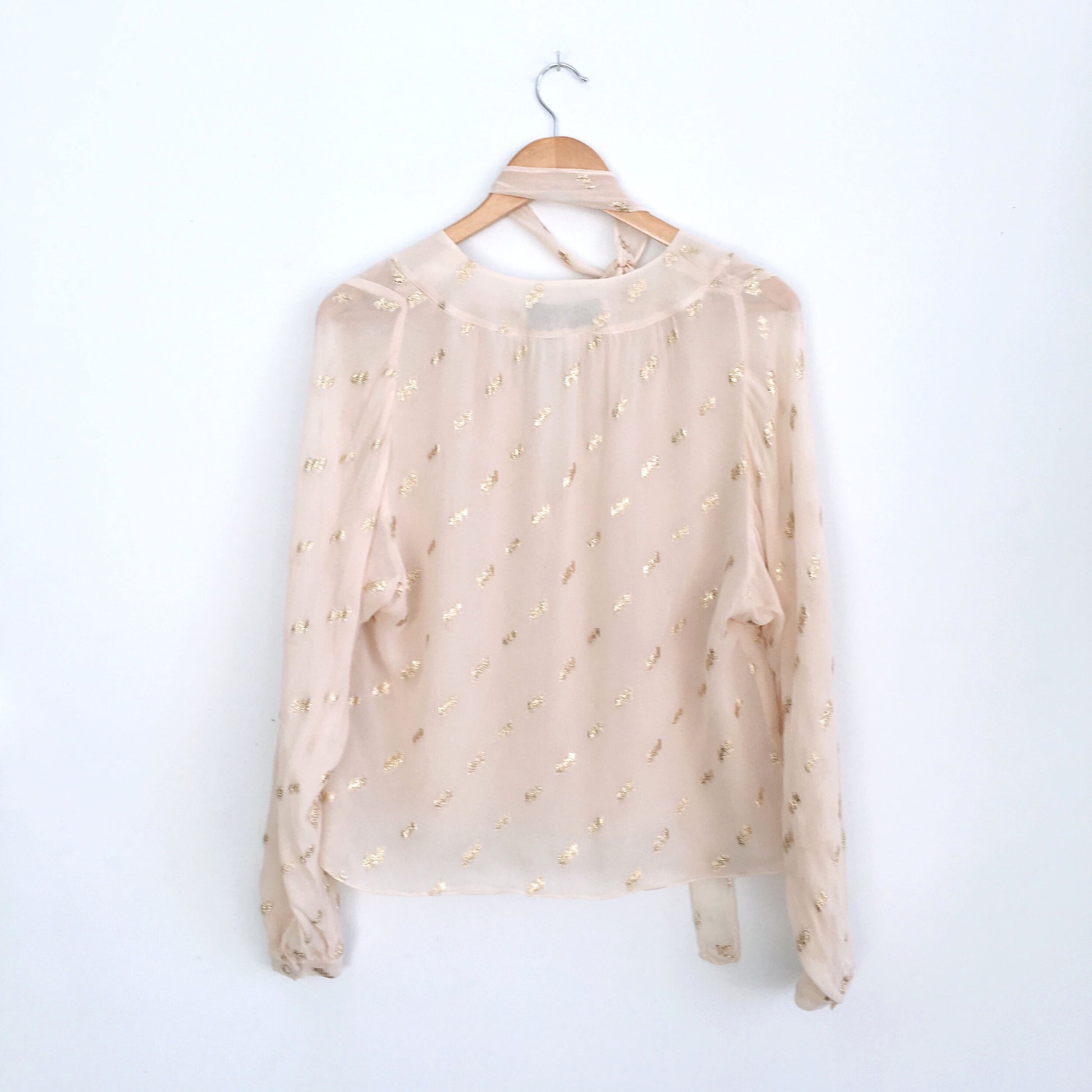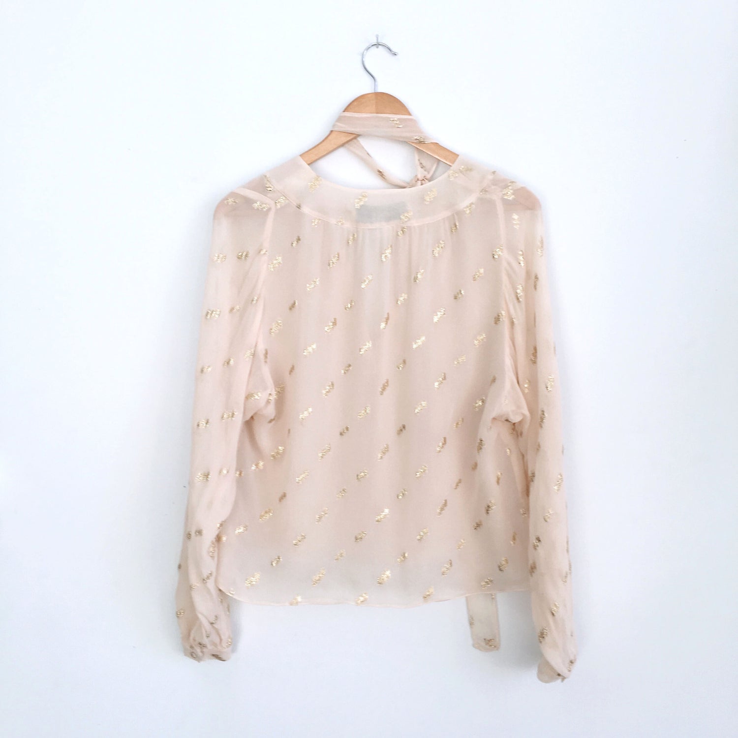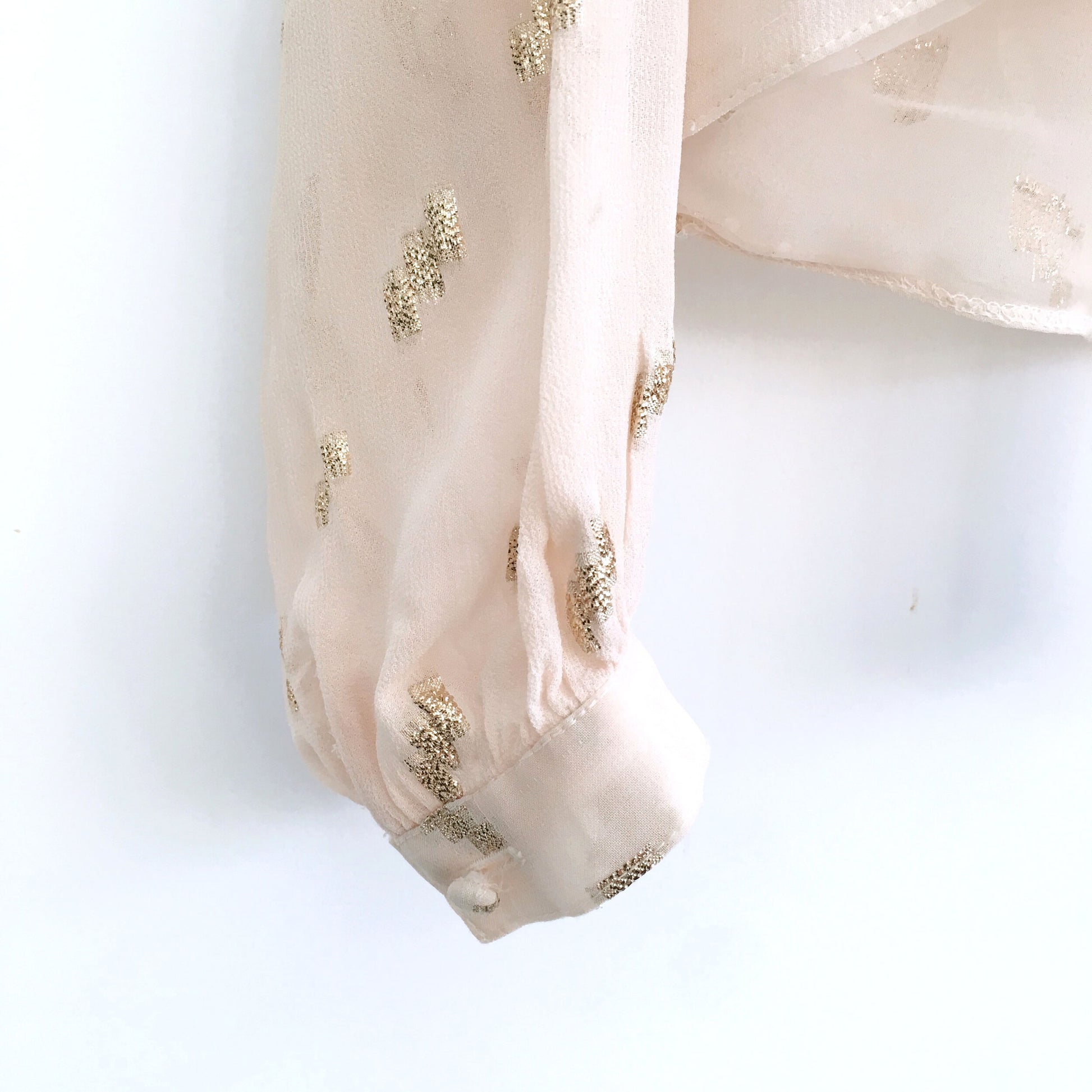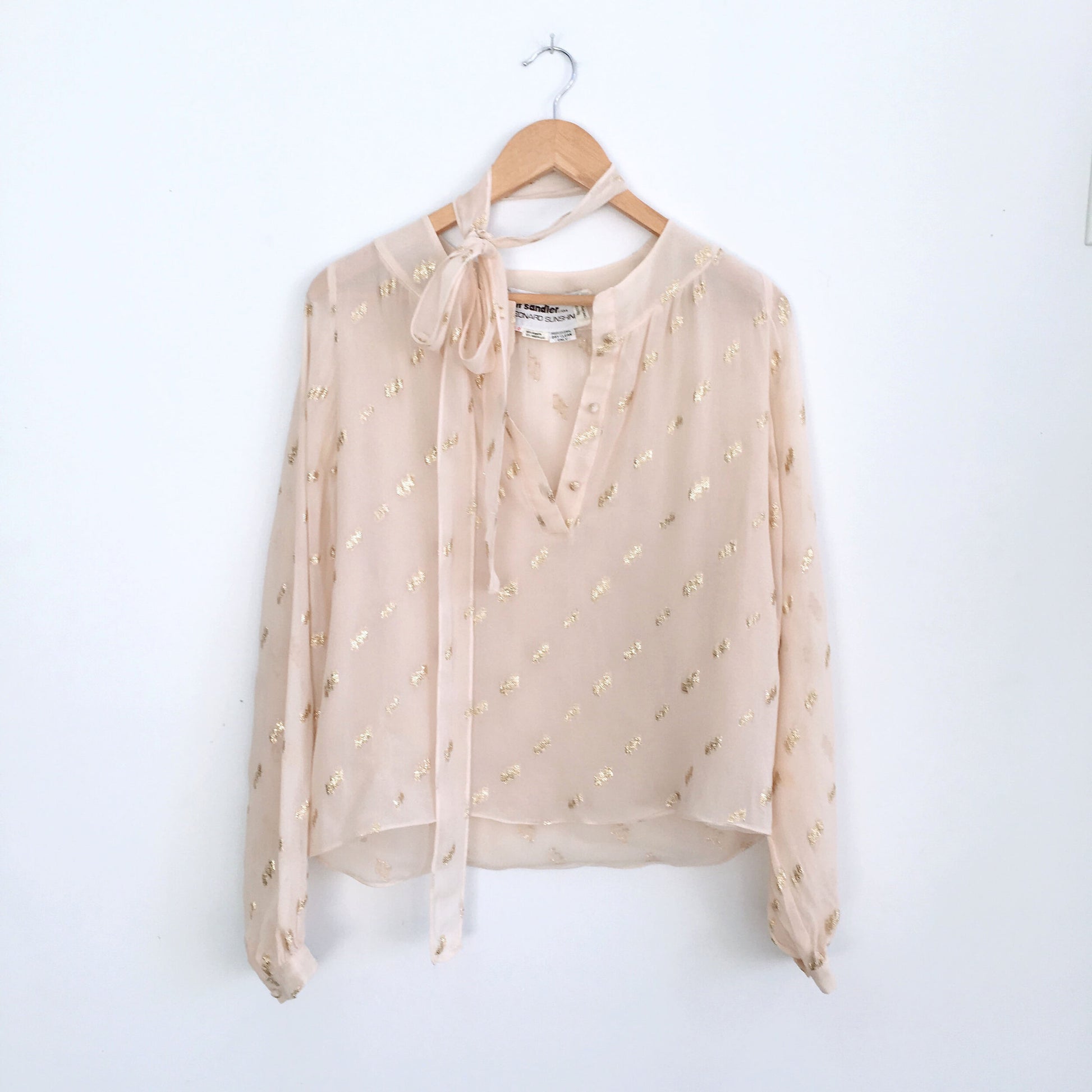 Item Description: An amazing vintage piece, this nude blouse features an extra layer for lining, all over gold metallic rain, fabric button front and cuffs and a tie to be used as a neck tie, or belt! 85% rayon 15% metallic