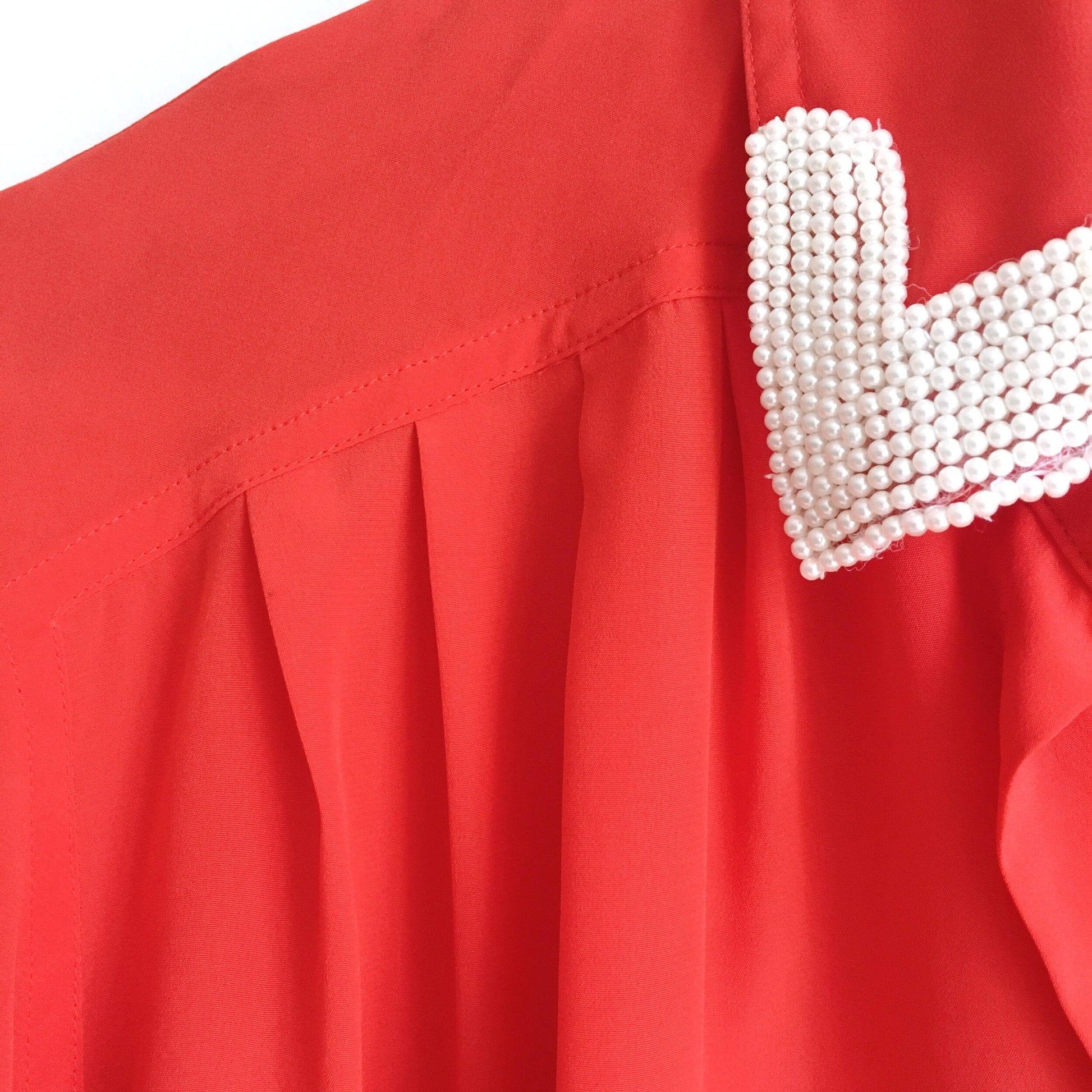 Item Description: This gorgeous vintage red short sleeve blouse from Como features a decadent pearl collar and pearl buttons. Features ruched shoulder and back detail in a stunningly soft and draping polyester. 100% polyester
