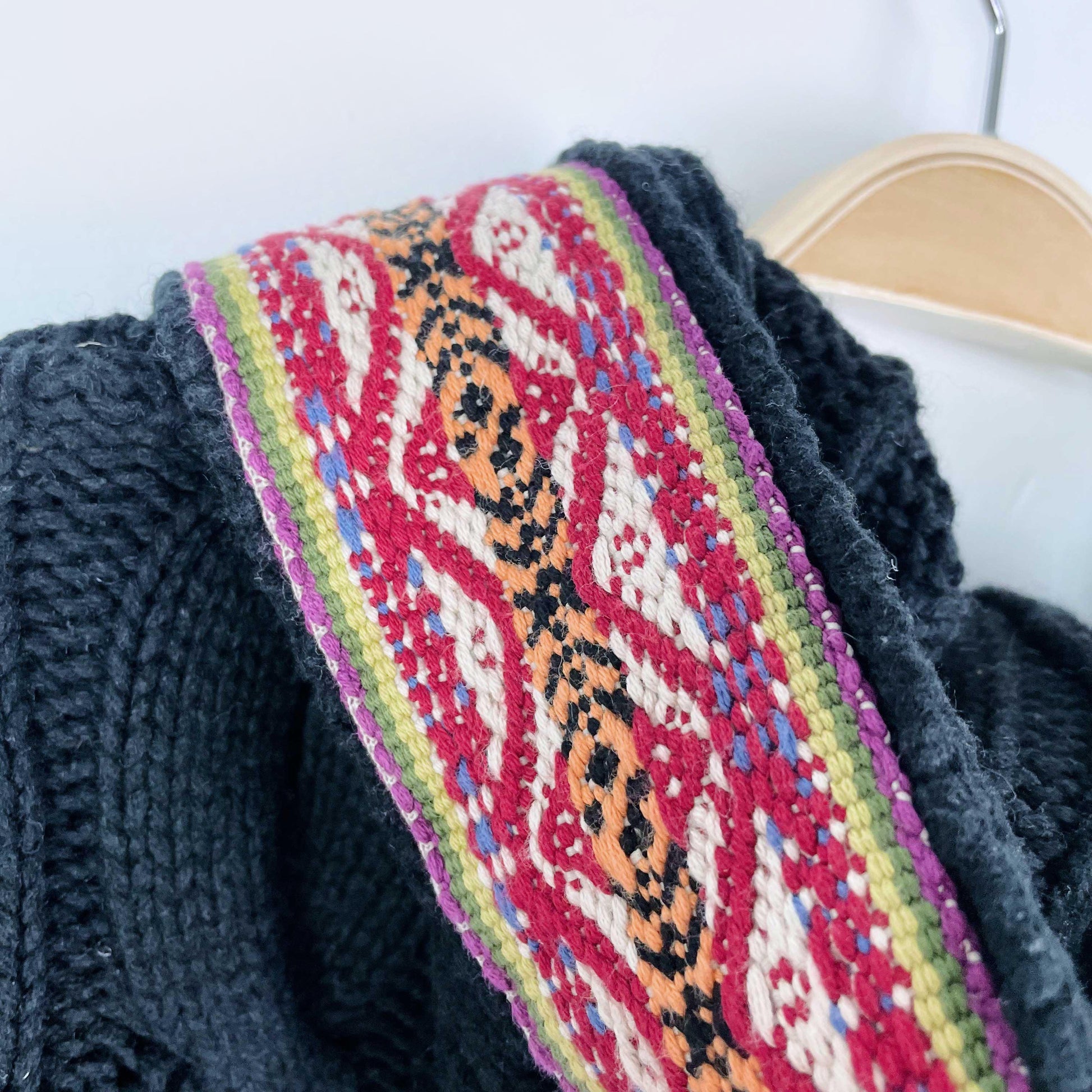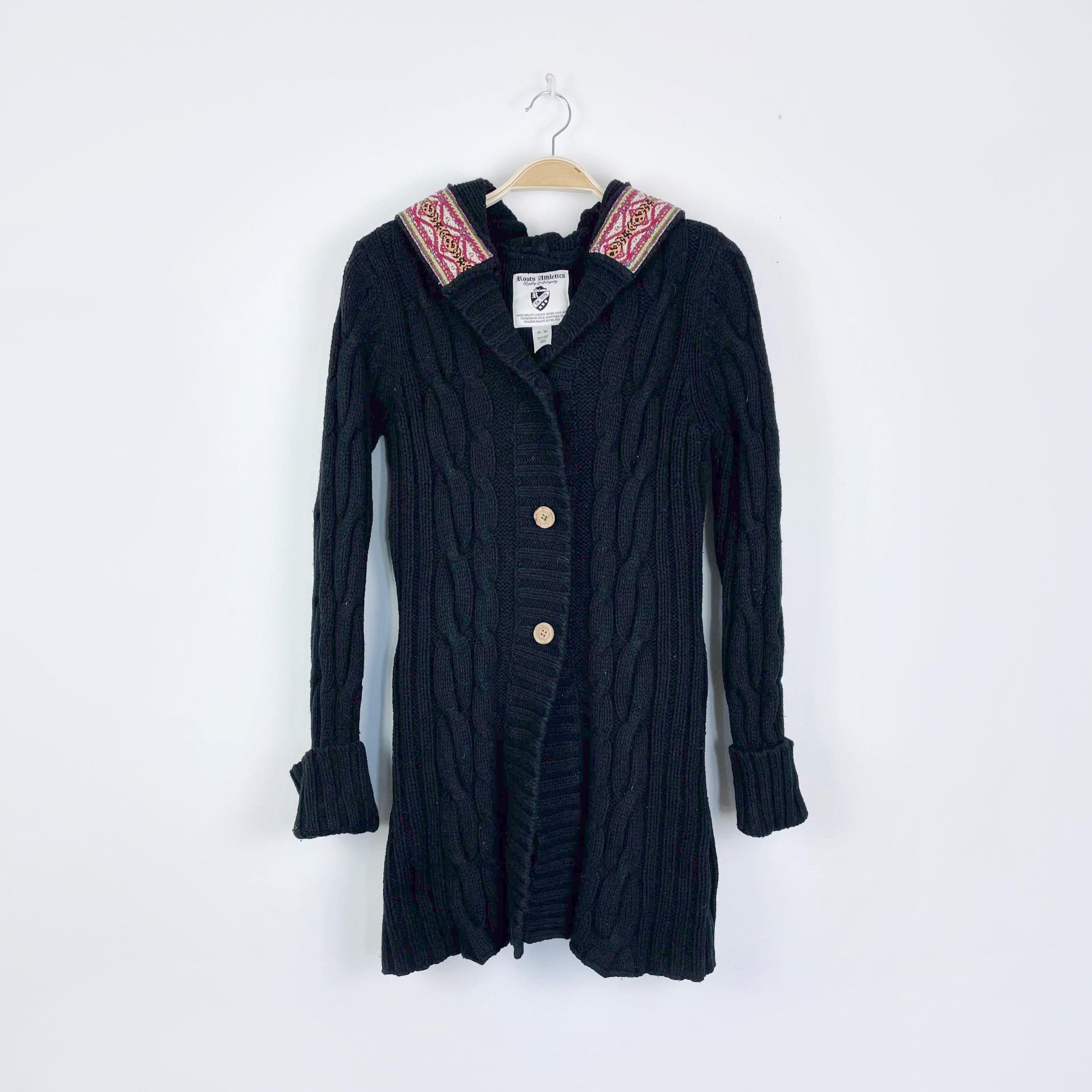 Item description: This mid-2000's knit cardi from Roots features a cable knit with oversized hood and boho woven trim. 80% cotton 20% wool