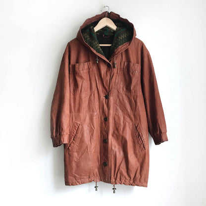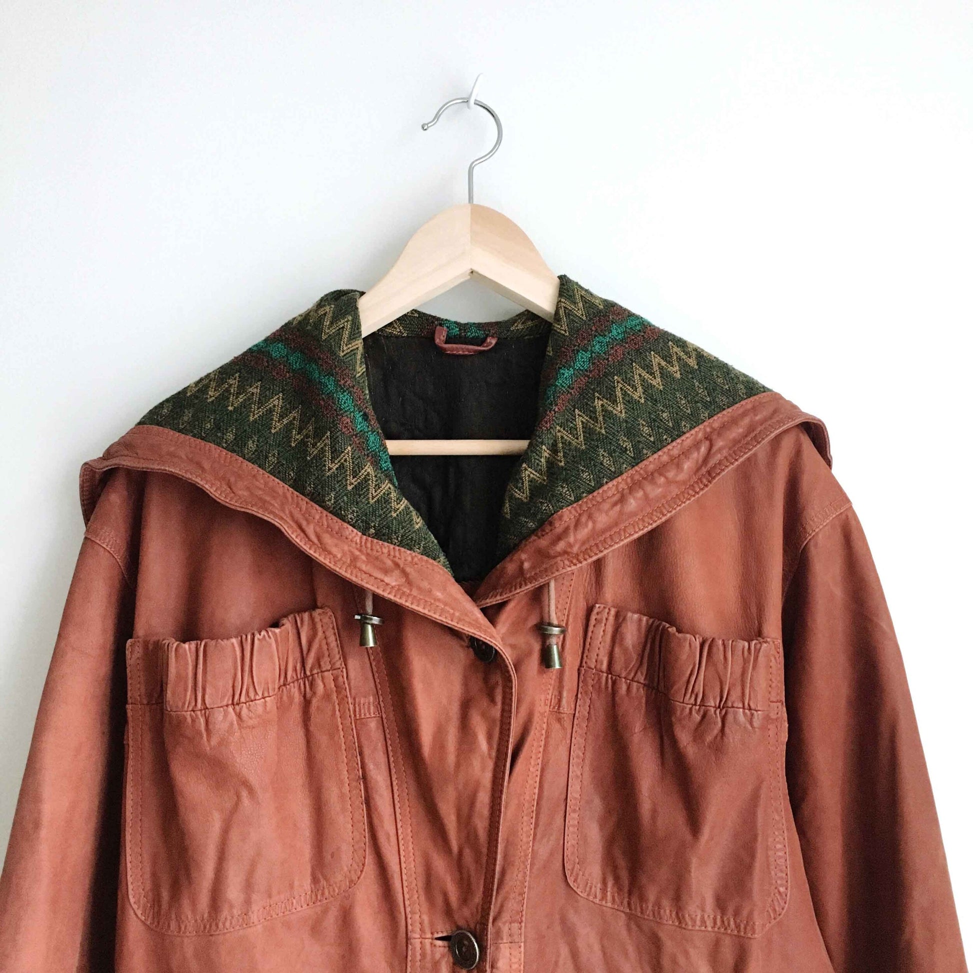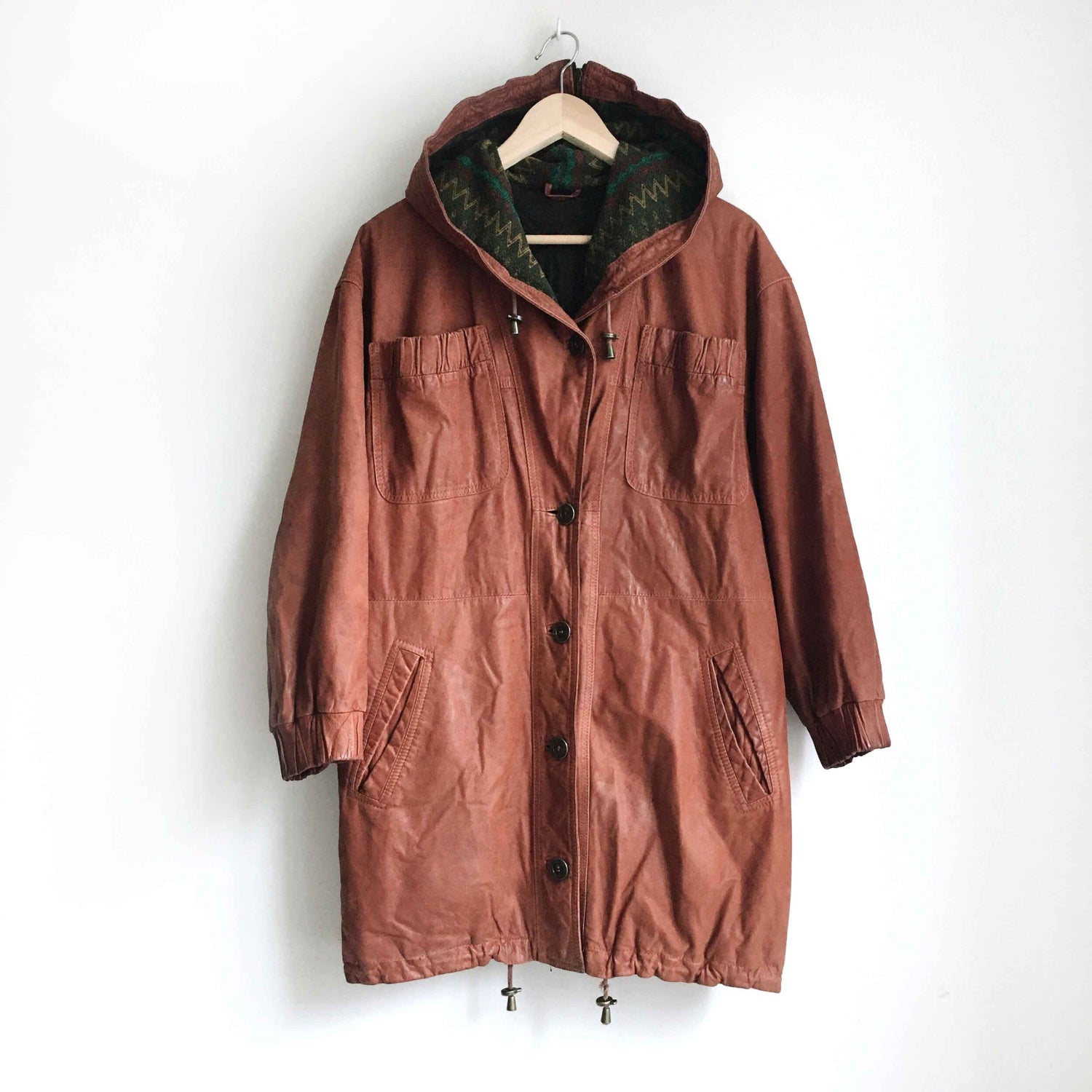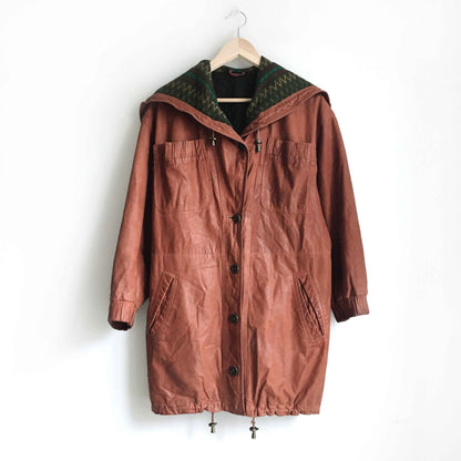 Item Description: This vintage SanDino western leather long jacket is set in a rich terra Arizona dirt colour, and features a wool Navajo print lined hood, ruched pockets and sleeves, drawstring hood and hem, and button down front. 100% leather