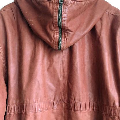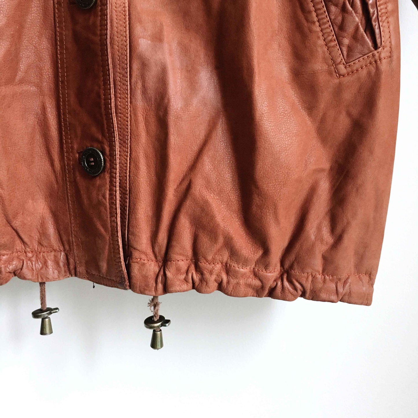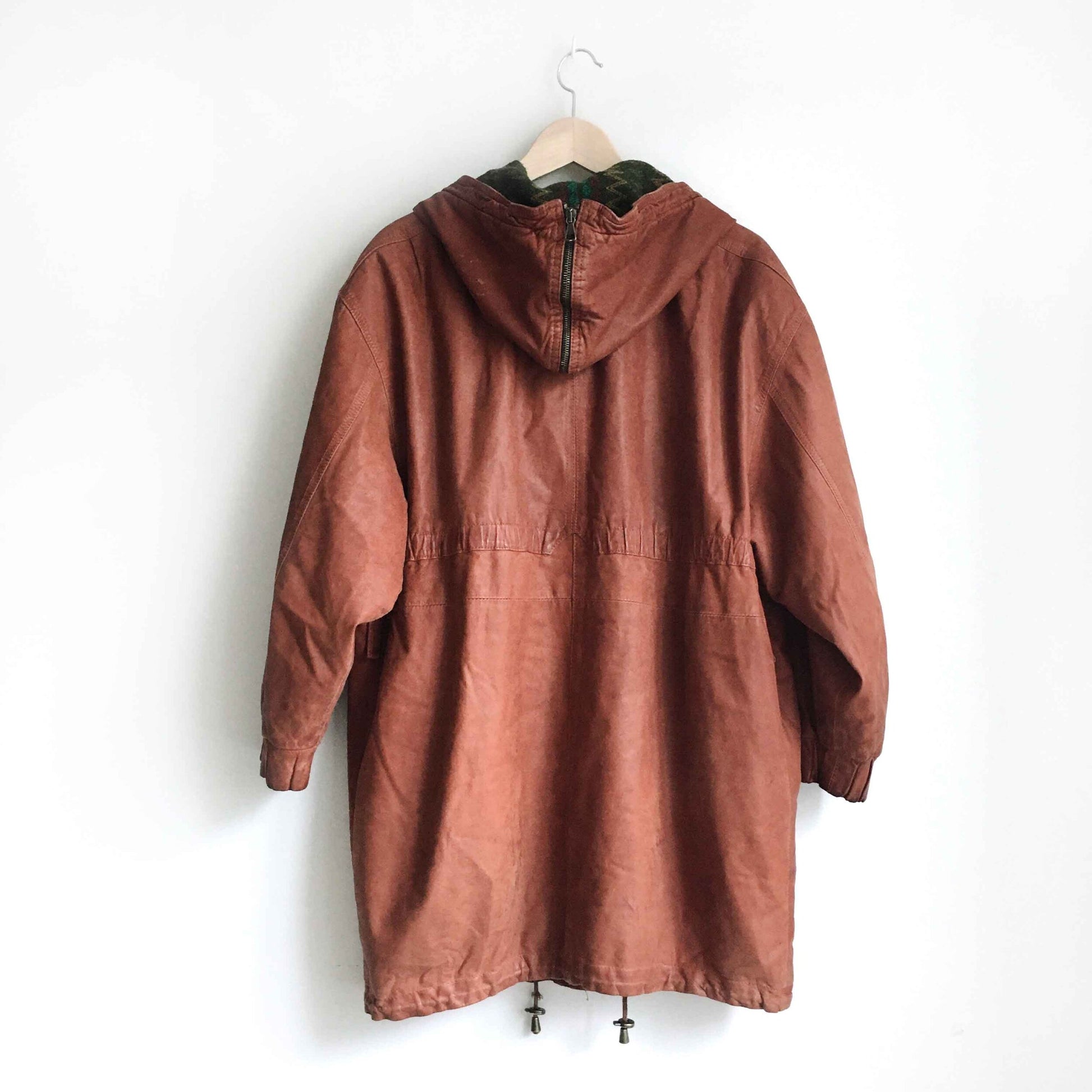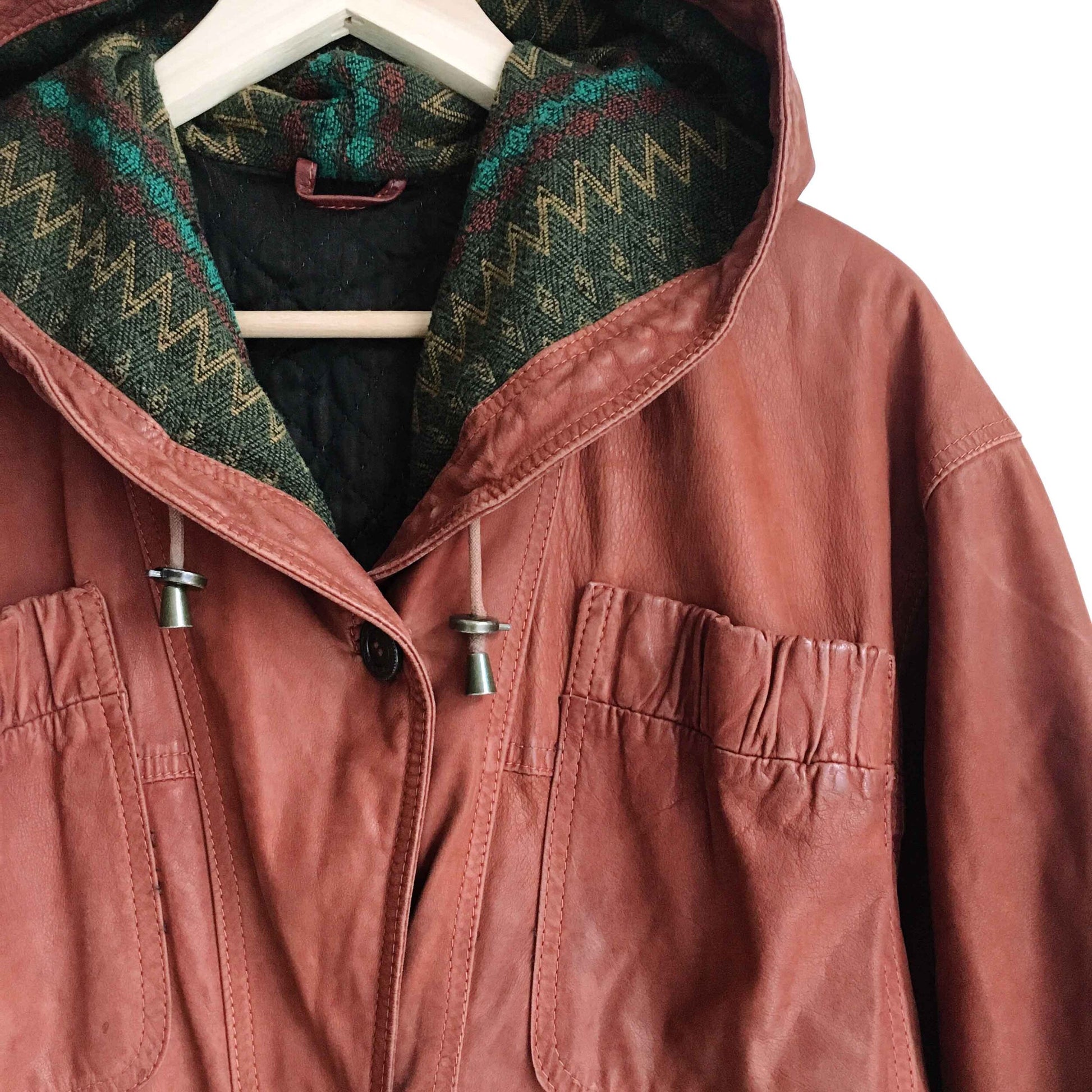 Item Description: This vintage SanDino western leather long jacket is set in a rich terra Arizona dirt colour, and features a wool Navajo print lined hood, ruched pockets and sleeves, drawstring hood and hem, and button down front. 100% leather