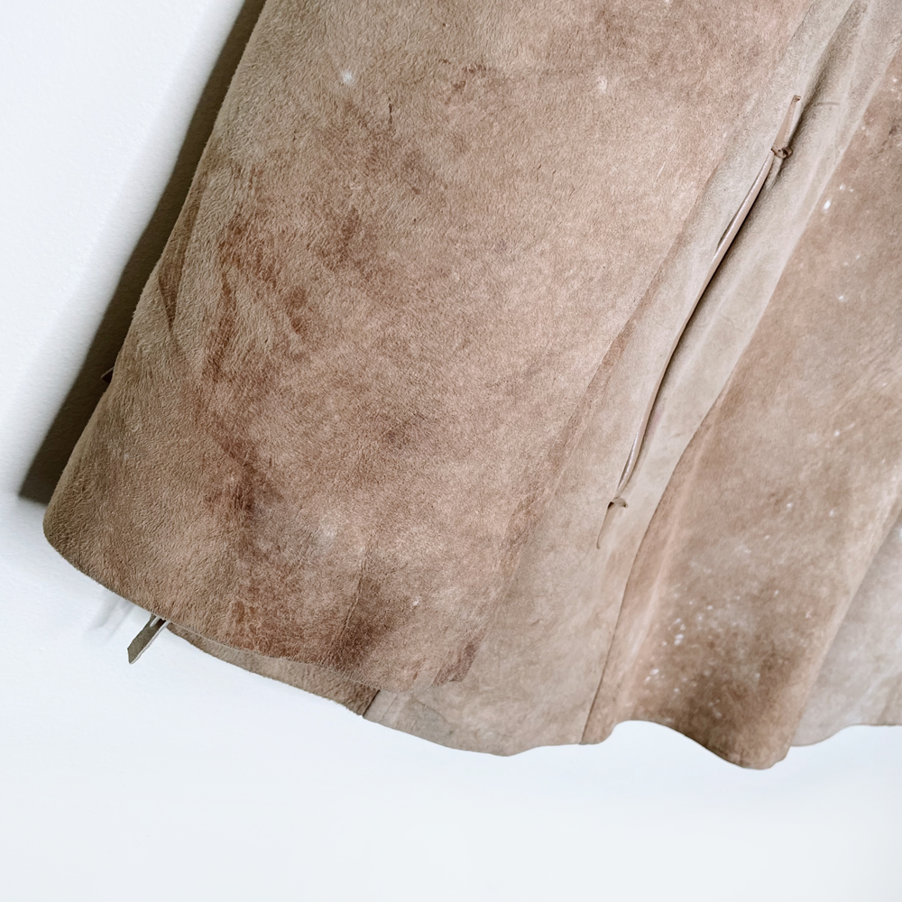 Item Description: This super gorgeous vintage leather jacket has all the western, boho, rancher vibes you could dream of. Naturally distressed brushed leather panelled and trimmed with long fringe. 100% leather