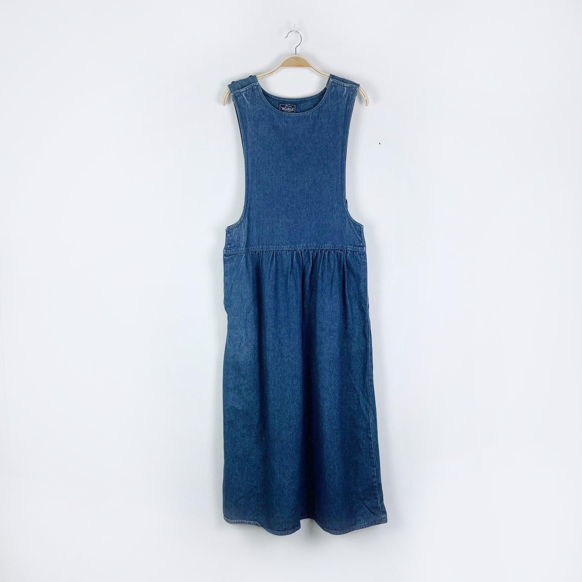 Measurements: 18" across waist (where bib meets skirt seam) 19" shoulder to waist seam, 52" shoulder to hem