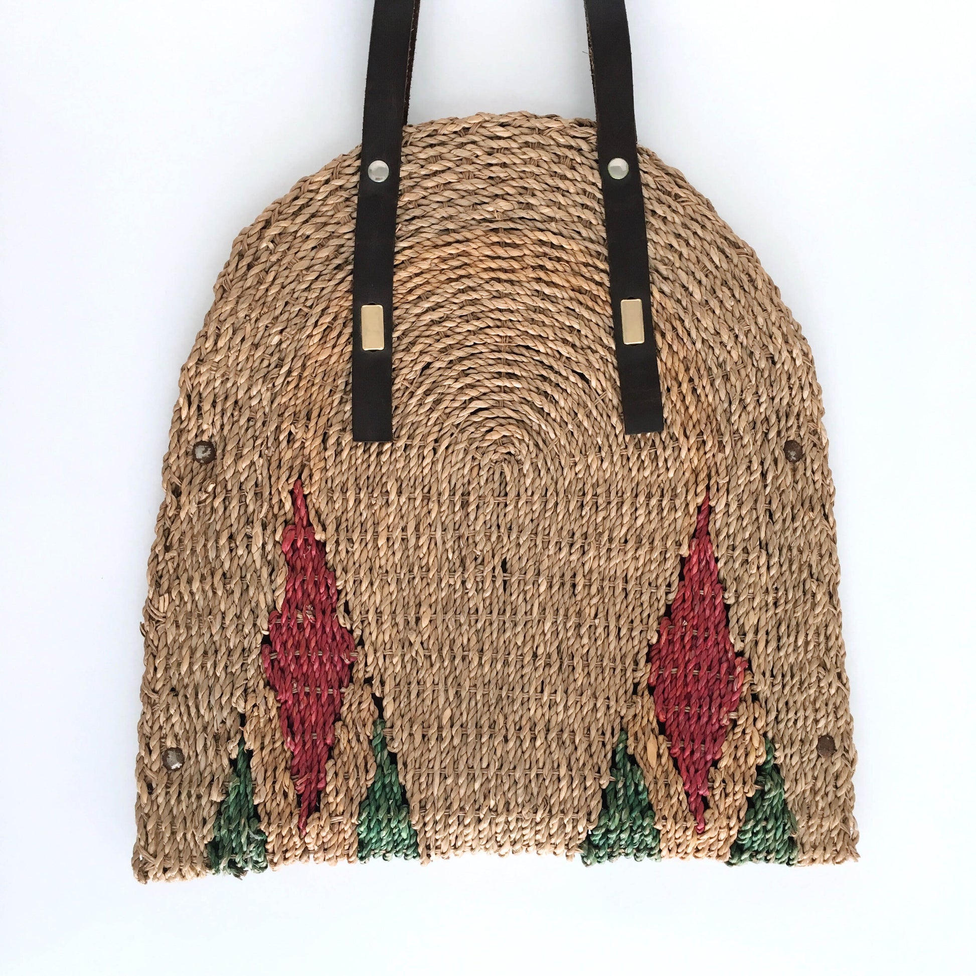 Item Description: This simple fold and bolt woven bag features leather straps and a woven in red and green diamond pattern that wraps around the bottom.