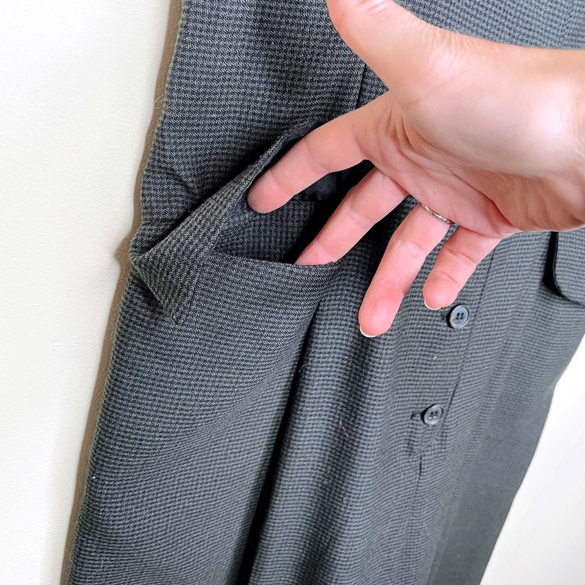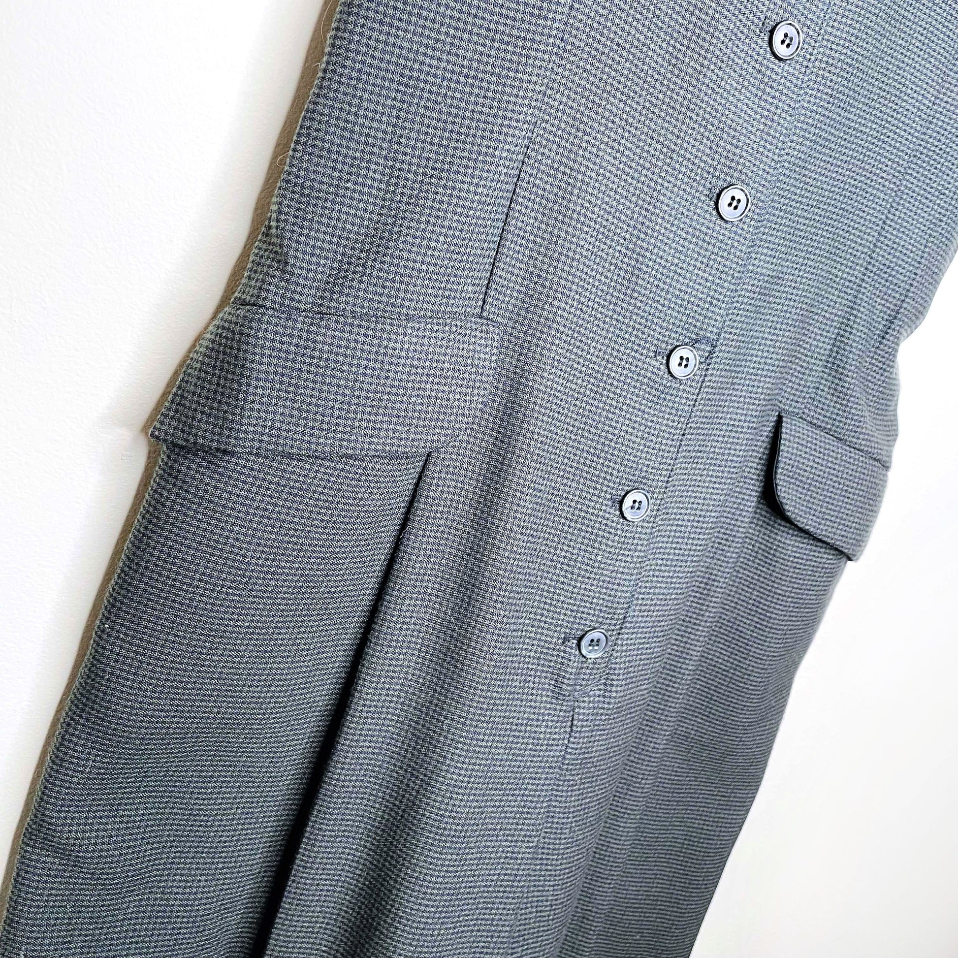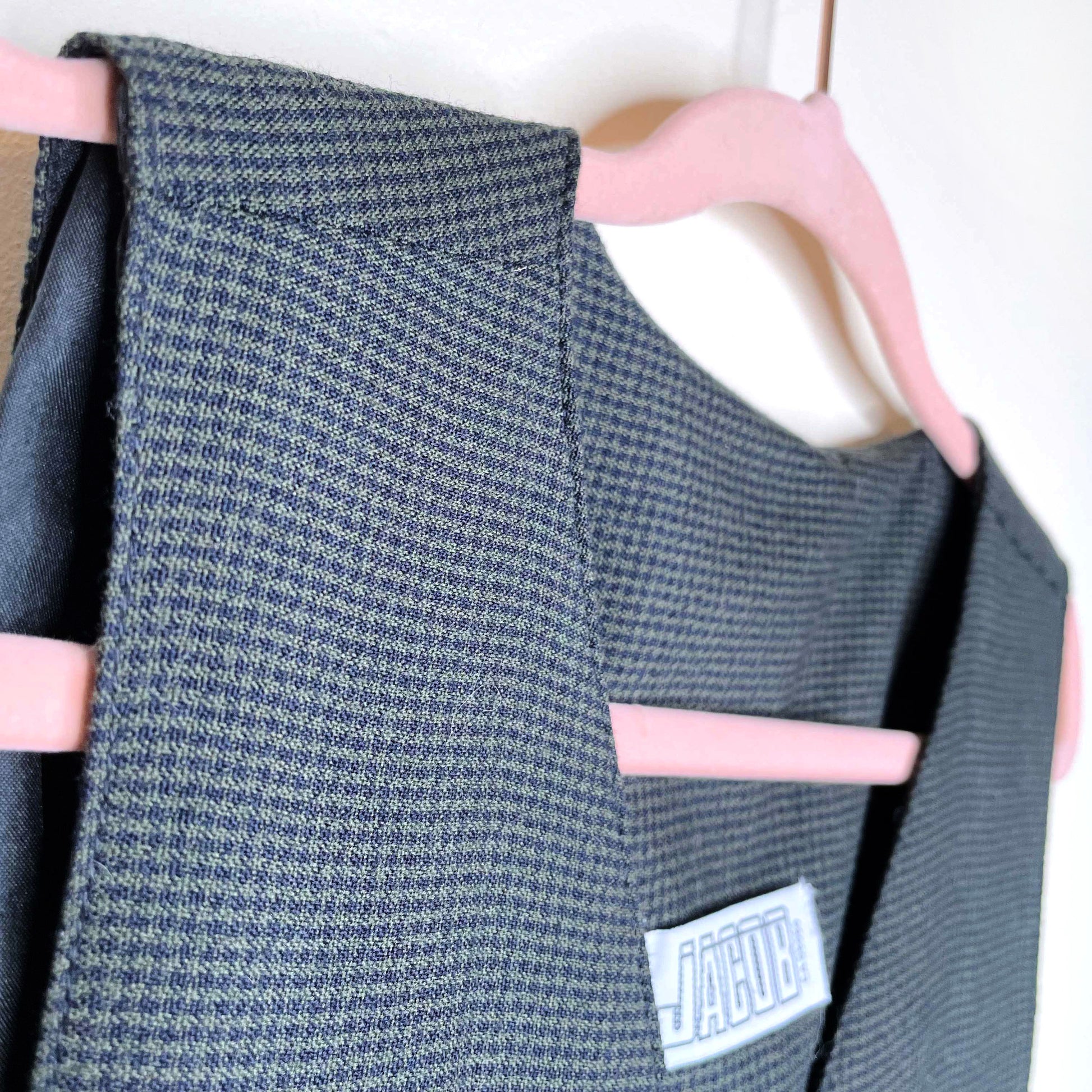 Item Description: This menswear inspired jumpsuit from Jacob is the perfect y2k outfit - a little school preppy look, a lot of Monica from Friends. A micro houndstooth plaid pattern tops off this truly one of a kind piece. 65% polyester 35% viscose