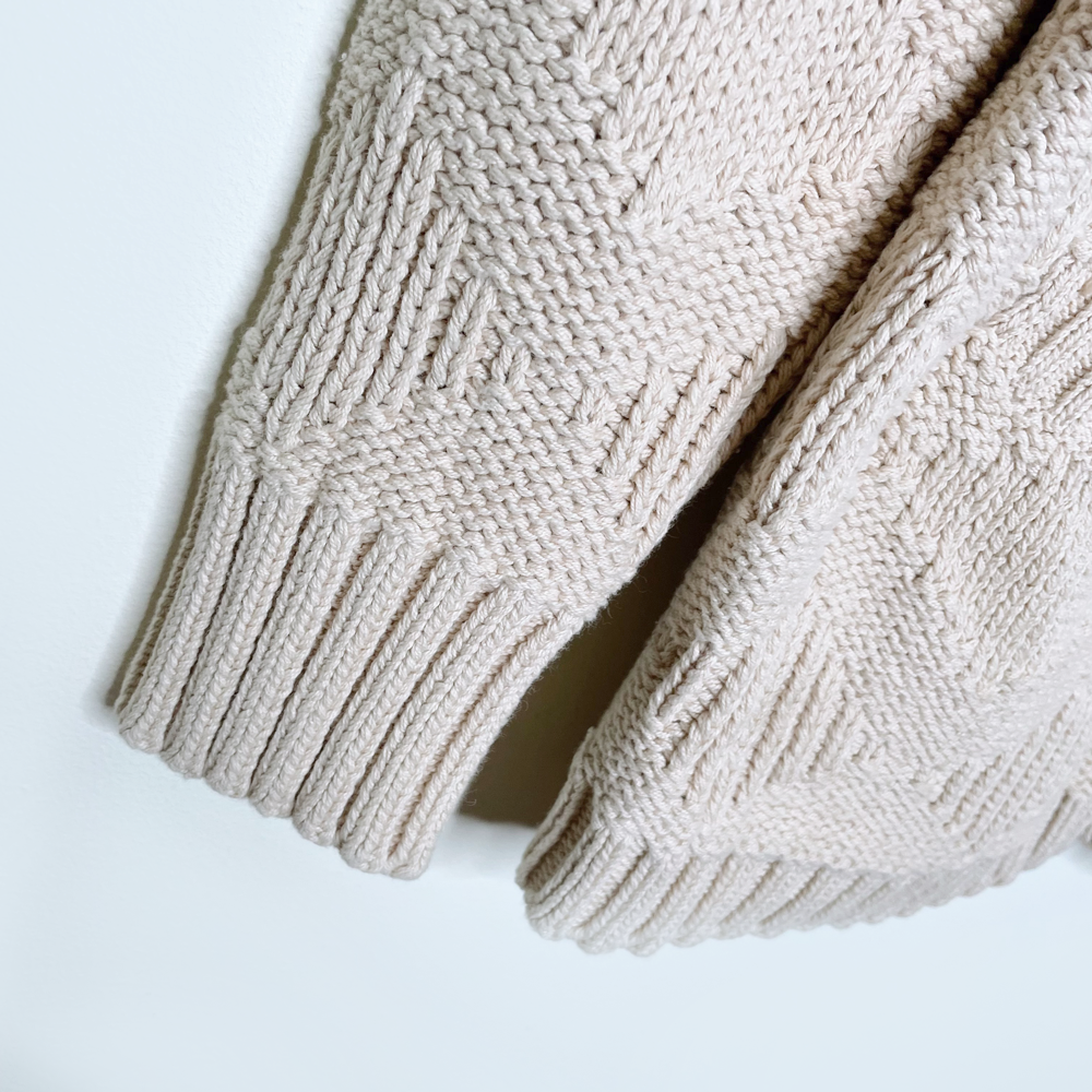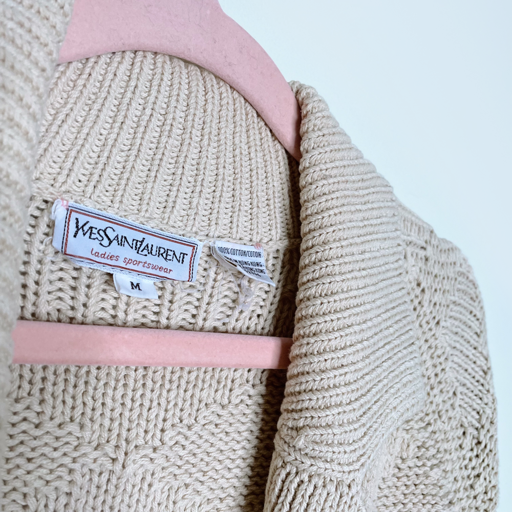 Item Description: This chunky knit cardigan from Yves Saint Laurent features a diamond weave in a cream hue with gold button closure. 100% cotton