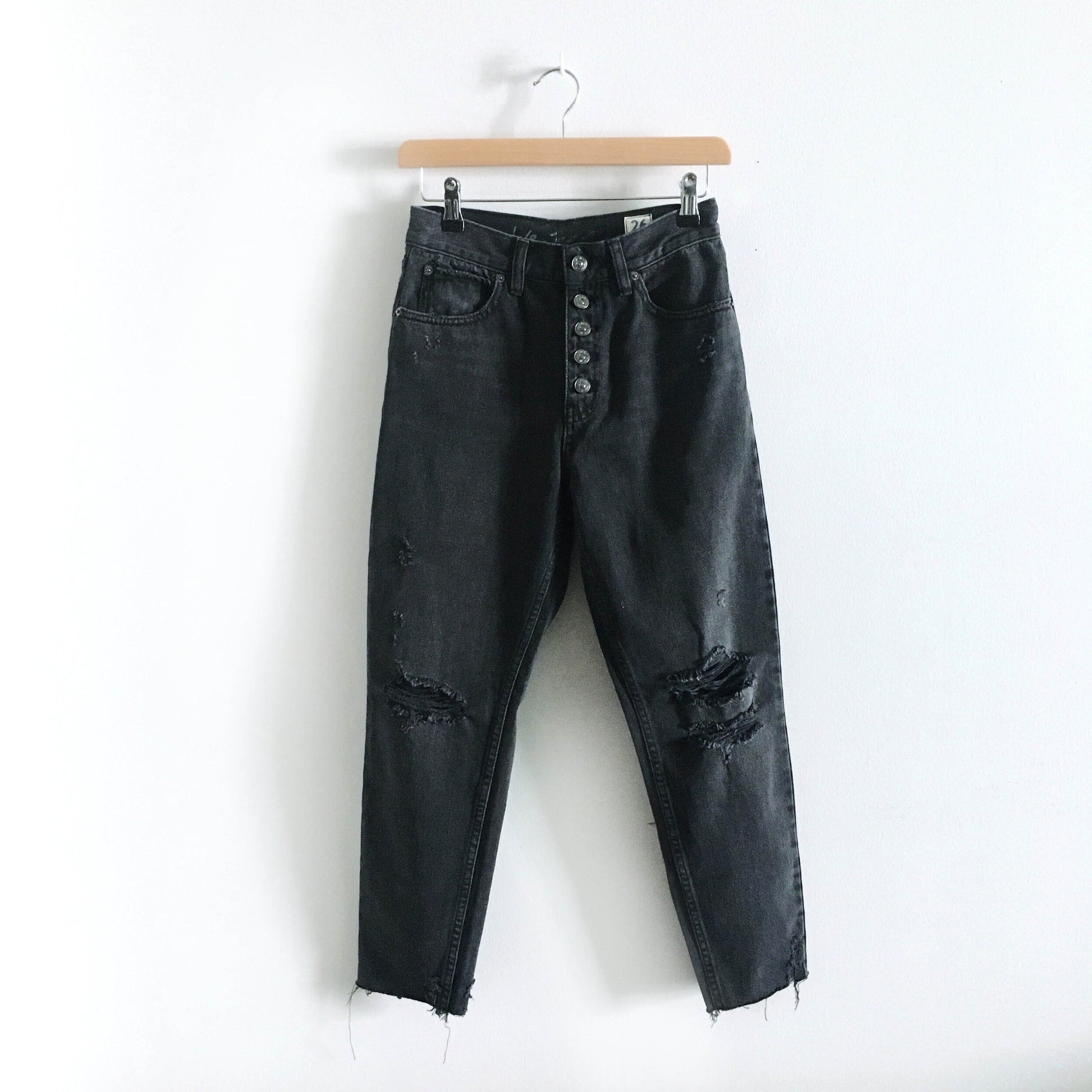 Item Description: In a skinny silhouette, these jeans feature allover distressing, rips, and tears. Rigid denim. Raw hem. High-rise. Five-pocket style. Exposed button fly. 100% cotton