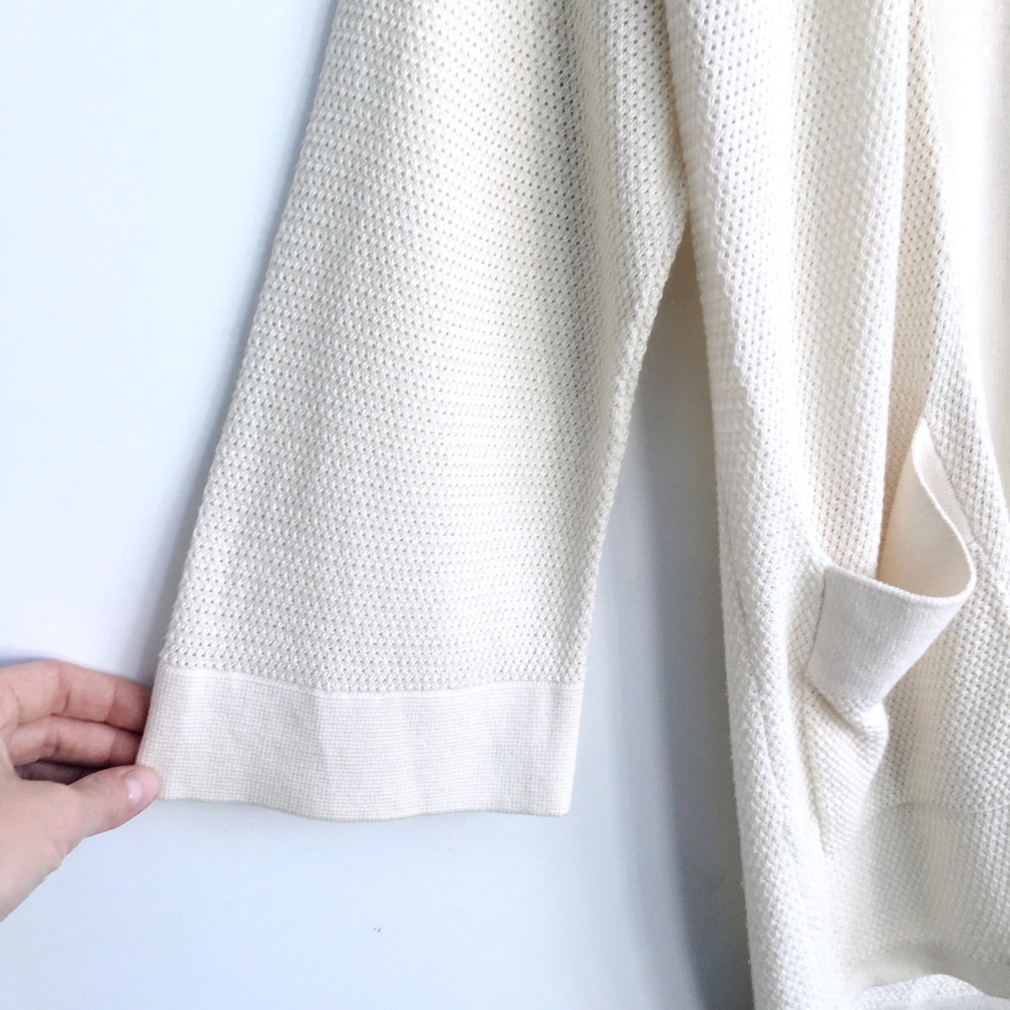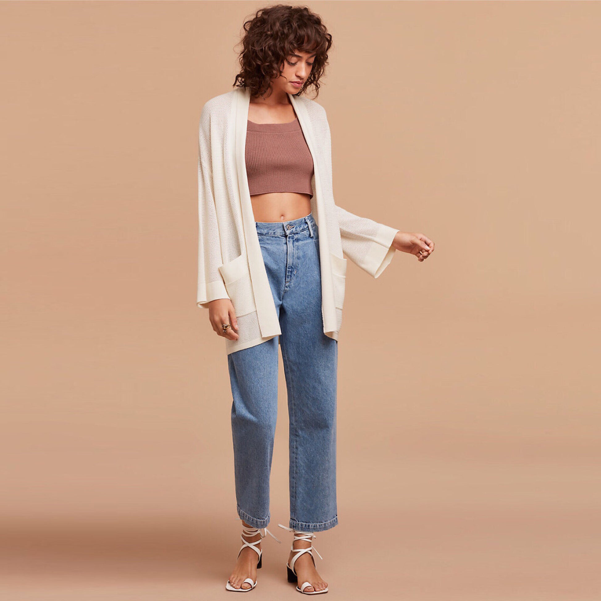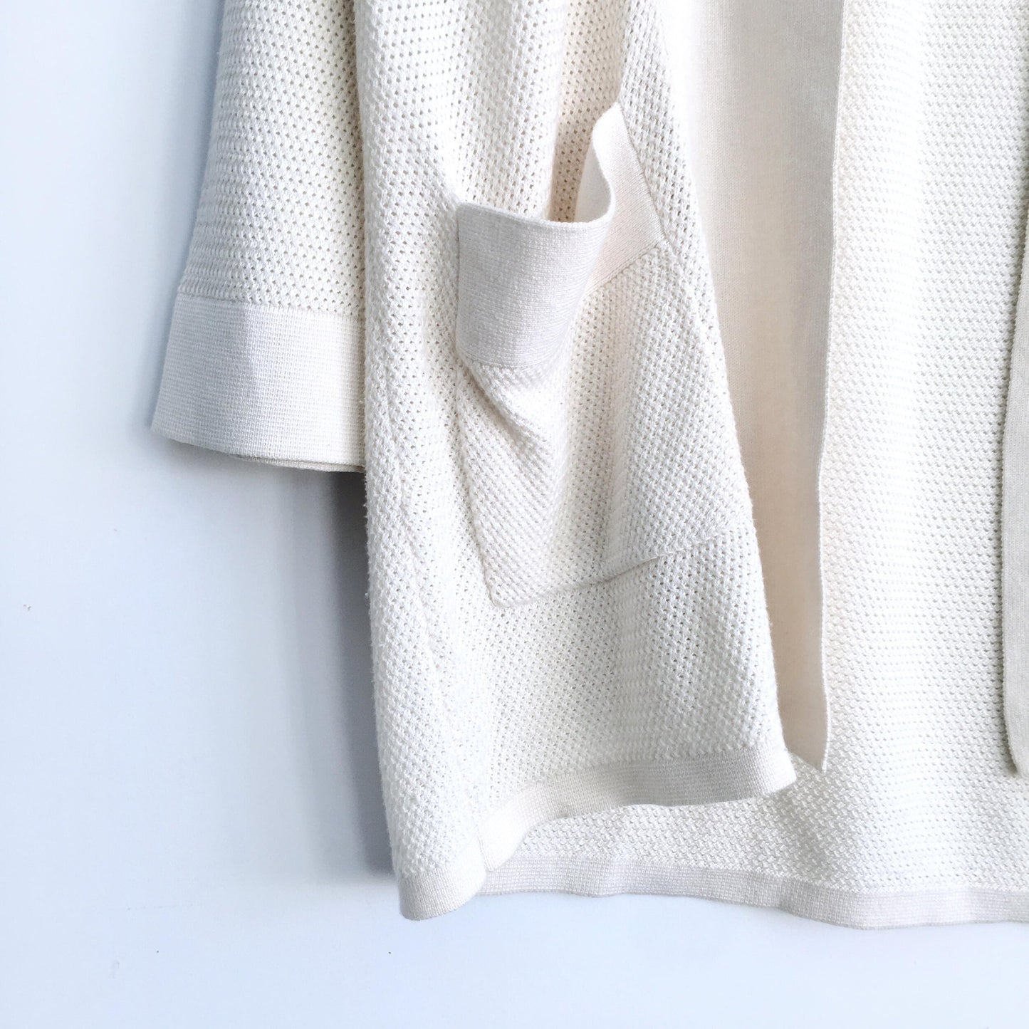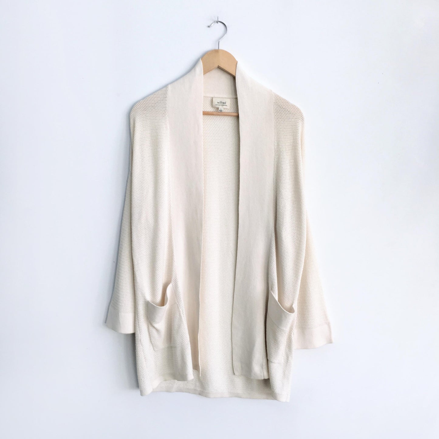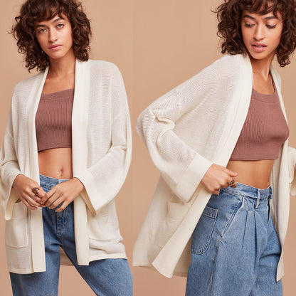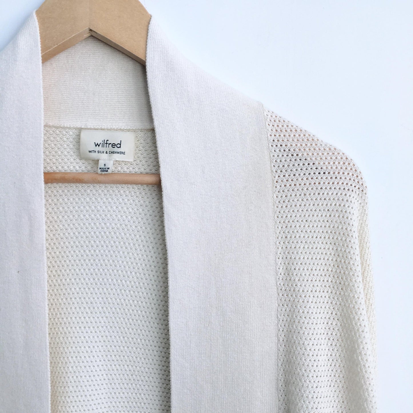 Item Description: A delicate blend of silk and cashmere, this kimono style open cardigan from Aritzia features a beautiful texture, front well pockets and effortless style. 56% silk 38% cotton 6% cashmere