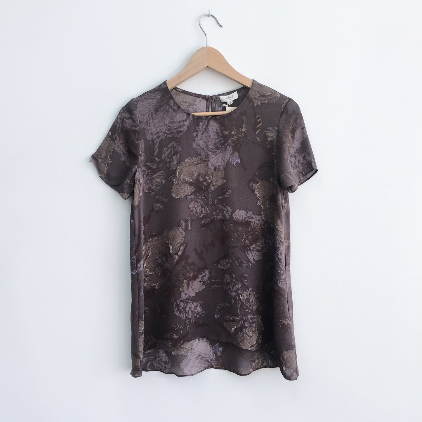 Item Description: 100% silk short sleeve NEW WITH TAGS blouse with floral pattern and hi lo hem in Modern Taupe.