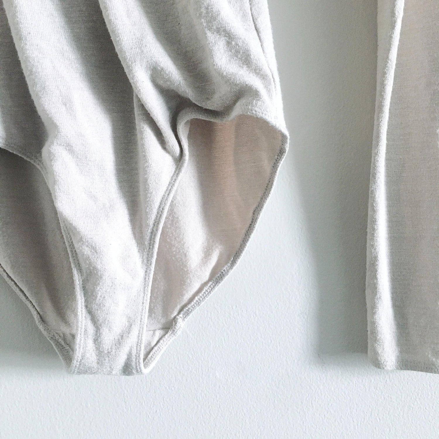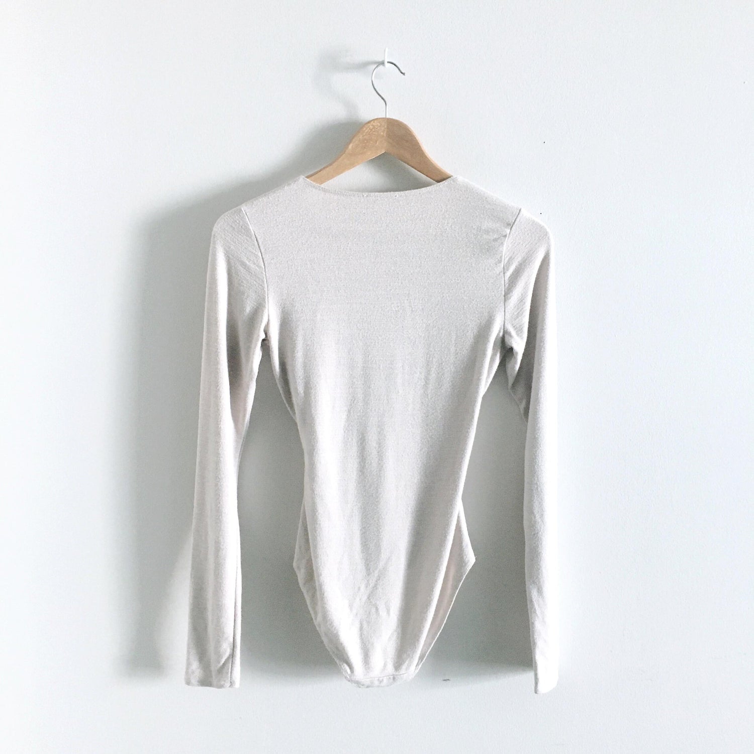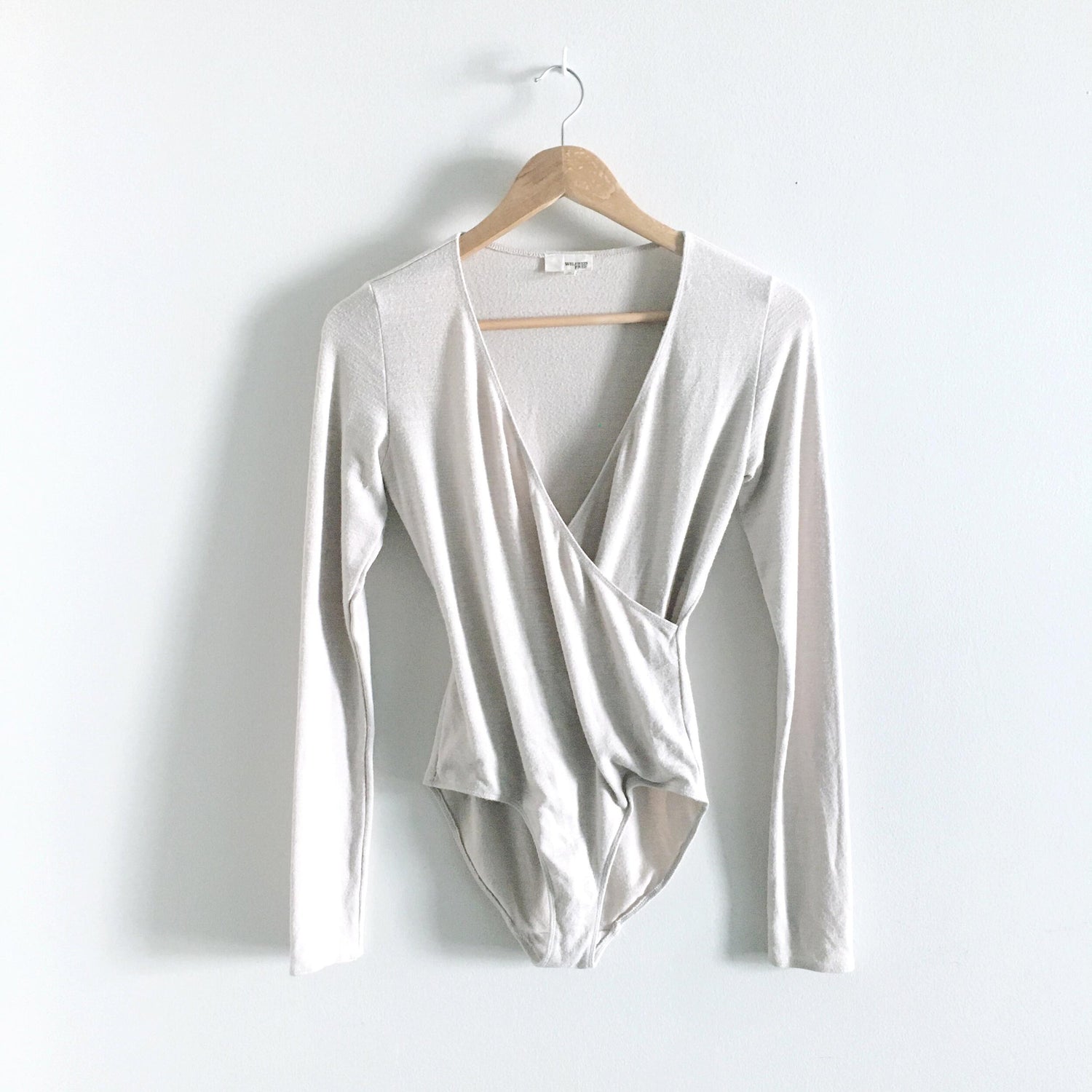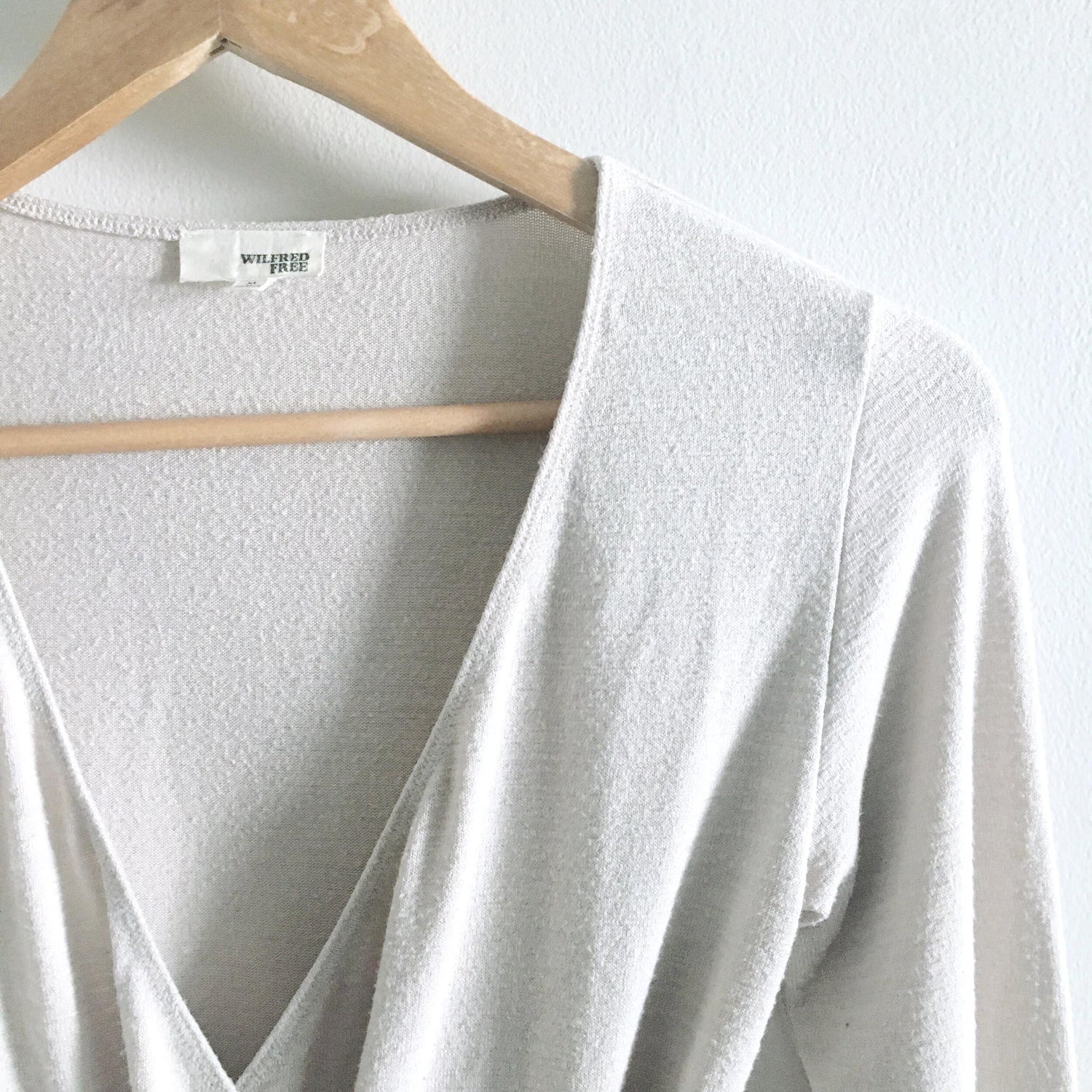 Item Description: A soft and highly stretchy suit from Wilfred Free, this faux wrap style front is ultra flattering - comfortable cut at hips keeps hidden below mid to high waist jeans. No button closure. Colour: Off-white heather
