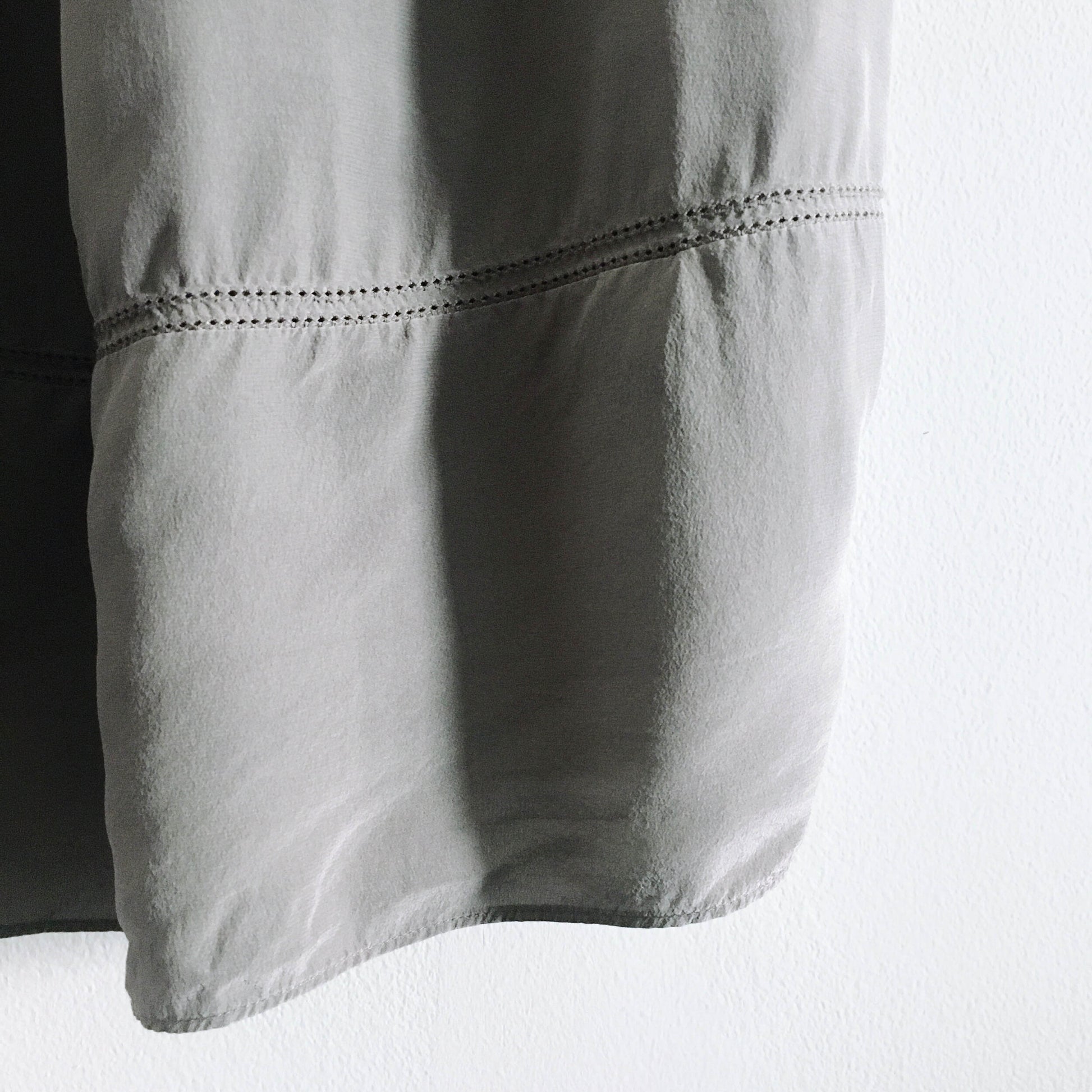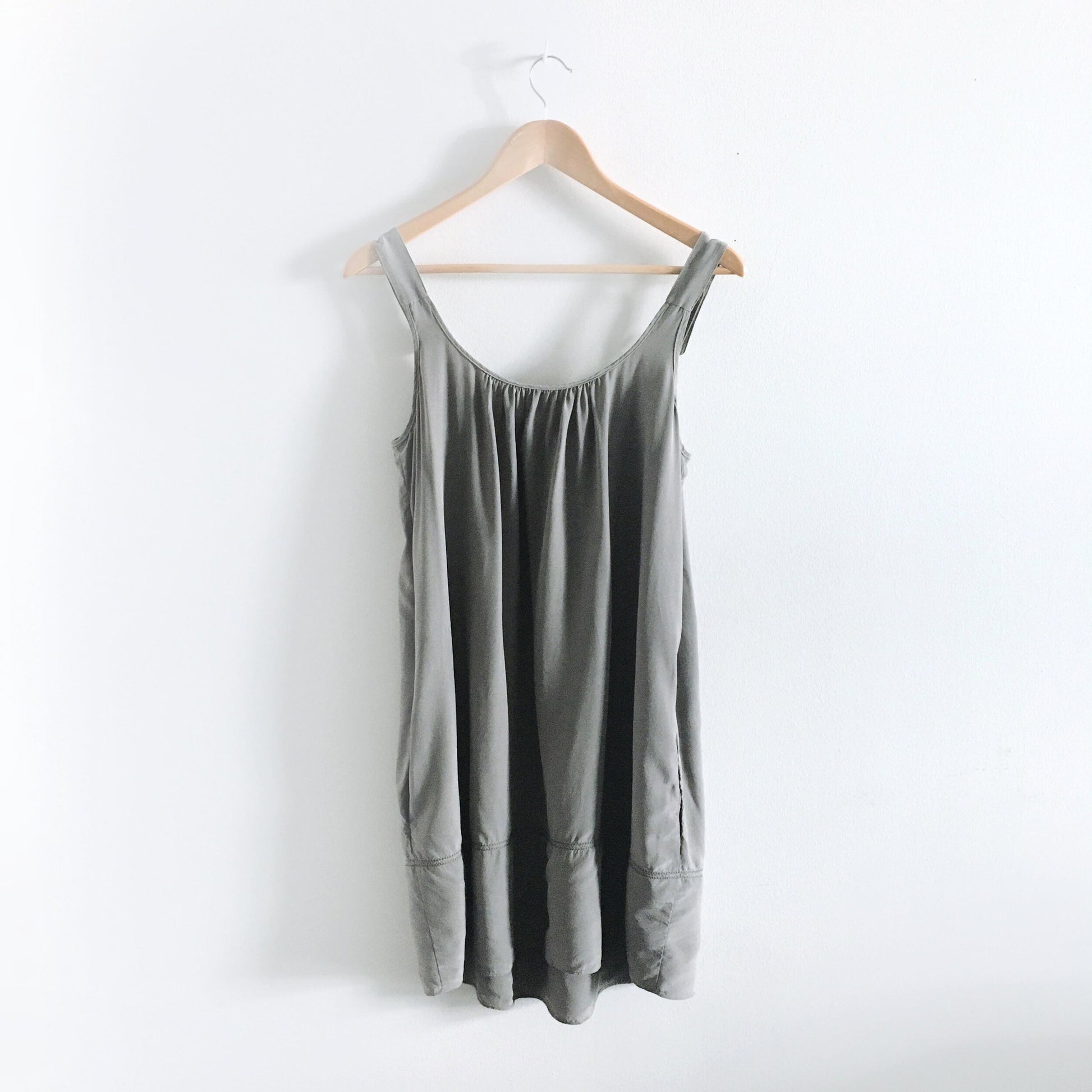 Item Description: A grey silk dress from Aritzia with metallic thread, two metallic button adjustable shoulders, and side pockets. 100% silk