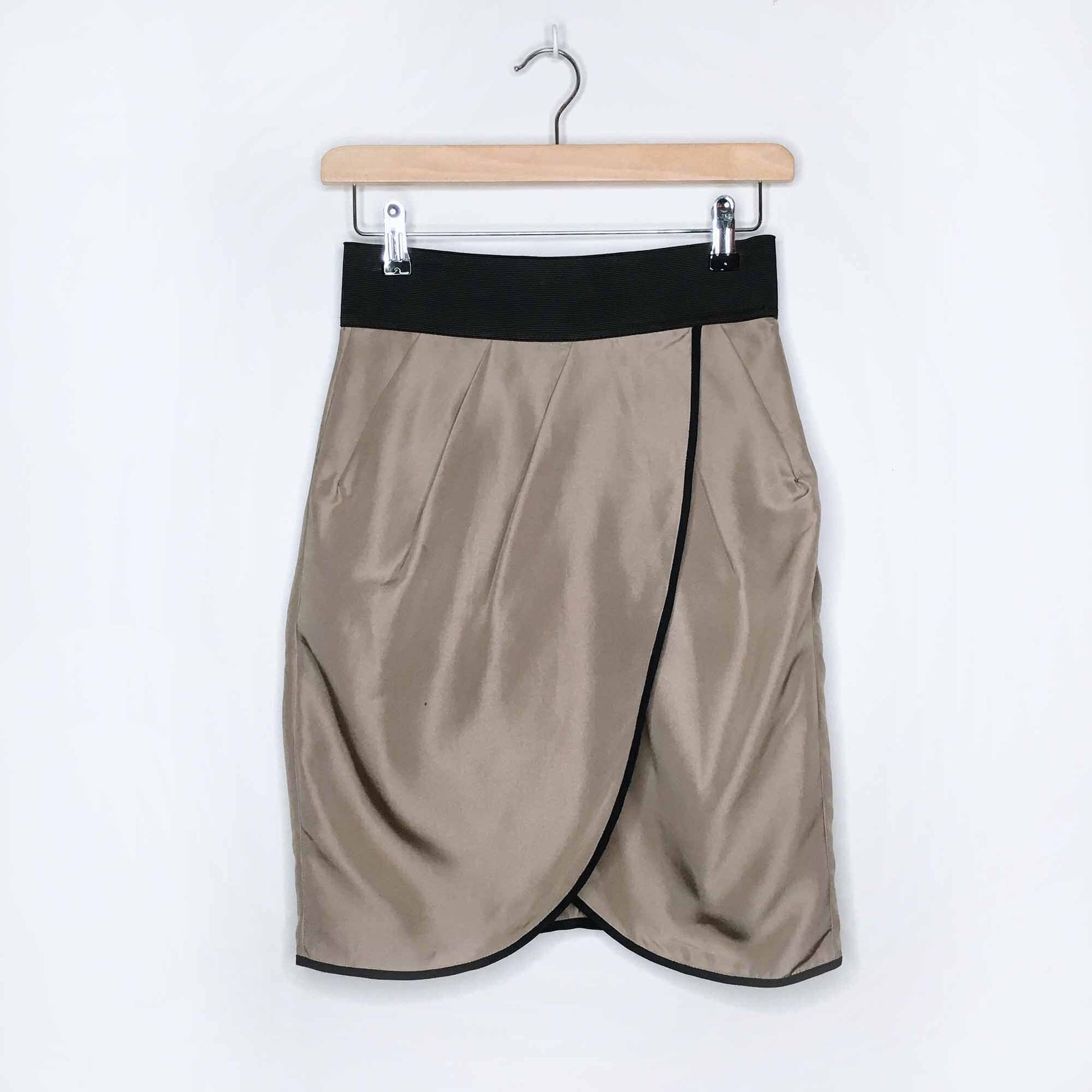 Item Description: This faux wrap skirt from Wilfred features a silk taffeta shell with a thick black elastic waistband, black contrast trim, and zipper back closure. 100% silk