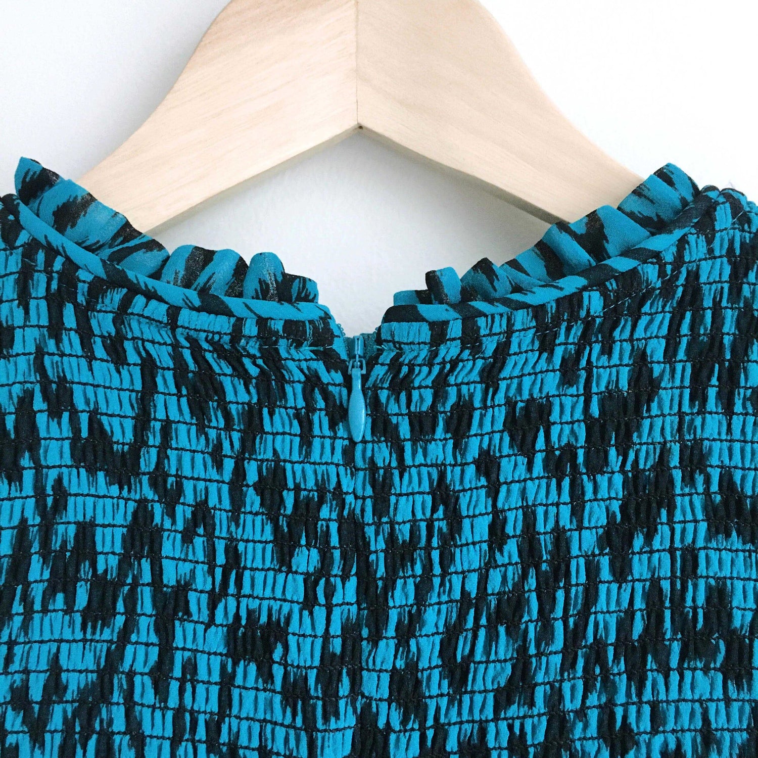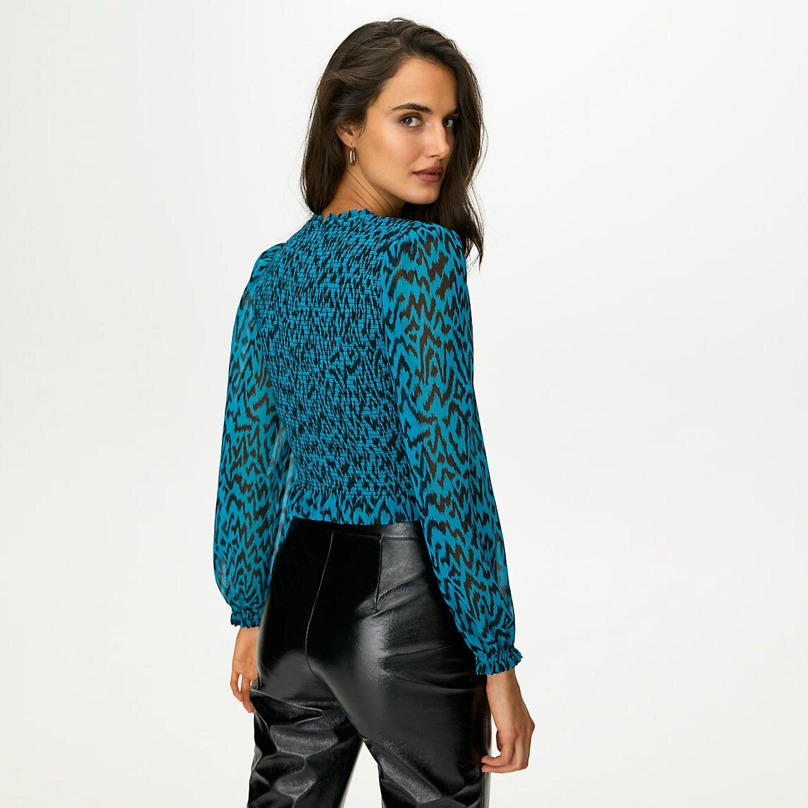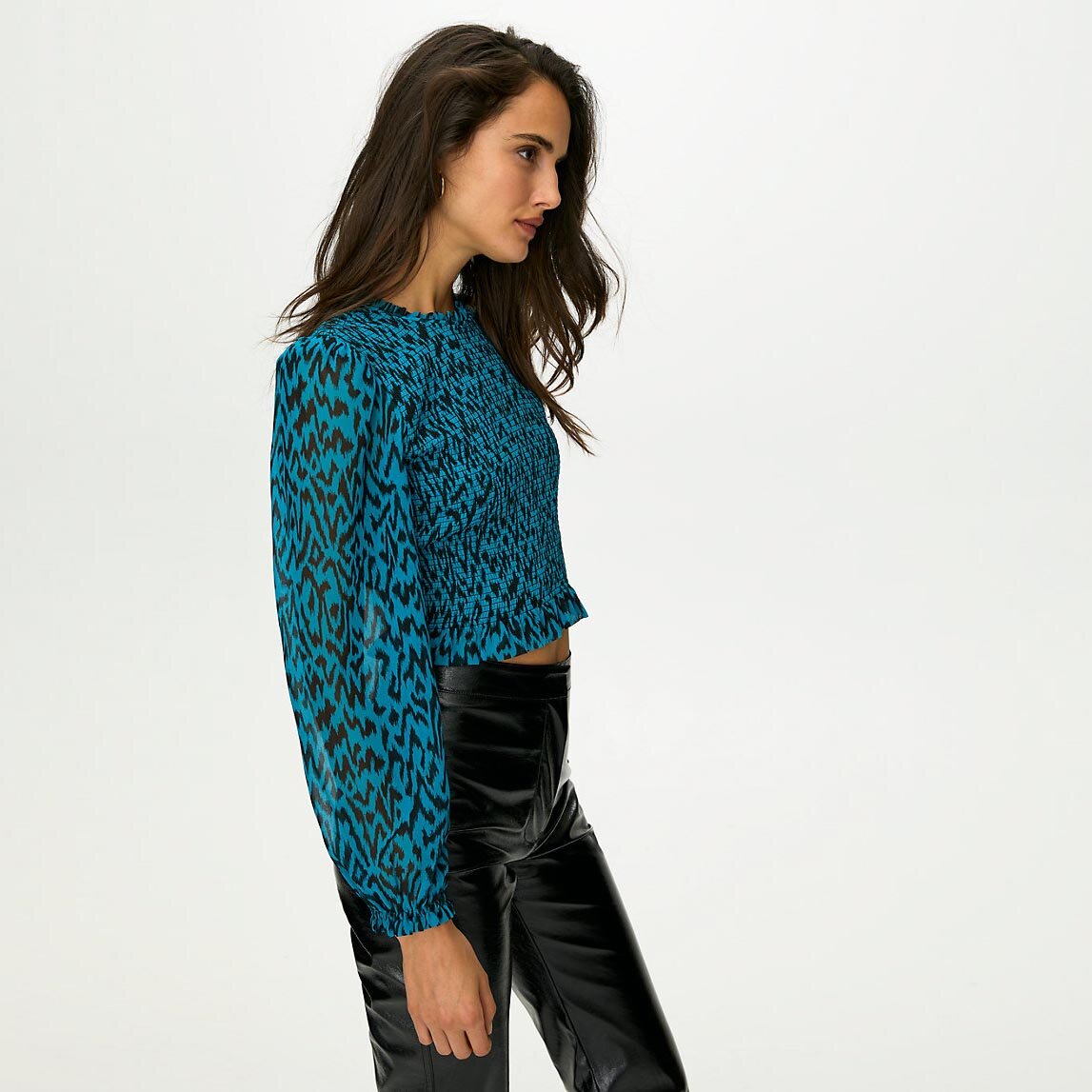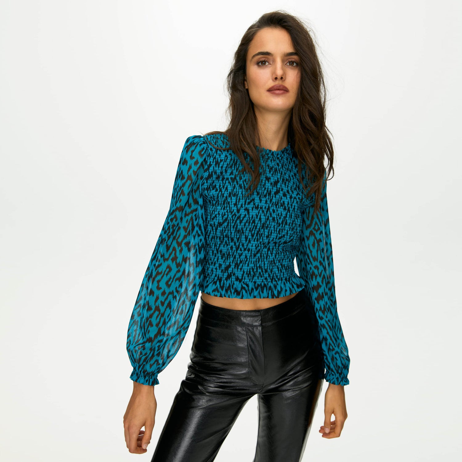 Item Description: This is a cropped blouse with a smocked bodice, a ruffled hem and princess sleeves. It’s made from sheer chiffon with a crepe texture, in an animal print that’s exclusive to the brand. 100% polyester