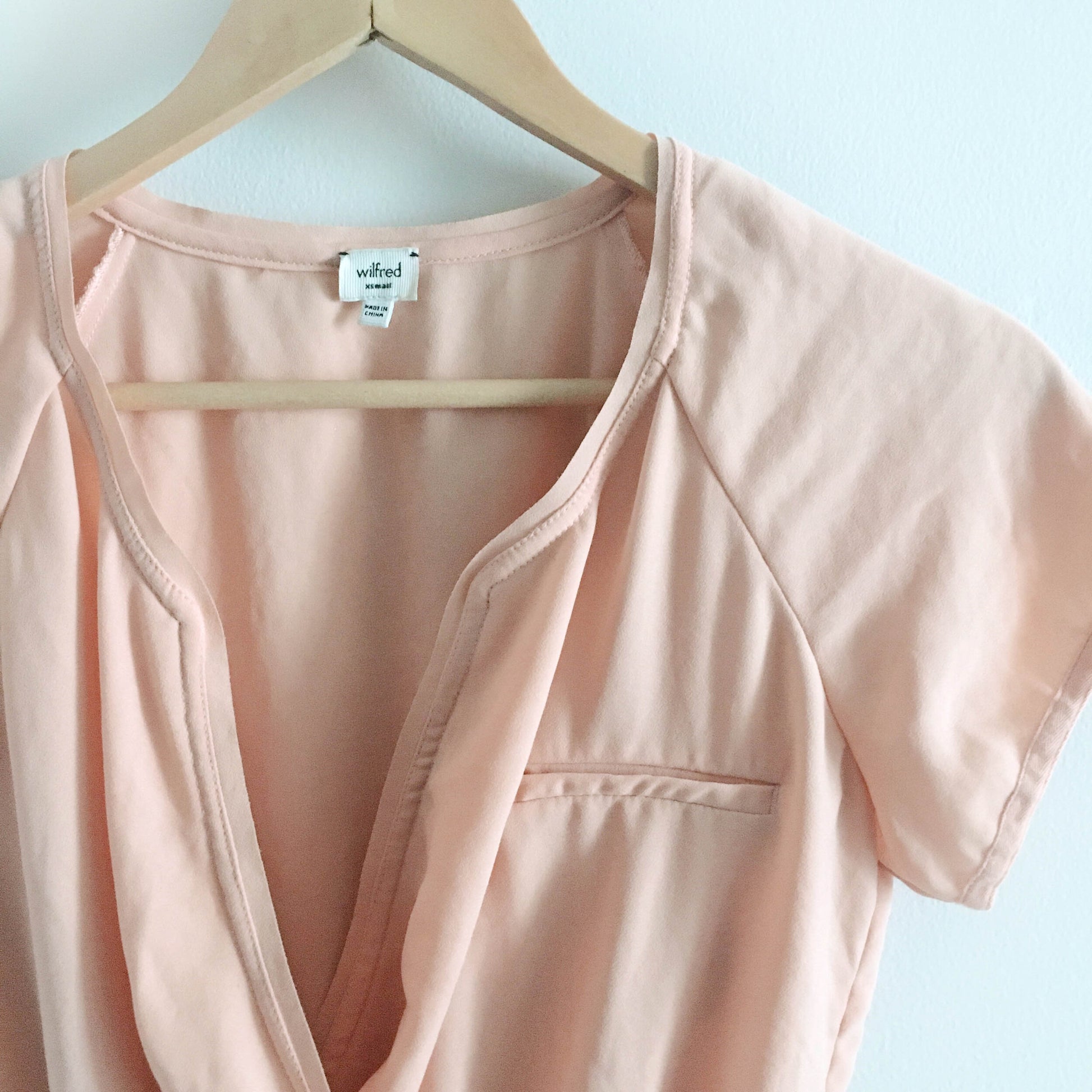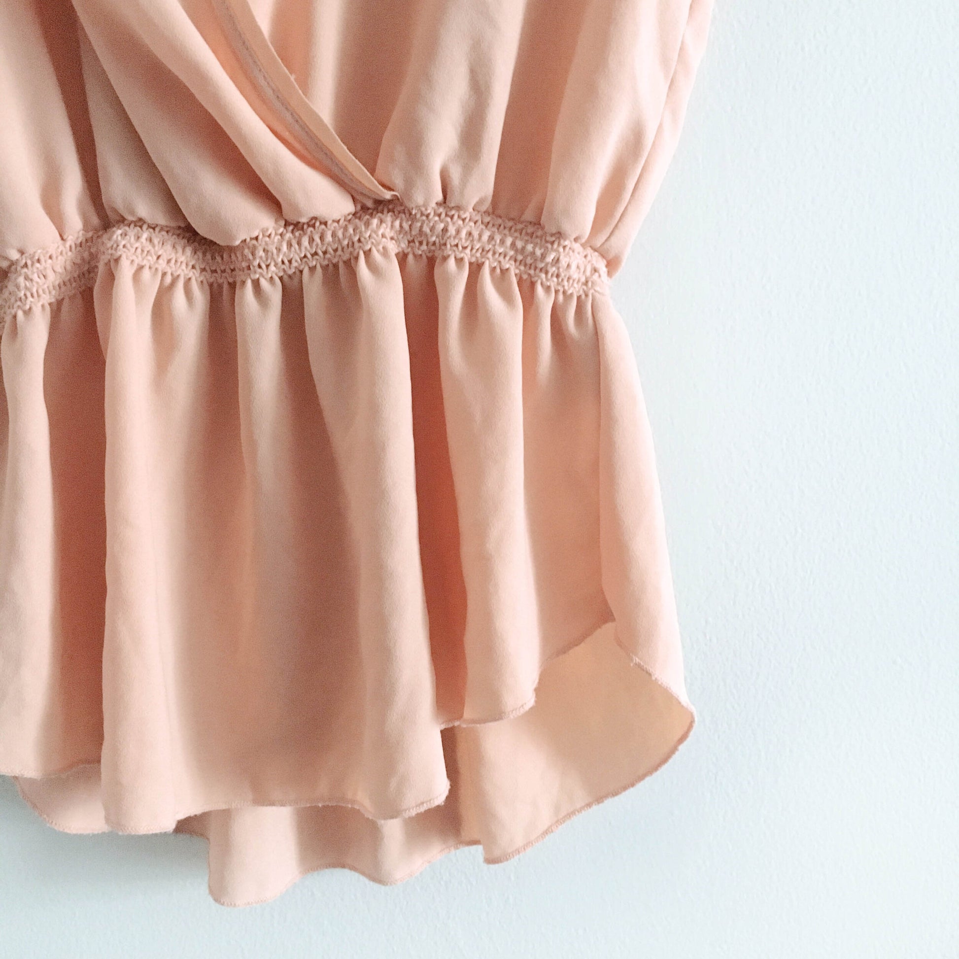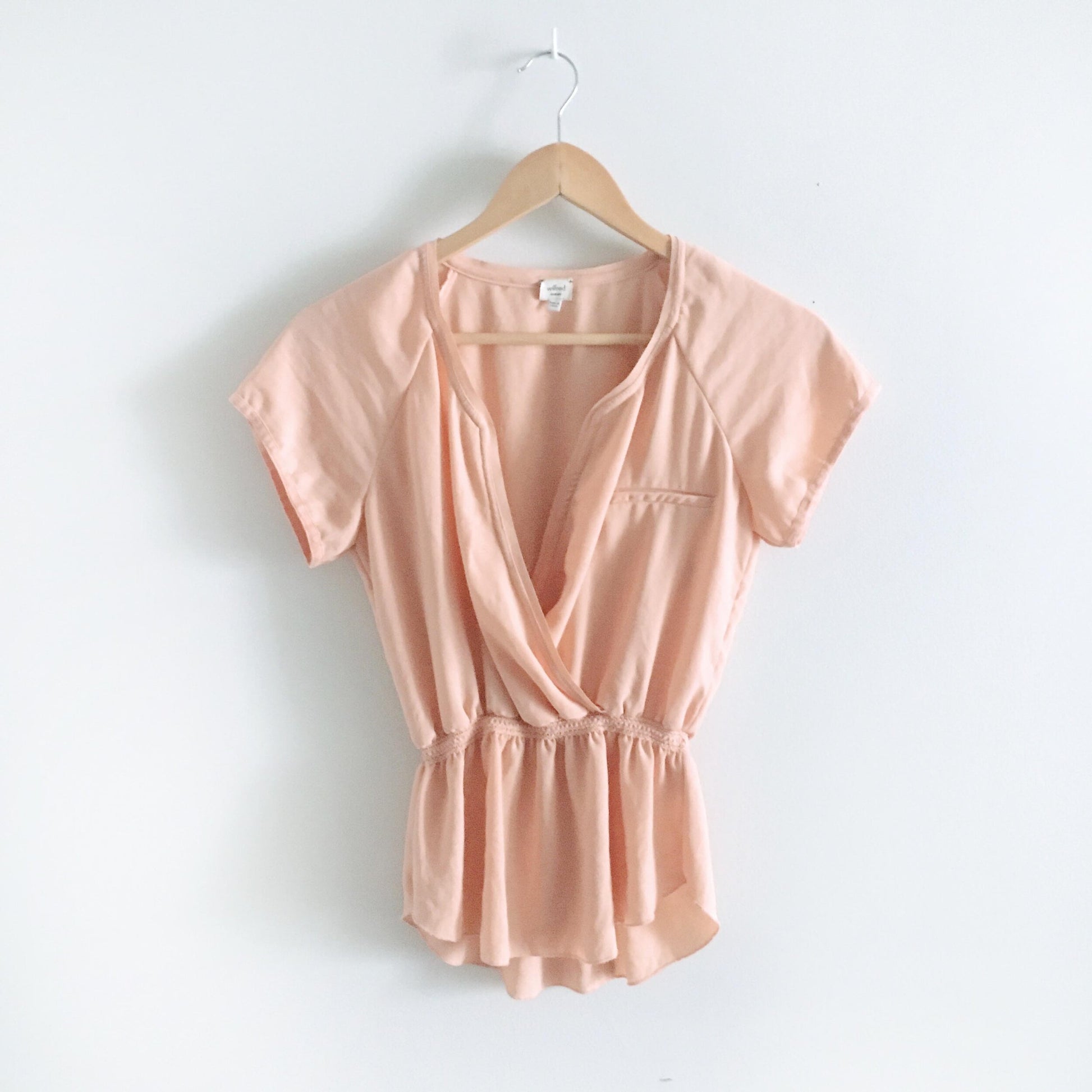 Item Description: Snag this delightful peach blouse fro Aritzia with open faux wrap front, elastic waist and peplum hem! 100% polyester
