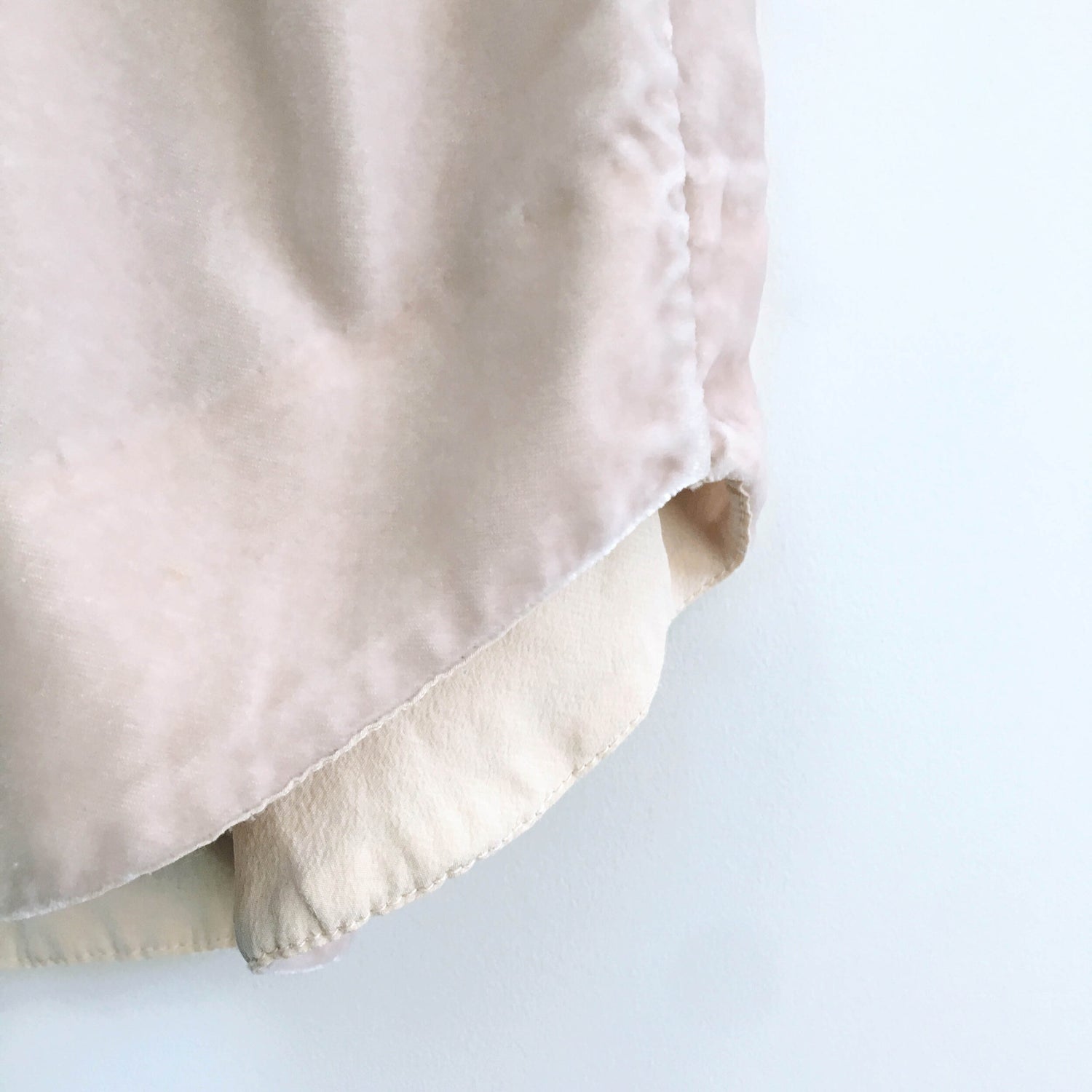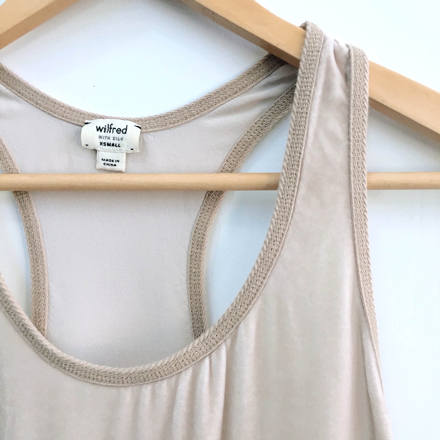 Item Description: An elegant and luxurious silk velvet tank from Aritzia trimmed with cord and set in a light champagne colour. 80% silk 20% rayon
