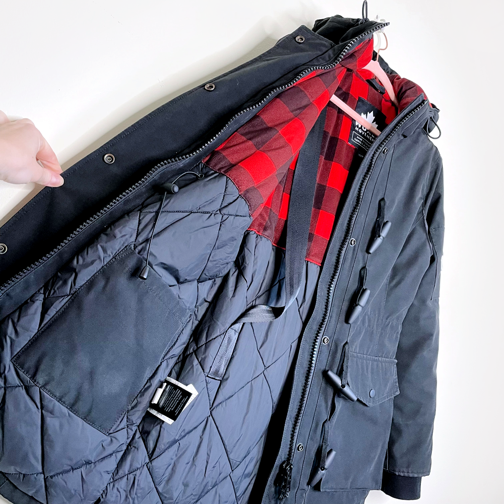 Item Description: Sustainably made in Canada and with all recycled materials, Wuxly movement is making waves all over the world with their warm winter gear. The doe parka is one of their classics - water repellant and snow proof, backpack straps, animal free and adjustable waist.