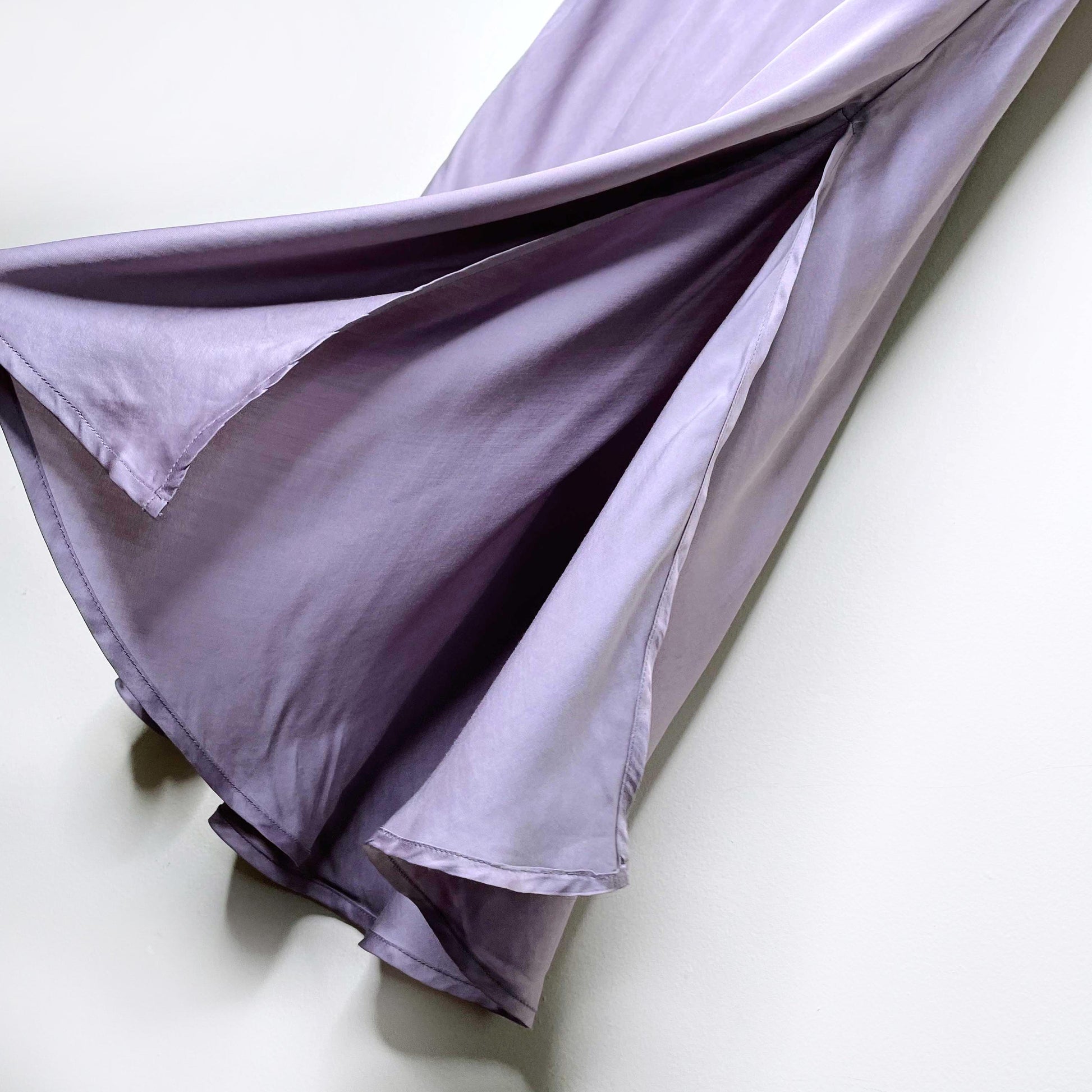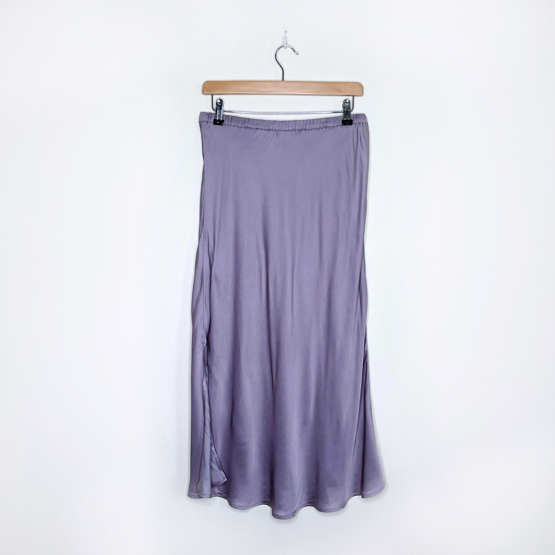 Item Description: A classy, silky-smooth slip skirt from YFB, this midi features a side slit and elastic pull-on waist in a subdued lilac purple. Dress up or down with sneakers and a white ribbed tank. 55% viscose 45% rayon