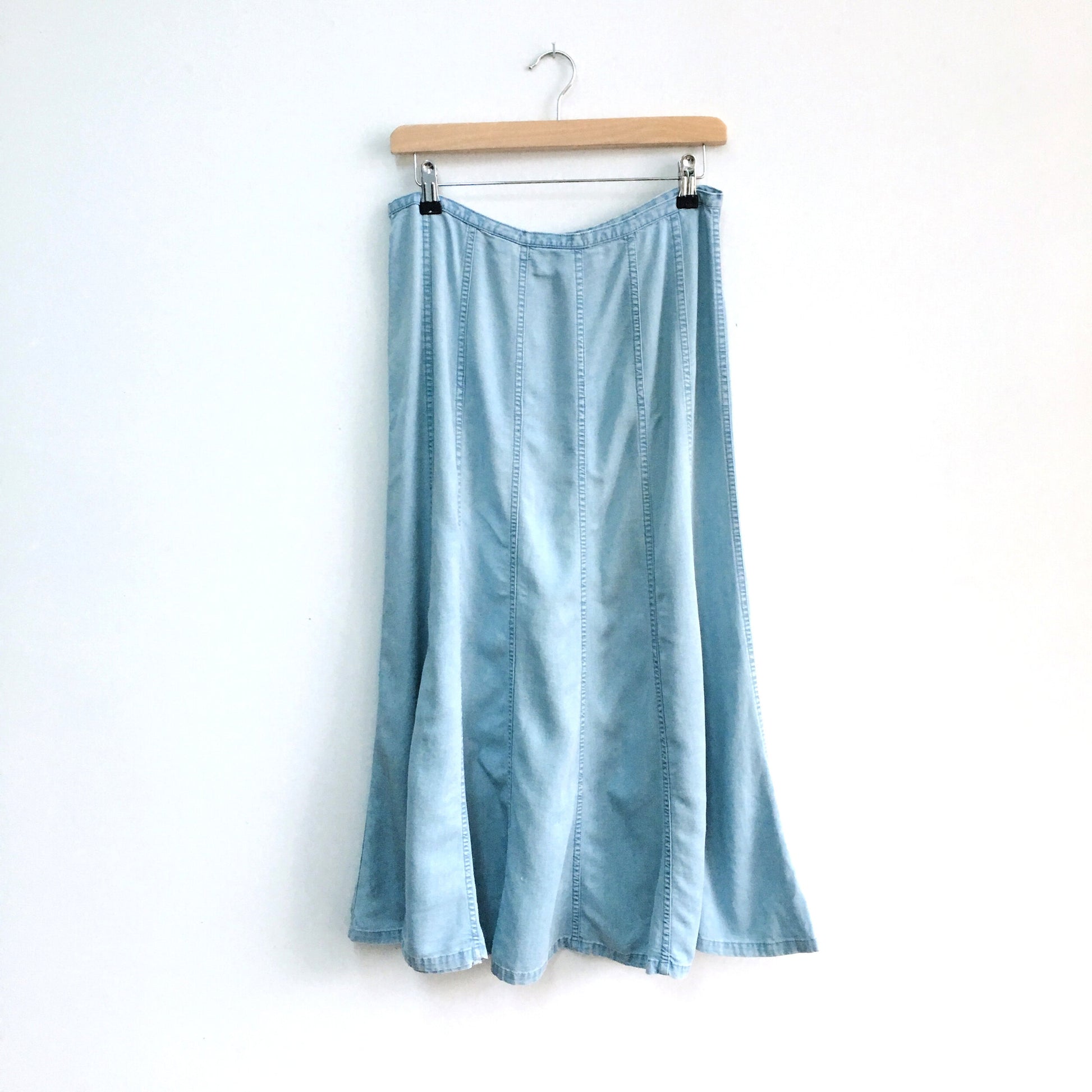Item Description: This vintage chambray skirt features a panelled exterior, with a flare hem and side zipper closure. 44% rayon 39% tencel/lyocell 17% polyester