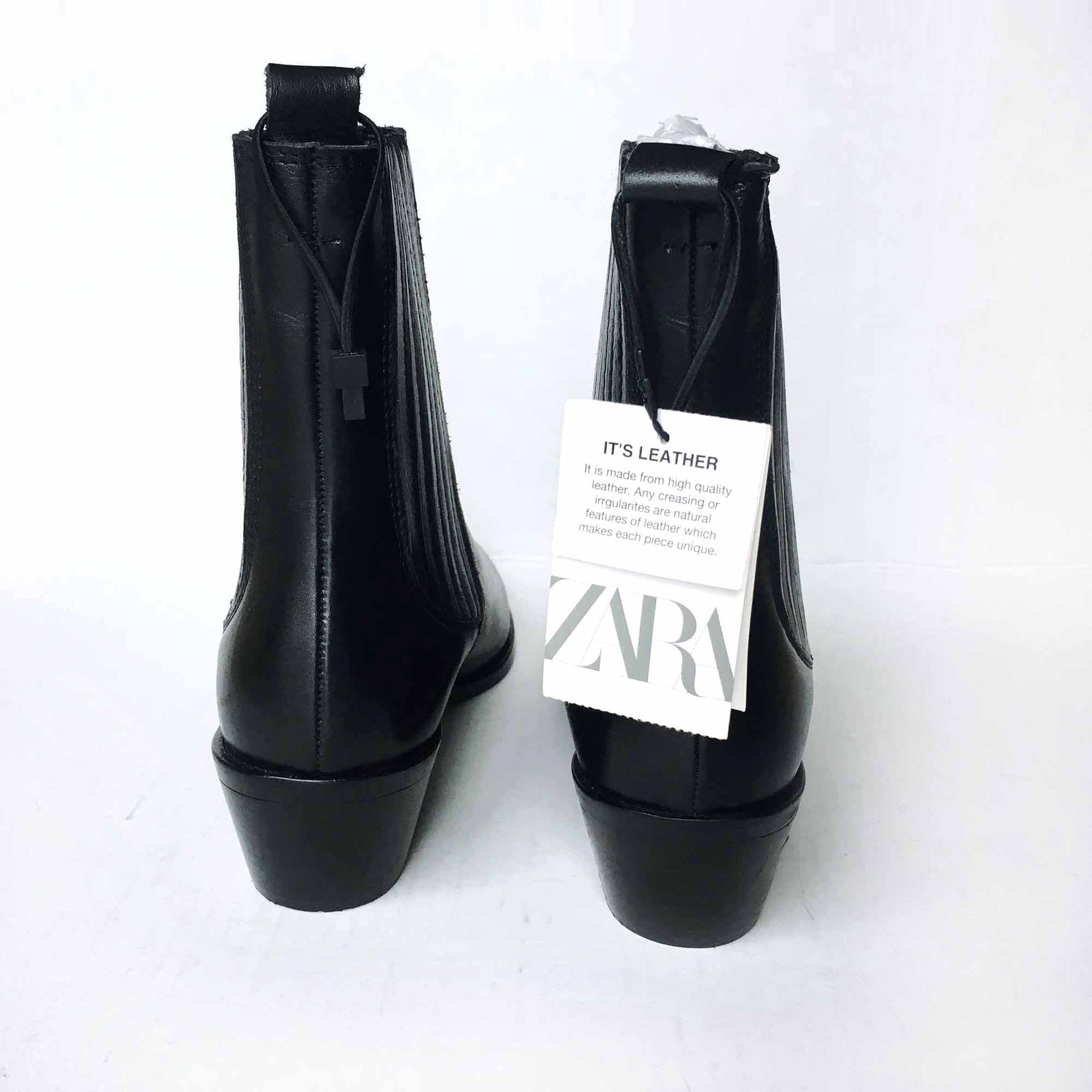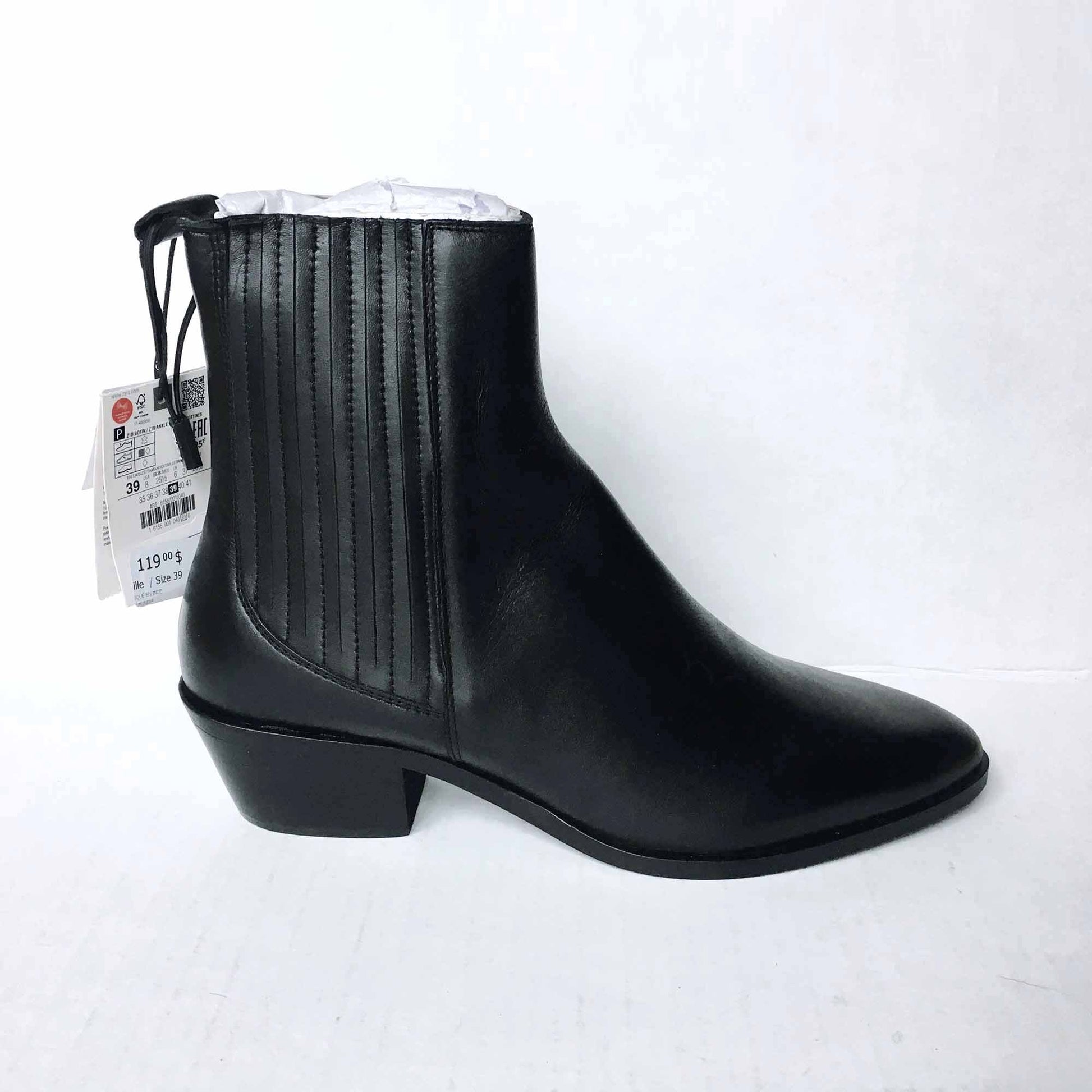 Item Description: These classic leather boots from Zara feature a low stacked heel with stretch sides and pull tab making it easy to slip on. 100% leather upper