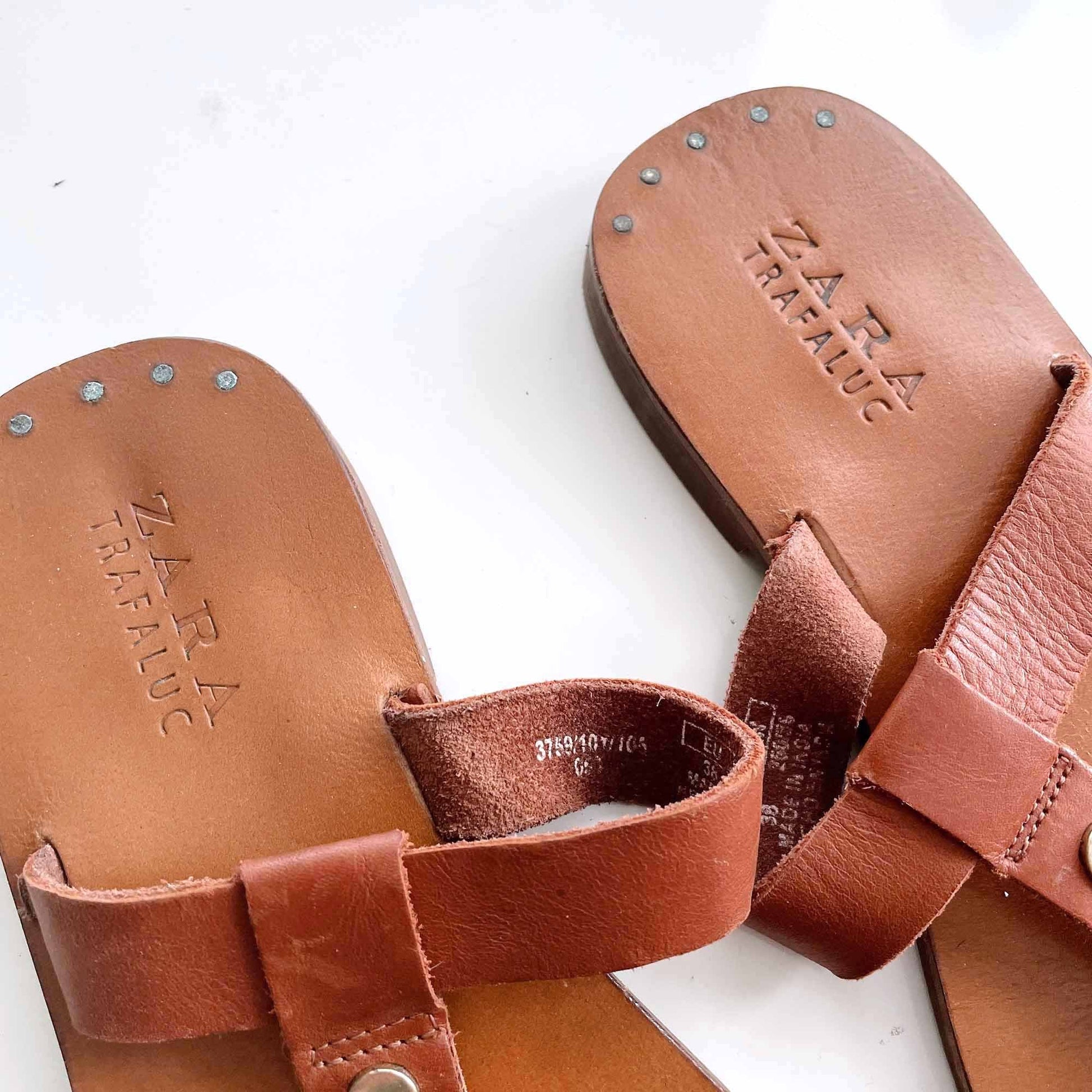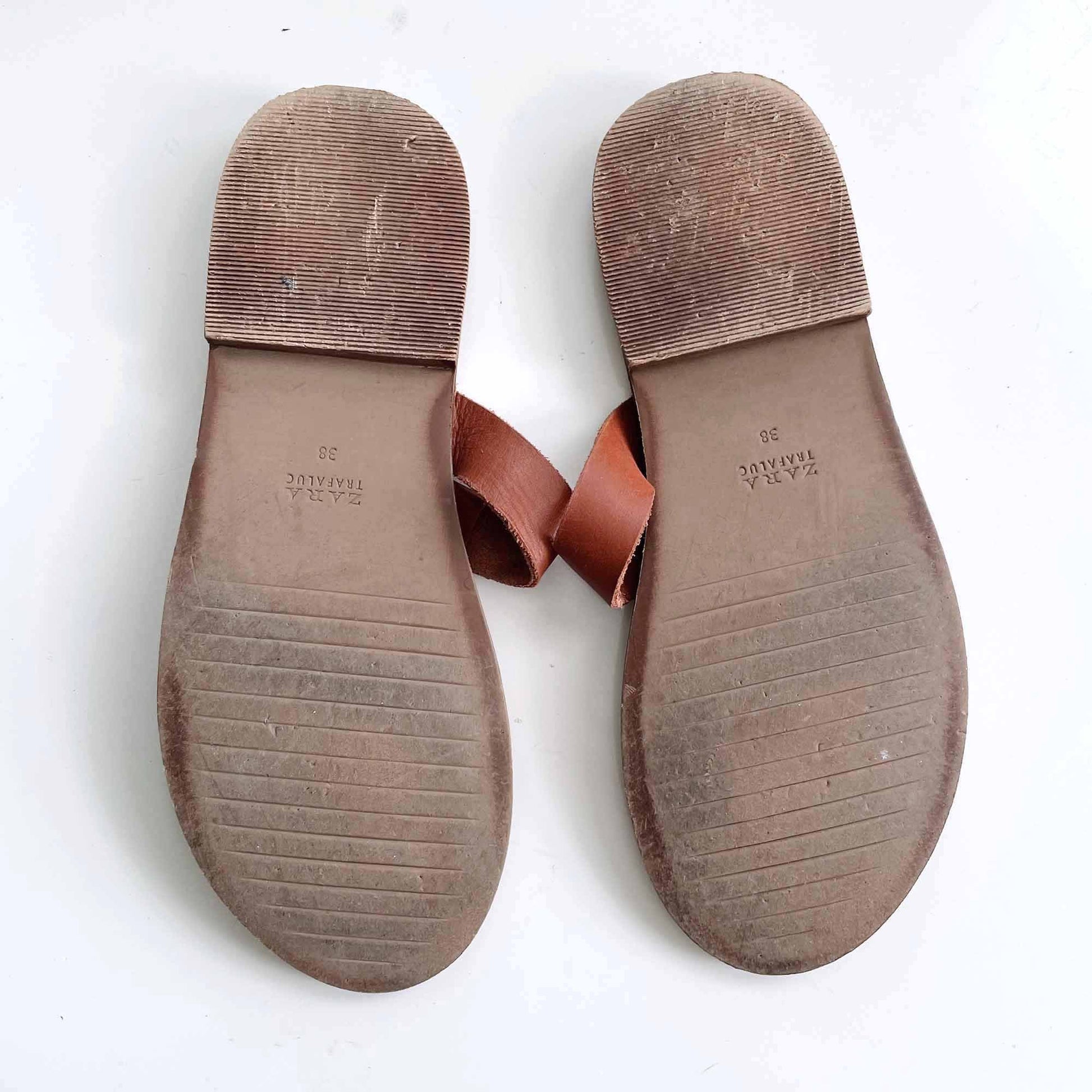 zara cognac leather studded thong sandals - size 38