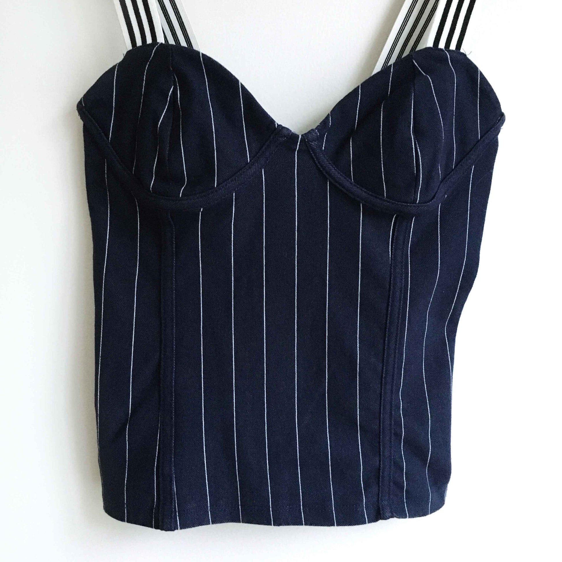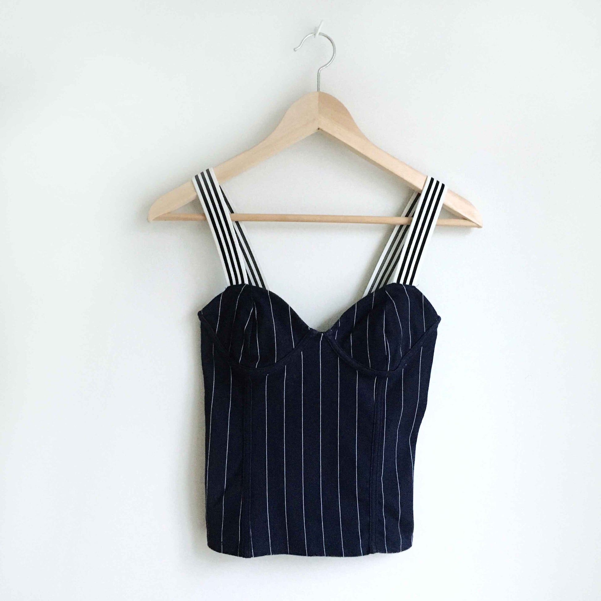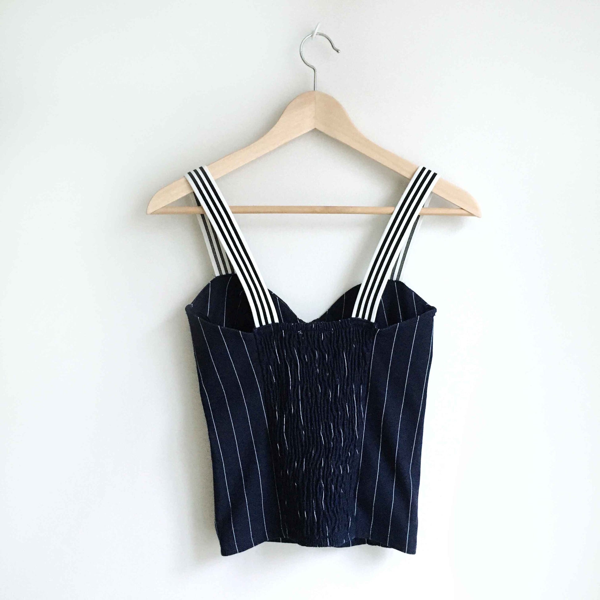Item Description: This form fitting bustier tank from Zara will keep everything up there snug as a bug. Features a pinstripe menswear vibe, with thick elastic stripe shoulders and ruched back. 72% cotton 21% polyester 7% elastane
