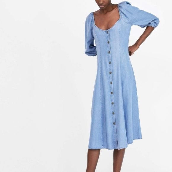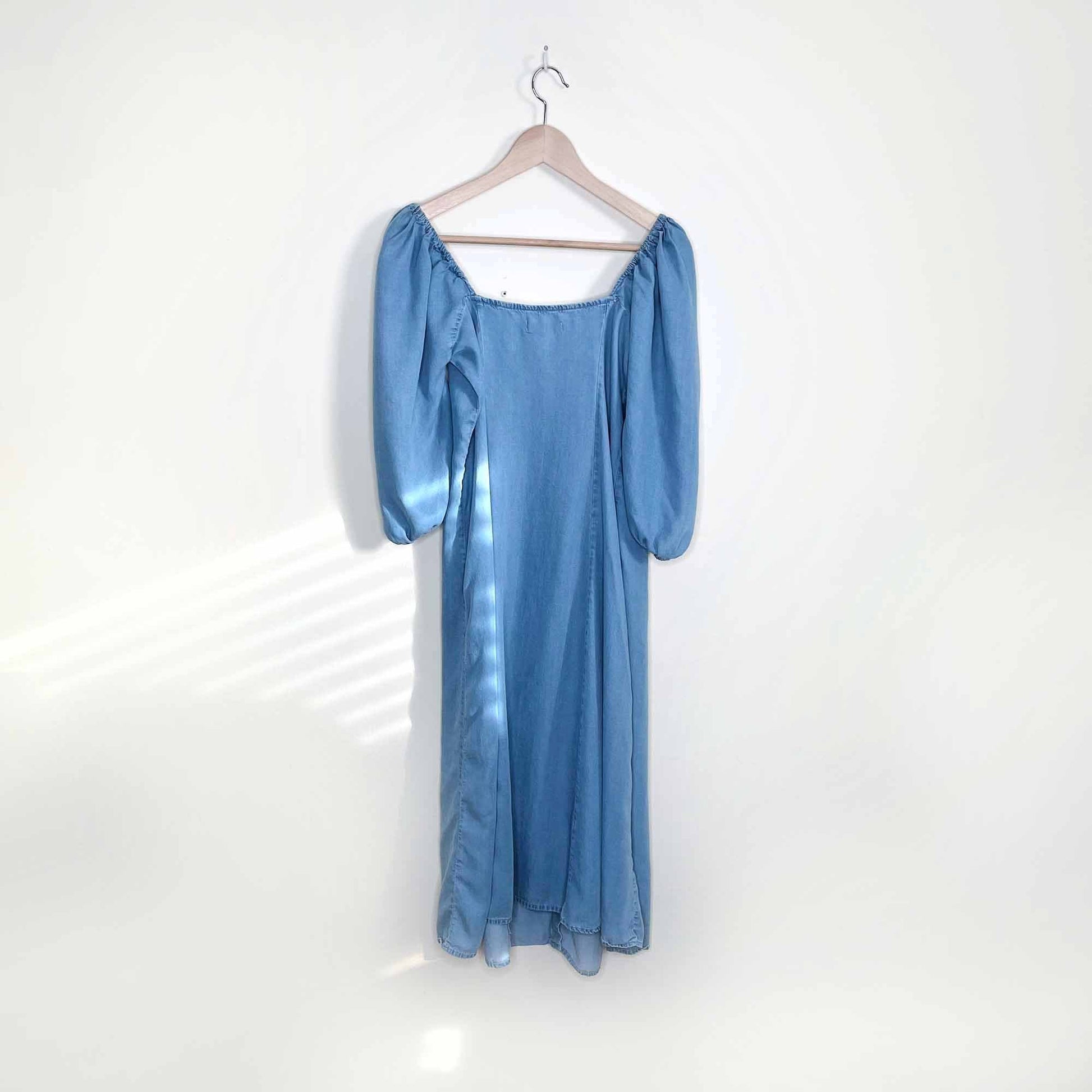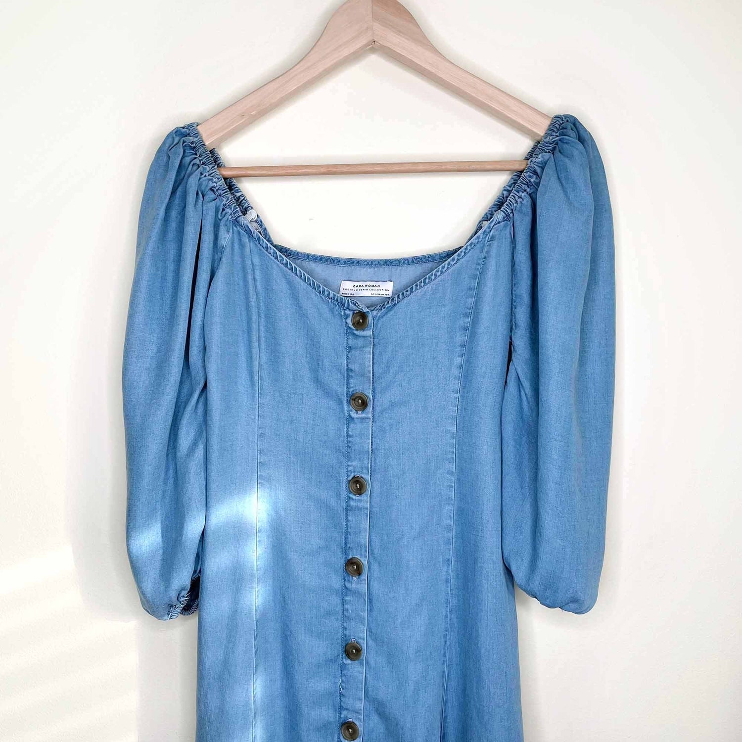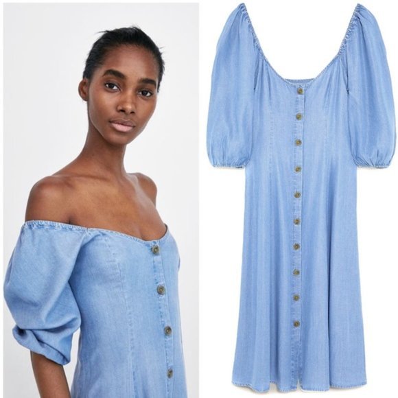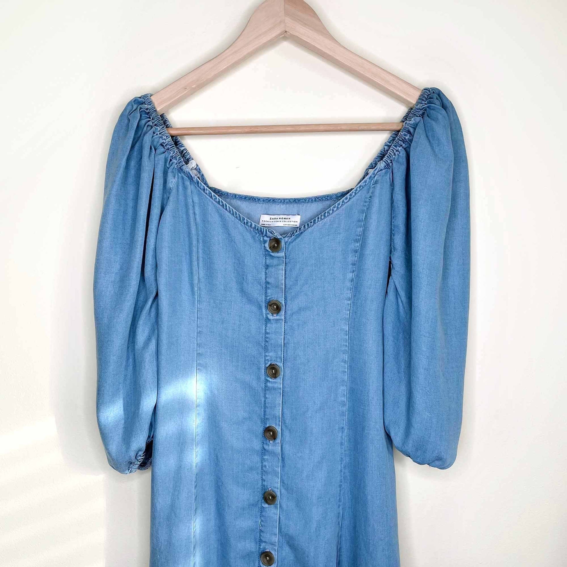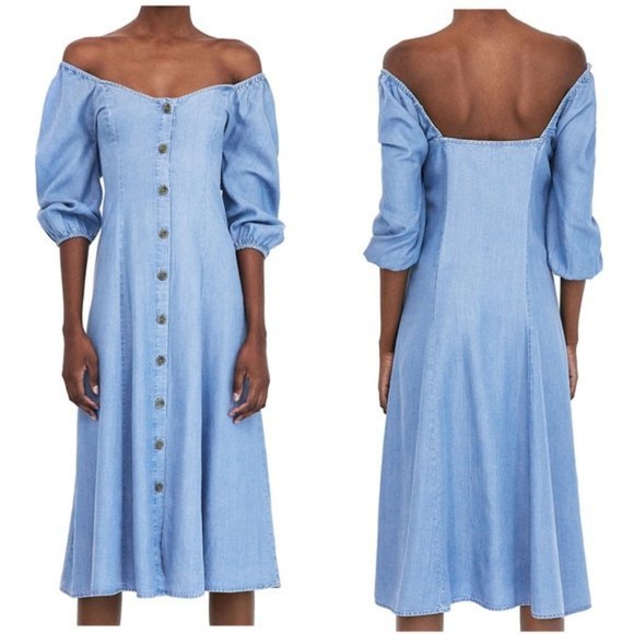 zara premium denim off shoulder button down chambray midi dress - size medium