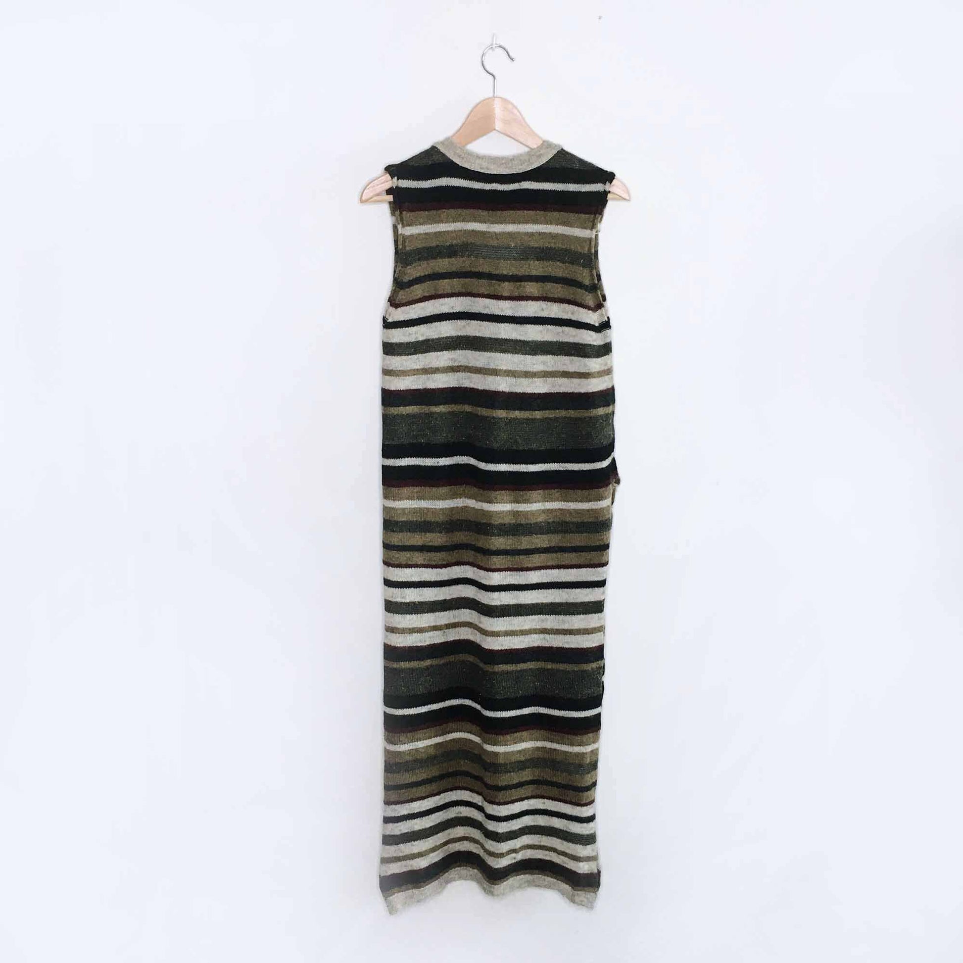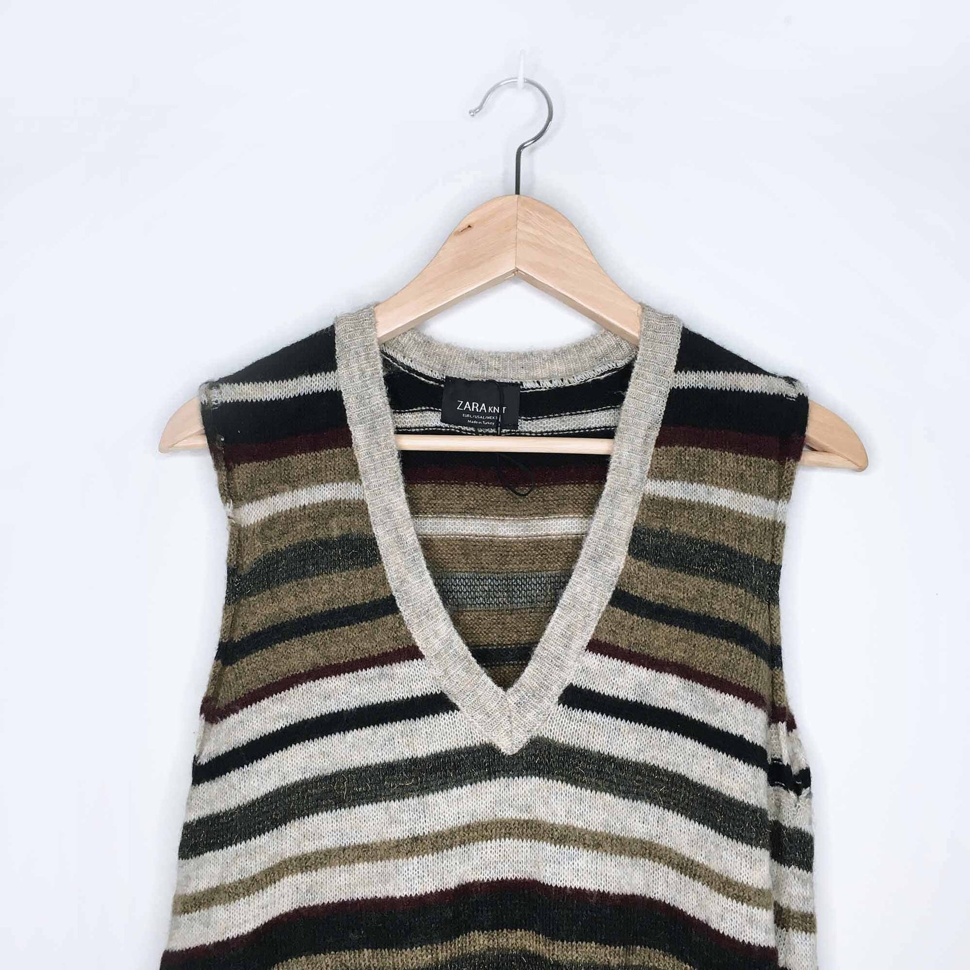 Item Description: This wool-blend striped tunic from Zara features hints of gold metallic thread, in a sleeveless knit with hi lo hem. 58% acrylic 22% polyester 14% wool 6% polyamide